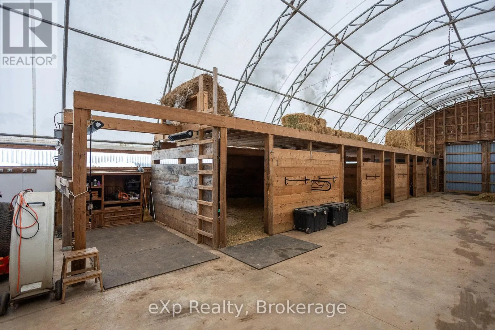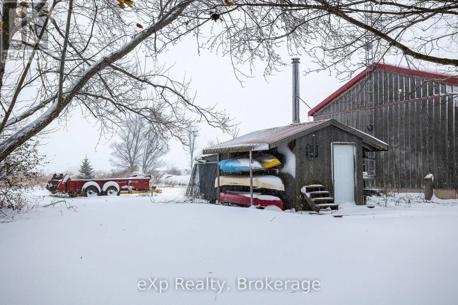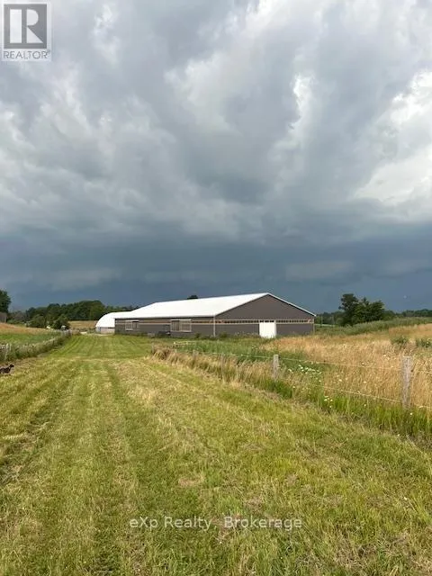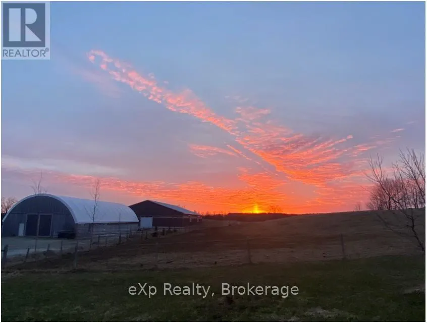 Cross Streets: Grey Road 40. ** Directions: Just south of Grey Road 40 on east side of Grey Rd 12. Step inside this meticulously crafted home on 150 acres, centrally located between Meaford, GreyHighlands, and The Blue Mountains. The interior blends rich textures and thoughtful design, preserving history with custom wood features made from the original farmhouse. A brick-backed fireplace with a classic black wood stove anchors the spacious great room, while the chef's kitchen features bold red cabinetry, a bright blue island, open shelving, a farmhouse sink, and a high-performance professional-style electric range with smooth cooktop, multiple burners, and double ovens. Heated polished concrete floors flow through the living, kitchen, dining, and four-season sunroom, which opens to a private deck perfect for outdoor dining. The primary bedroom is a private retreat with double walk-in closets, access to the covered balcony, and a walk-through to an extra-large office and family room with a second balcony. Three additional bedrooms and one and a half baths provide space for family and guests. An oversized mud/laundry room with built-in storage, large tile shower, and direct access to the two-car garage. Outside, the home blends historic character with modern style, featuring weathered wood siding on the original home paired with a clean-lined contemporary addition. The land includes two large hardwood stands, about 100 acres of open lan, much in hay and suitable for cash cropping, with the balance in pasture, naturally drained soil, and excellent fencing on the front 50 acres. The Rocklyn creek adds more beauty in all seasons as it meanders through the property. A fully insulated, in-floor heated 32x64 shop with 10 kW solar, a 42x92 Coverall barn (2014) with heated tack and feed room, ten 12x12 stalls, oversized aisles, and ample storage, plus a 4-year-old 74x144 riding arena, make this property ideal for agricultural or equestrian pursuits. (id:27476)