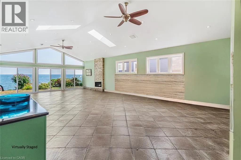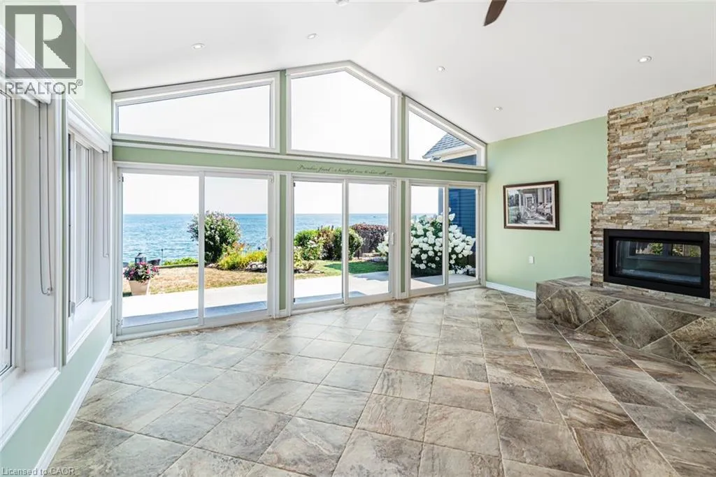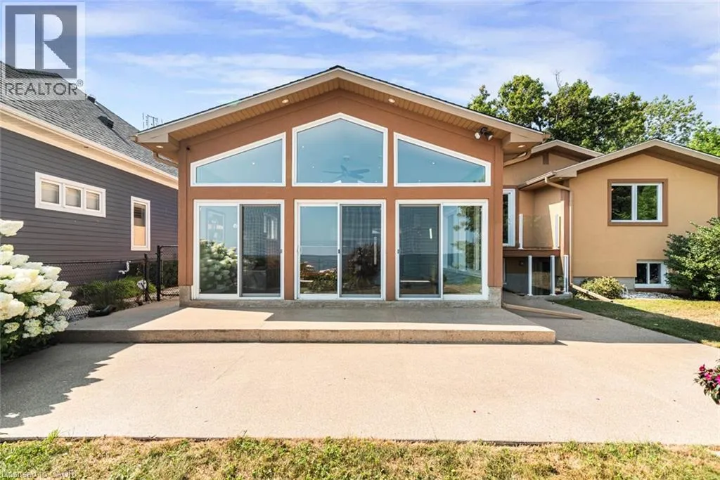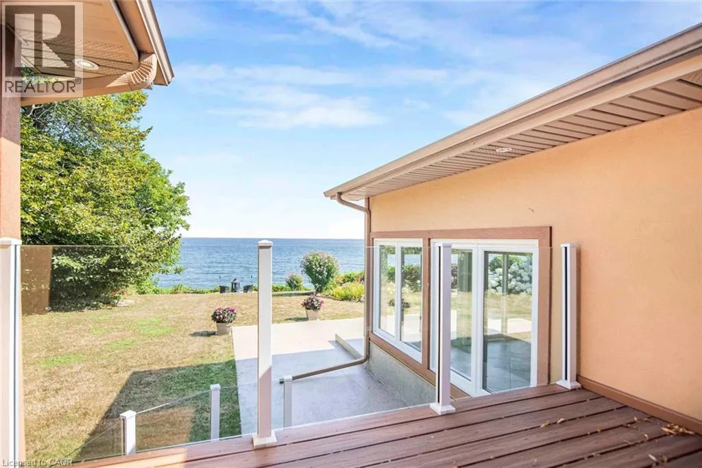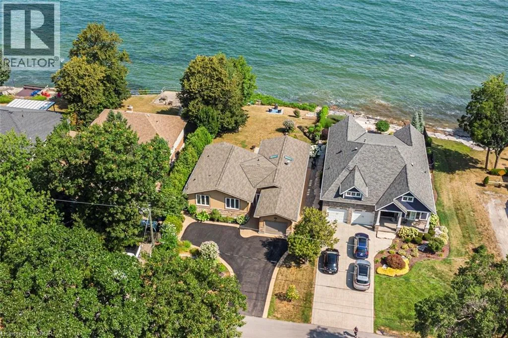 QEW to Christie St to Lakeview Ave to Lakeside Drive Welcome to 38 Lakeside Drive, Grimsby â a raised ranch-style home backing directly onto Lake Ontario. A 2013 addition created a spacious main-floor family room and an oversized single garage. The family room features floor-to-ceiling windows with lake views, a cathedral ceiling with 2 skylights and ceiling fans, a gas fireplace, wet bar, tile floors, and a built-in 14-foot, climate-controlled Arctic swim spa for year-round use. Sliding doors open to a Flex Stone patio (2022) and the deep backyard. The upper level has 2 bedrooms, a 4-piece bathroom with heated floors, linen closet, jetted tub, and a granite counter. The living room has crown moulding, pot lights, and sliding doors to a balcony with composite decking and glass railings overlooking the backyard and lake. The updated eat-in kitchen includes cherrywood cabinets, granite counters, breakfast bar, double sink, south-facing windows, pot lights, pull-out pantry, dining area with display cabinets, and upgraded stainless steel appliances including a gas range with double ovens, built-in microwave, and dishwasher. The lower level, also renovated in 2013, includes 2 additional bedrooms, a 4-piece bathroom with heated floors and linen closet, a rec room, and a large laundry/utility/storage room with cabinetry, shelving, and a second fridge. One bedroom has a walk-up to the backyard. Additional features include: 200 Amp hydro, central vacuum, irrigation system by Water World, Eufy wireless security system with 3 cameras, pot lighting at the front and rear with rear motion detector, leaf guards, oversized garage with inside entry, extra storage, automatic garage door opener with 2 remotes, and two storage sheds. A 10' x 10' sitting area with firepit overlooks the lake, and with Lake Ontario riparian rights, there is potential to add a deck or dock for more direct water access. Peace and privacy, yet close to shopping, parks, schools, and easy highway access. Swim spa can be removed by sellers if preferred. (id:27476)