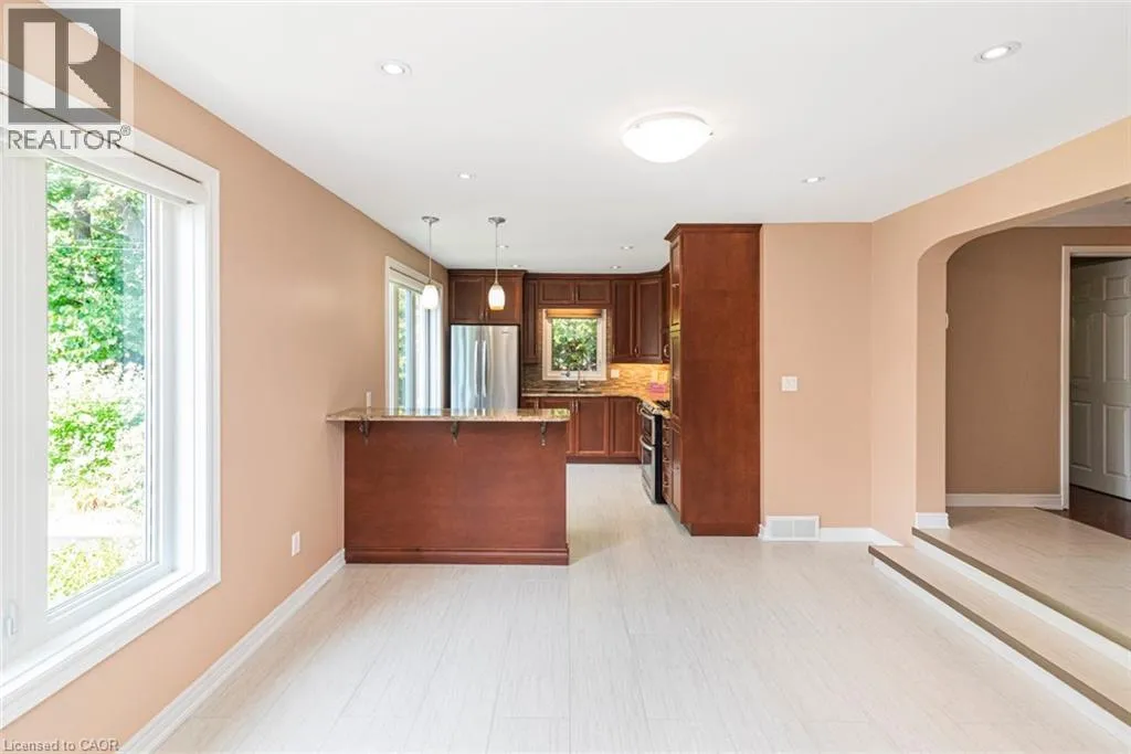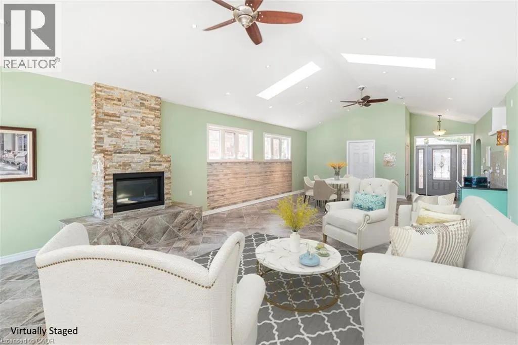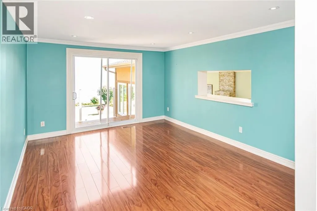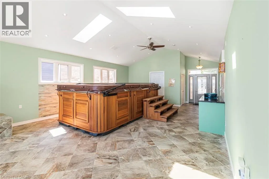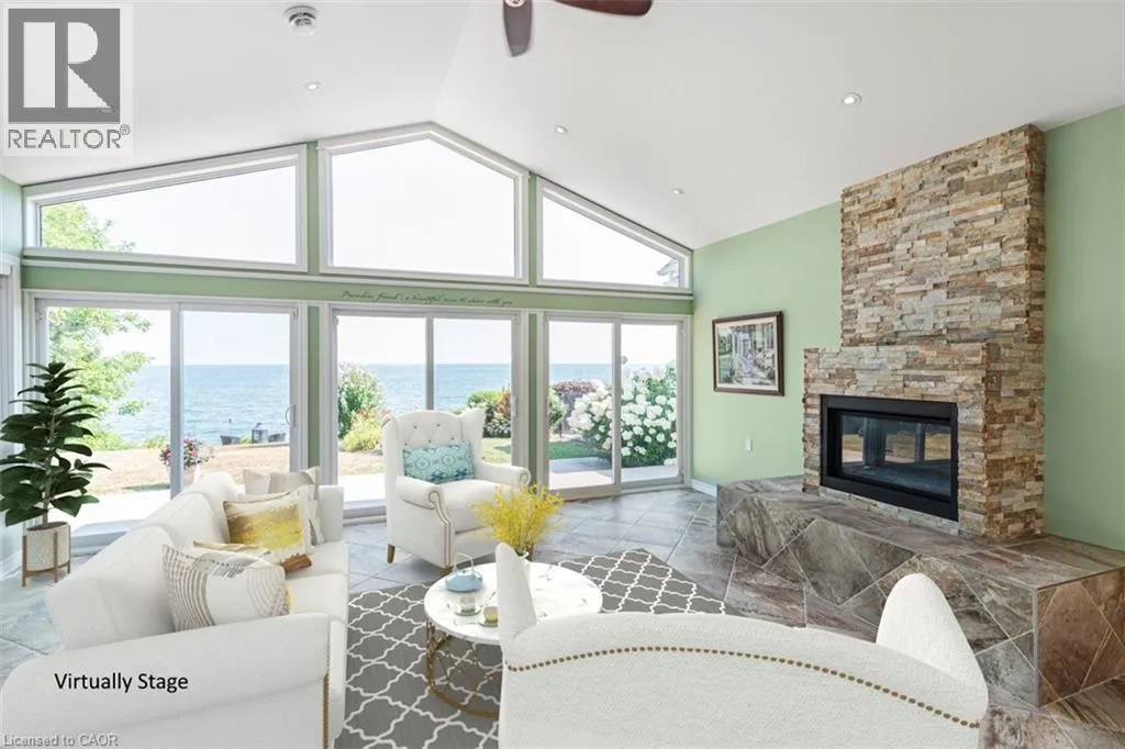 QEW to Christie St to Lakeview Ave to Lakeside Drive Welcome to 38 Lakeside Drive, Grimsby â a raised ranch-style home backing directly onto Lake Ontario. A 2013 addition created a spacious main-floor family room and an oversized single garage. The family room features floor-to-ceiling windows with lake views, a cathedral ceiling with 2 skylights and ceiling fans, a gas fireplace, wet bar, tile floors, and a built-in 14-foot, climate-controlled Arctic swim spa for year-round use. Sliding doors open to a Flex Stone patio (2022) and the deep backyard. The upper level has 2 bedrooms, a 4-piece bathroom with heated floors, linen closet, jetted tub, and a granite counter. The living room has crown moulding, pot lights, and sliding doors to a balcony with composite decking and glass railings overlooking the backyard and lake. The updated eat-in kitchen includes cherrywood cabinets, granite counters, breakfast bar, double sink, south-facing windows, pot lights, pull-out pantry, dining area with display cabinets, and upgraded stainless steel appliances including a gas range with double ovens, built-in microwave, and dishwasher. The lower level, also renovated in 2013, includes 2 additional bedrooms, a 4-piece bathroom with heated floors and linen closet, a rec room, and a large laundry/utility/storage room with cabinetry, shelving, and a second fridge. One bedroom has a walk-up to the backyard. Additional features include: 200 Amp hydro, central vacuum, irrigation system by Water World, Eufy wireless security system with 3 cameras, pot lighting at the front and rear with rear motion detector, leaf guards, oversized garage with inside entry, extra storage, automatic garage door opener with 2 remotes, and two storage sheds. A 10' x 10' sitting area with firepit overlooks the lake, and with Lake Ontario riparian rights, there is potential to add a deck or dock for more direct water access. Peace and privacy, yet close to shopping, parks, schools, and easy highway access. Swim spa can be removed by sellers if preferred. (id:27476)