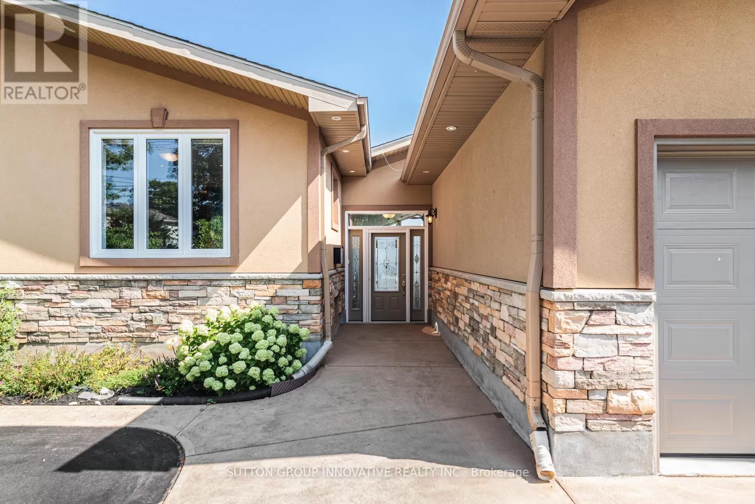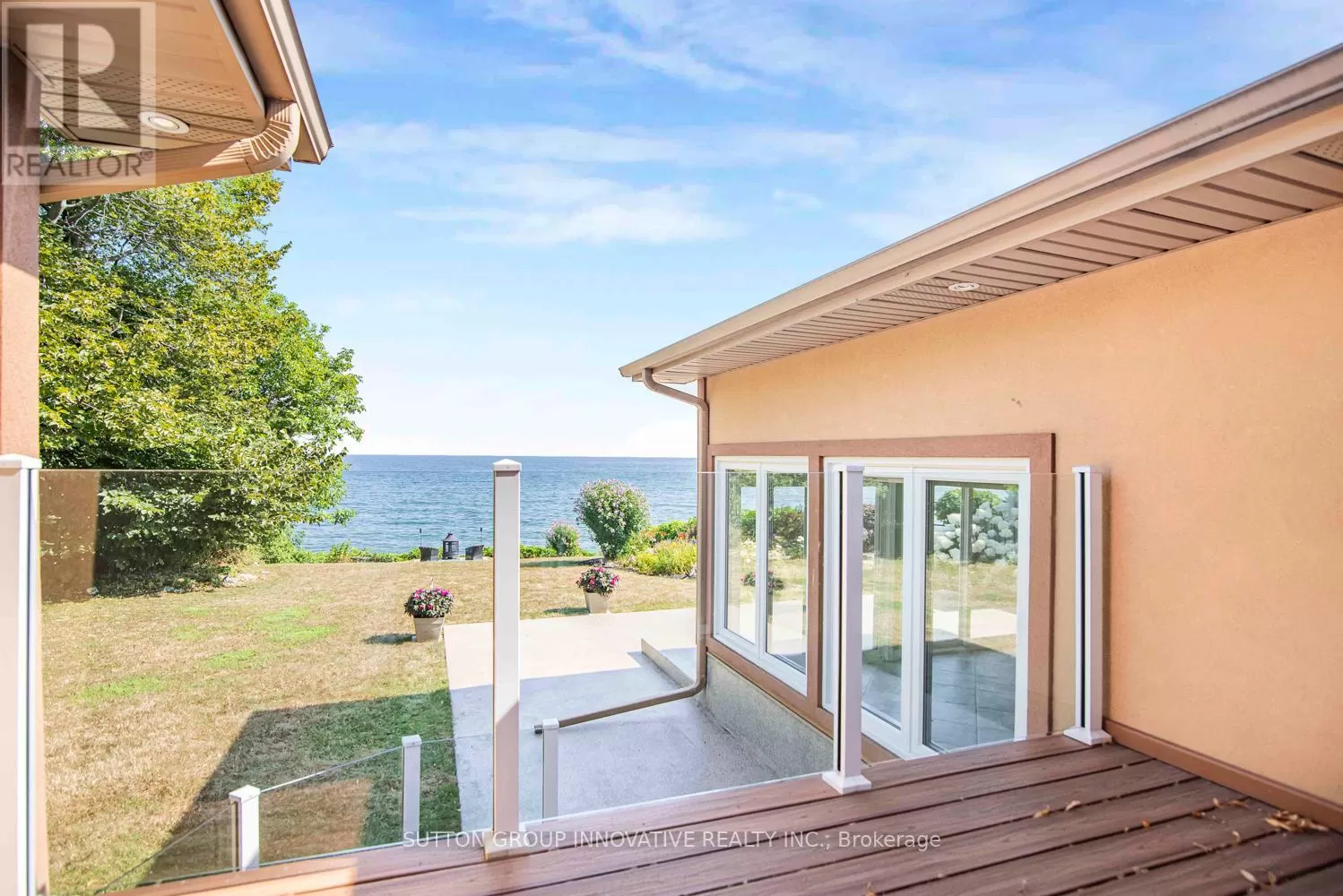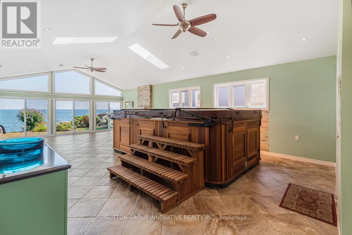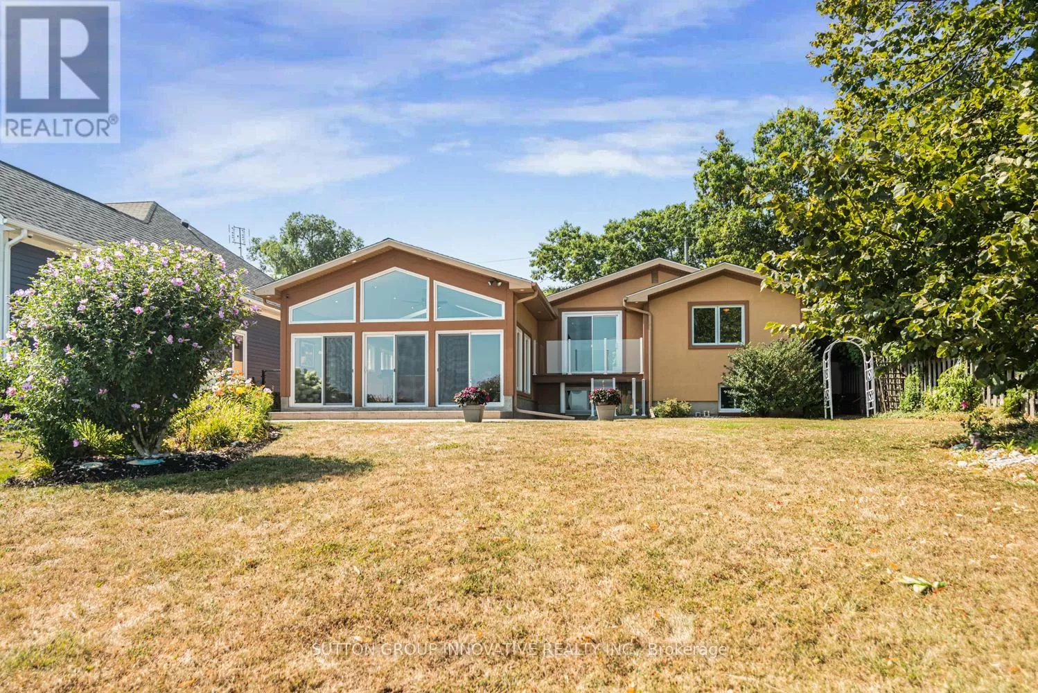 Cross Streets: Christie/Lakeview. ** Directions: QEW Niagara to Christie St to Lakeview Av to Lakeside Drive. Welcome to 38 Lakeside Drive, Grimsby a raised ranch-style home backing directly onto Lake Ontario. A 2013 addition created a spacious main-floor family room and an oversized single garage. The family room features floor-to-ceiling windows with lake views, a cathedral ceiling with 2 skylights and ceiling fans, a gas fireplace, wet bar, tile floors, and a built-in14-foot, climate-controlled Arctic swim spa for year-round use. Sliding doors open to a Flex Stone patio (2022) and the deep backyard. The upper level has 2 bedrooms, a 4-piece bathroom with heated floors, linen closet, jetted tub, and a granite counter. The living room has crown moulding, pot lights, and sliding doors to a balcony with composite decking and glass railings overlooking the backyard and lake. The updated eat-in kitchen includes cherrywood cabinets, granite counters, breakfast bar, double sink, south-facing windows, pot lights, pull-out pantry, dining area with display cabinets, and upgraded stainless steel appliances including a gas range with double ovens, built-in microwave, and dishwasher. The lower level, also renovated in 2013, includes 2 additional bedrooms, a 4-piece bathroom with heated floors and linen closet, a rec room, and a large laundry/utility/storage room with cabinetry, shelving, and a second fridge. One bedroom has a walk-up to the backyard. Additional features include:200 Amp hydro, central vacuum, irrigation system by Water World, Eufy wireless security system with 3 cameras, pot lighting at the front and rear with rear motion detector, leaf guards, oversized garage with inside entry, extra storage, automatic garage door opener with 2 remotes, and two storage sheds. A 10' x 10' sitting area with firepit overlooks the lake, and with Lake Ontario riparian rights, there is potential to add a deck or dock for more direct water access. Peace and privacy, yet close to shopping, parks, schools, and easy highway access. Swim spa can be removed by sellers if preferred. (id:27476)