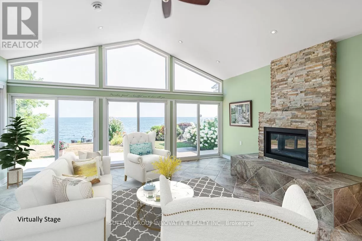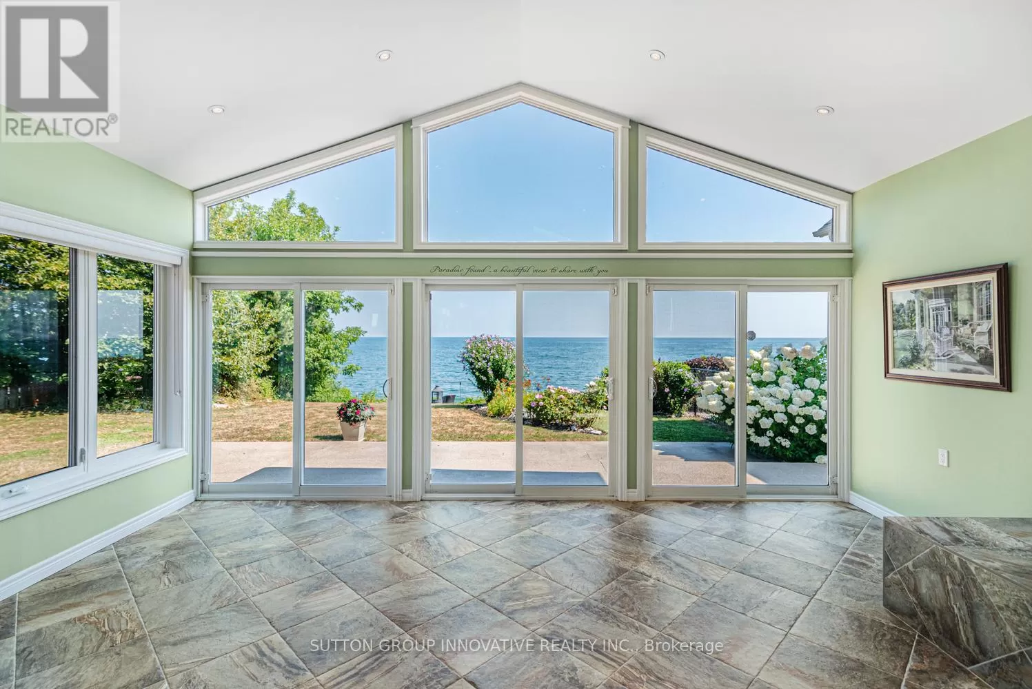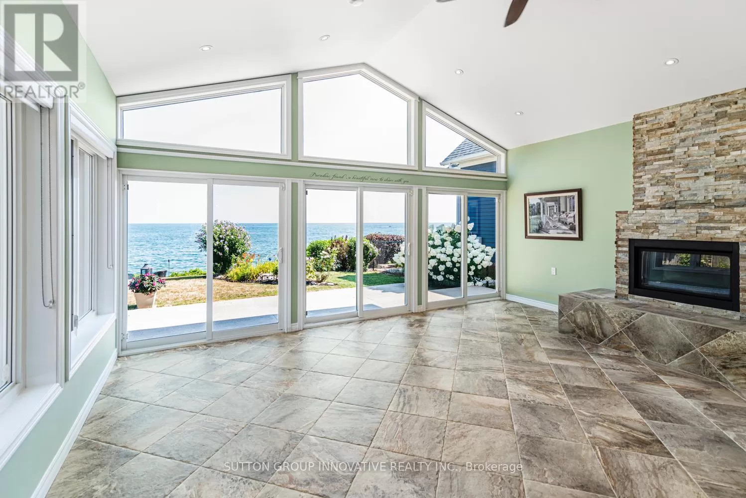 Cross Streets: Christie/Lakeview. ** Directions: QEW Niagara to Christie St to Lakeview Av to Lakeside Drive. Welcome to 38 Lakeside Drive, Grimsby a raised ranch-style home backing directly onto Lake Ontario. A 2013 addition created a spacious main-floor family room and an oversized single garage. The family room features floor-to-ceiling windows with lake views, a cathedral ceiling with 2 skylights and ceiling fans, a gas fireplace, wet bar, tile floors, and a built-in14-foot, climate-controlled Arctic swim spa for year-round use. Sliding doors open to a Flex Stone patio (2022) and the deep backyard. The upper level has 2 bedrooms, a 4-piece bathroom with heated floors, linen closet, jetted tub, and a granite counter. The living room has crown moulding, pot lights, and sliding doors to a balcony with composite decking and glass railings overlooking the backyard and lake. The updated eat-in kitchen includes cherrywood cabinets, granite counters, breakfast bar, double sink, south-facing windows, pot lights, pull-out pantry, dining area with display cabinets, and upgraded stainless steel appliances including a gas range with double ovens, built-in microwave, and dishwasher. The lower level, also renovated in 2013, includes 2 additional bedrooms, a 4-piece bathroom with heated floors and linen closet, a rec room, and a large laundry/utility/storage room with cabinetry, shelving, and a second fridge. One bedroom has a walk-up to the backyard. Additional features include:200 Amp hydro, central vacuum, irrigation system by Water World, Eufy wireless security system with 3 cameras, pot lighting at the front and rear with rear motion detector, leaf guards, oversized garage with inside entry, extra storage, automatic garage door opener with 2 remotes, and two storage sheds. A 10' x 10' sitting area with firepit overlooks the lake, and with Lake Ontario riparian rights, there is potential to add a deck or dock for more direct water access. Peace and privacy, yet close to shopping, parks, schools, and easy highway access. Swim spa can be removed by sellers if preferred. (id:27476)