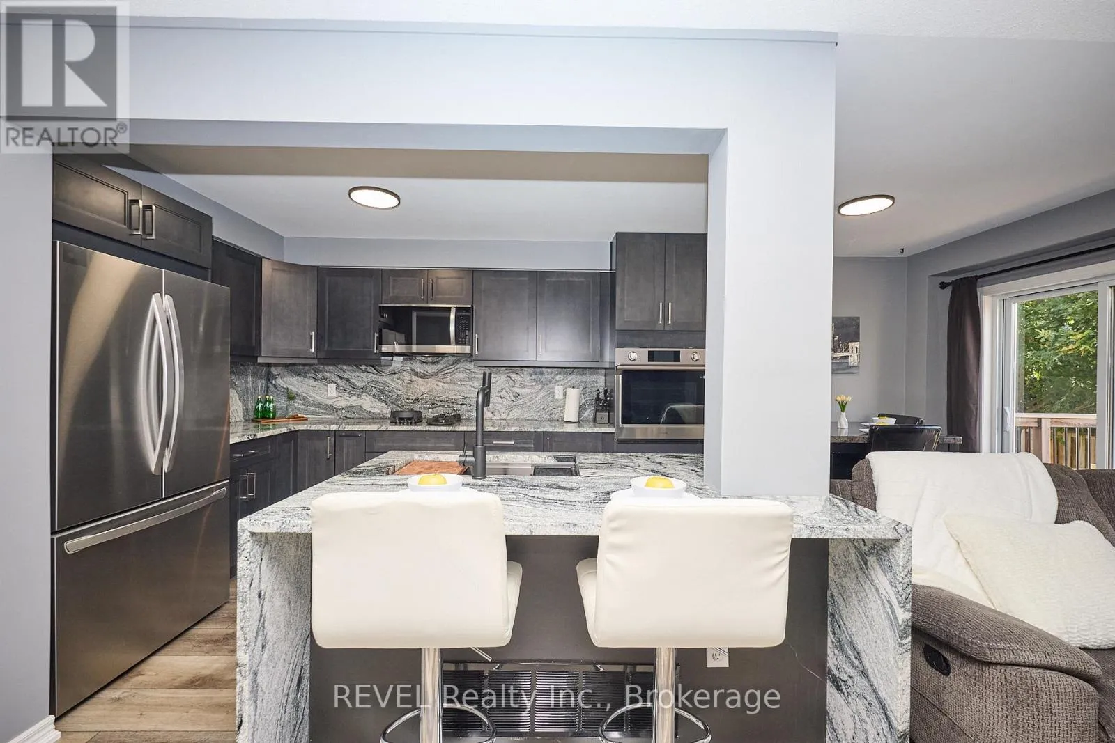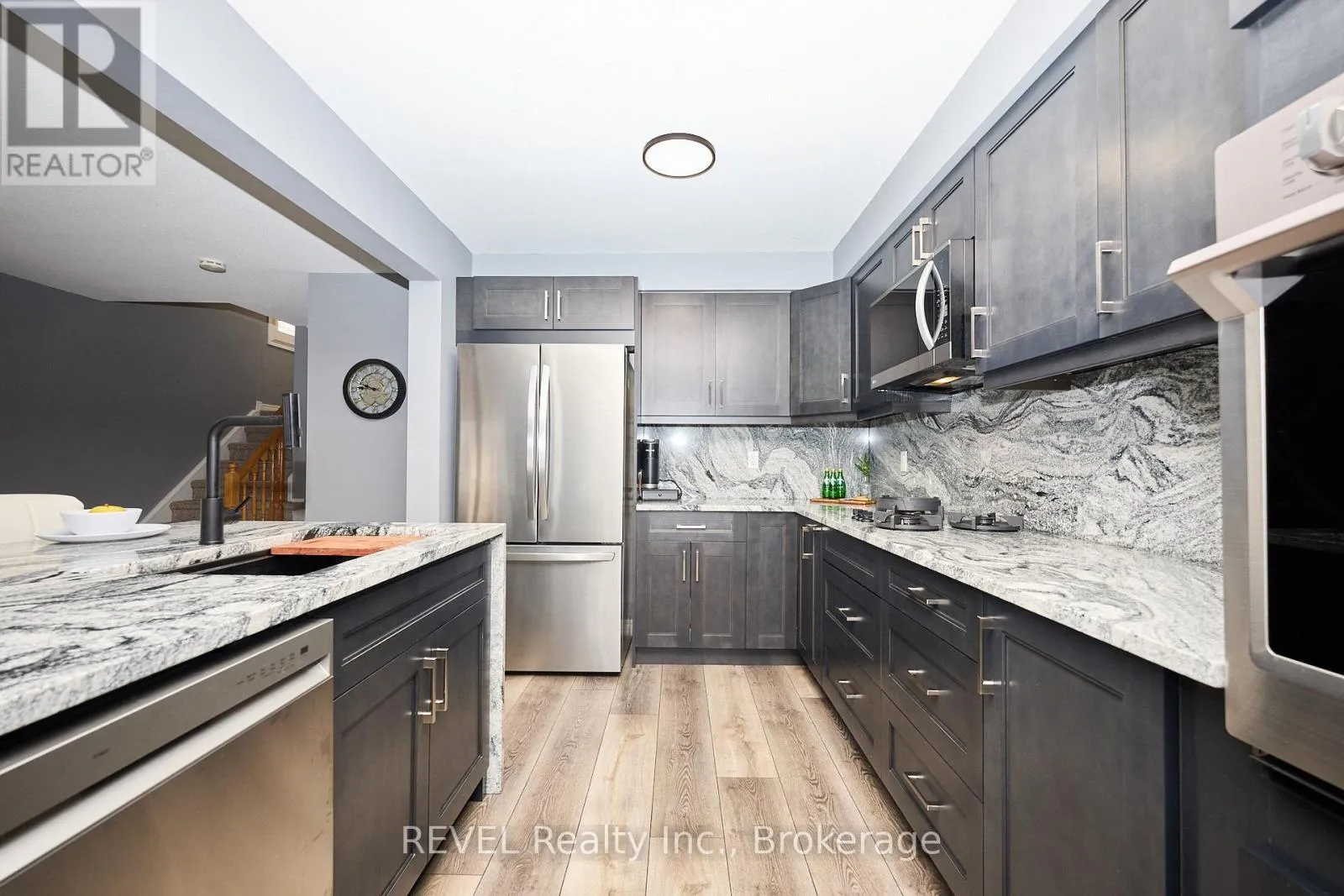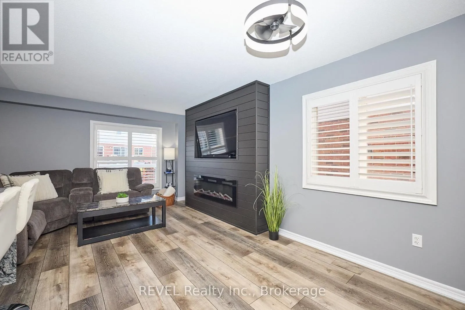 Cross Streets: Main & Chardonnay. ** Directions: South on Bartlett Ave off the QEW, Left on Main St E. Beautifully Updated 2-Storey Townhome in Grimsby! Step into this stylish, move-in ready home where modern updates meet everyday convenience. The open-concept main floor is designed for both comfort and entertaining, featuring a spacious living room with custom feature wall encompassing a built in electric fireplace, and TV space. Main floor also features an eat-in kitchen with granite counters, a stunning waterfall island, custom built-in PITT gas stovetop, built-in range, and soft-close cabinetry. California shutters throughout add elegance, while sliding doors lead to a private, fully fenced yard with patio. Upstairs, retreat to a generous primary suite with an ensuite featuring a beautiful custom shower. Upstairs is complimented by two additional bedrooms, a 4-piece bath, and a convenient laundry area with tub. The finished basement extends your living space with a cozy family room and plenty of storage. Enjoy the practicality of an attached 1.5-car garage with a side-mount door opener and direct walkout to the backyard. The only shared wall is within the garage. No living spaces are attached, offering the privacy and comfort of a detached home. Every detail has been thoughtfully designed with high-end finishes, making this home an absolute must-see in Grimsby. (id:27476)