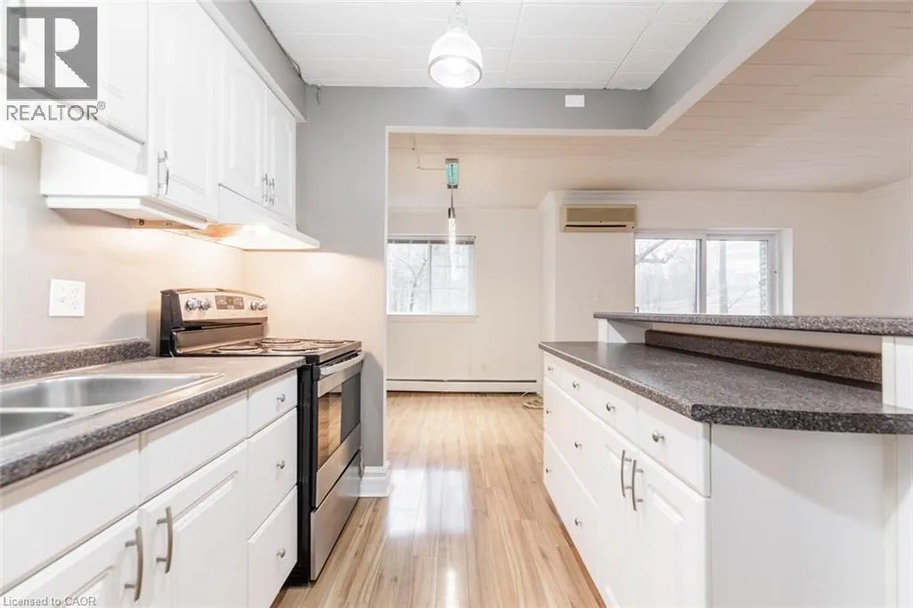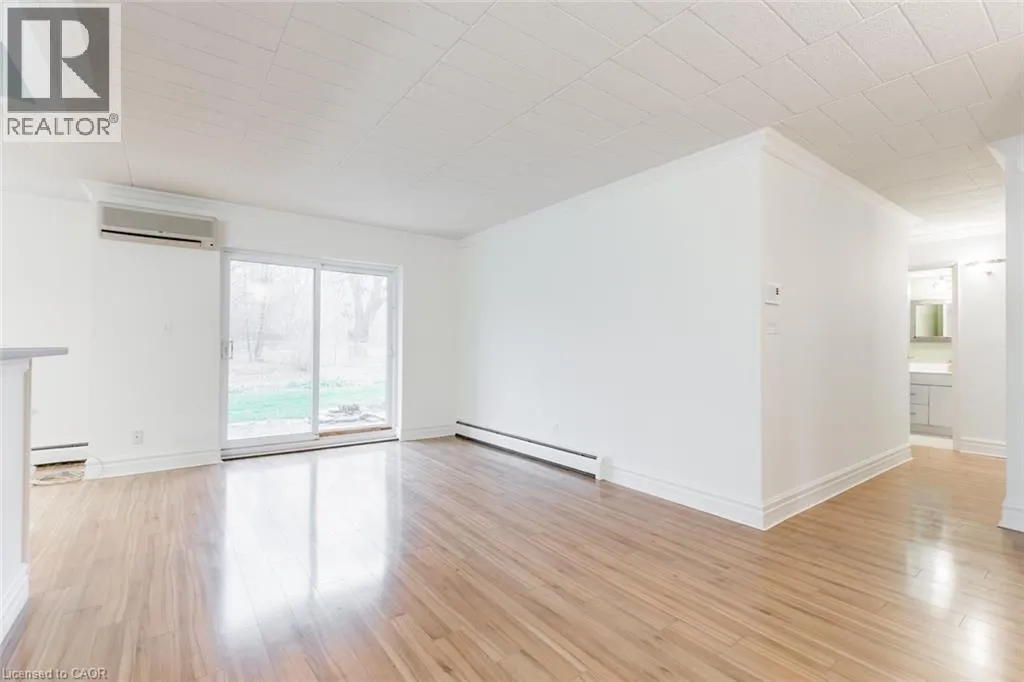 Main St E to Ontario St or Robinson St N. BEST LOCATION IN THE BUILDING! This 2 bedroom main floor condo has lovely views of garden and trees. Very quiet. One parking spot just outside the sliding doors. A well maintained, 3-storey building, is nestled on a quiet street with a short walk to the downtown. When entering, you are greeted with soft neutral decor and lots of natural light. Very open concept featuring Living Room, Dining Room and Kitchen separated by an island with updated kitchen cabinets and all appliances included. The Living Room has sliding doors that lead to the patio and the peaceful gardens and trees. Lovely laminate floor throughout the whole unit, no carpet. Down the hallway is the in-suite laundry, washer and dryer included. 4 pce updated bathroom. Brand new AC. Large master bedroom with large window. 2nd bedroom is great for den or home office. This unit has no disappointments, it's move in ready. (id:27476)