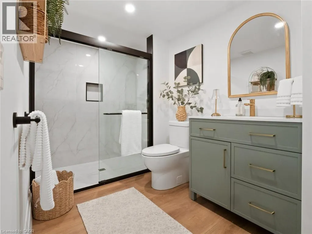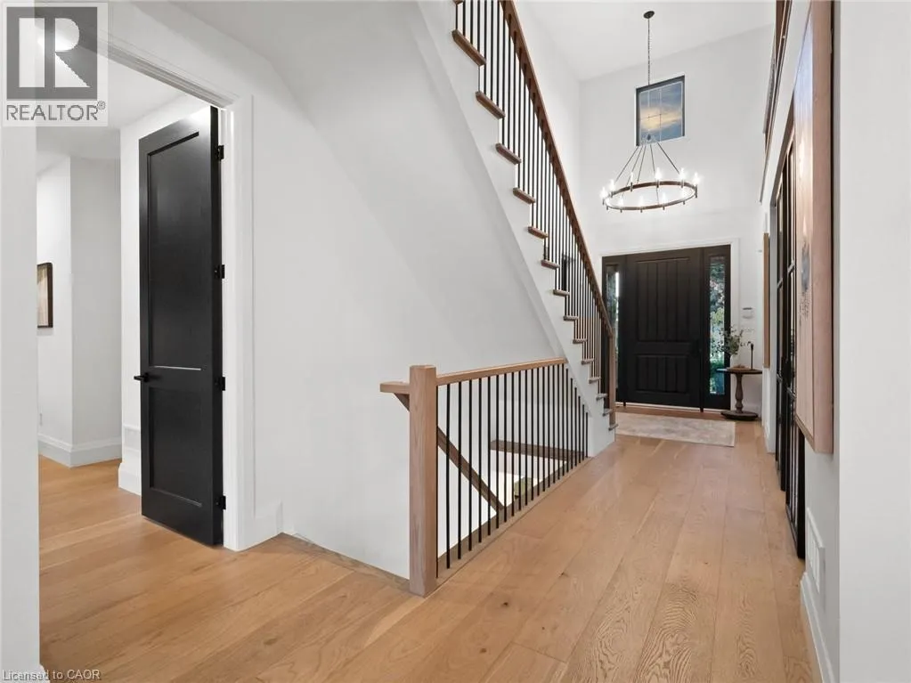 QEW to Bartlett, Right on Central Ave, House on Right side. Welcome to your dream home â a custom-built bungaloft that blends timeless craftsmanship with modern luxury. Nestled beneath the Niagara Escarpment, this home makes a lasting impression with its landscaped lot, post-and-beam porch, and striking stone accents. Inside, 9-foot ceilings and wide-plank hardwood floors set the tone for open, elegant living. The great room boasts 12-foot vaulted ceilings with Douglas fir beams, a two-sided glass fireplace, and a 16-foot sliding wall opening to a backyard oasis. The gourmet kitchen features solid maple cabinetry, quartz counters, paneled appliances, a farmhouse sink, pot filler, and a large island perfect for gathering. The primary suite offers a cathedral ceiling and a spa-like ensuite with heated porcelain floors, double vanities, and a freestanding tub. Upstairs, a bright loft overlooks the great room, while the finished lower level includes two bedrooms and a bath. Outdoors, enjoy a covered porch with fireplace, manicured landscaping, and a separate garage with workshop. Built to the highest standardsâwith Wi-Fi blinds, tankless water heater, and solid-core doorsâthis five-bedroom, four-bath home pairs modern comfort with timeless design. A rare opportunity to own a home where every detail reflects beauty, quality, and lasting value. (id:27476)