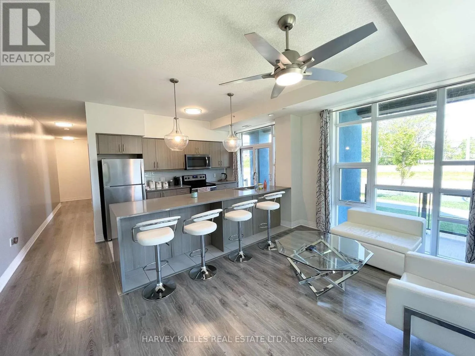 North Service Rd / Windward Dr Luxury Lakeside Living Awaits! Welcome to Aquablu Lakeshore Condominiums in the heart of Grimsby on the Lake, where sophistication meets waterfront serenity. Just steps from the sparkling shores of Lake Ontario, this suite offers an elevated lifestyle with designer finishes and modern elegance throughout. Experience open-concept living at its finest with a spacious living, dining, and kitchen area featuring brand-new, carpet-free flooring throughout. The modern kitchen showcases luxury upgrades, including an oversized quartz waterfall island, stainless steel appliances, custom cabinetry, contemporary light fixtures, and sleek retractable ceiling fans, every detail thoughtfully curated for style and comfort. From the living room and kitchen, step out to the expansive wraparound terrace, perfect for morning coffee or evening entertaining, with seamless access through sliding glass doors. Enjoy the convenience of ensuite laundry, designed to complement your modern lifestyle. This spacious 2-bedroom, 2-bathroom residence features a private 3-piece ensuite in the primary bedroom and a 4-piece bath with direct access from the second bedroom. Both bedrooms boast floor-to-ceiling windows, flooding the space with natural light and offering captivating views. Building amenities include a fully equipped fitness center, luxury party room with bar and fireplace, study/meeting room, and a rooftop patio with BBQs and panoramic lake views. Enjoy quick access to Grimsby on the Lake, restaurants, scenic pathways, and the waterfront. Located within walking distance to Grimsby on the Lake's waterfront trails, boutique shops, and fine dining, this residence offers the perfect balance of luxury, convenience, and leisure. (id:27476)