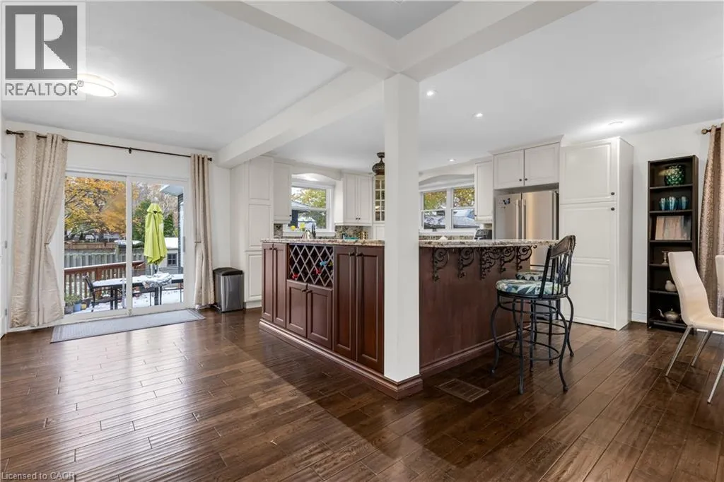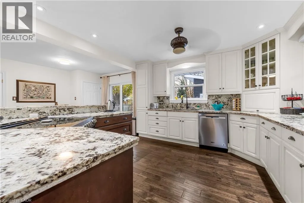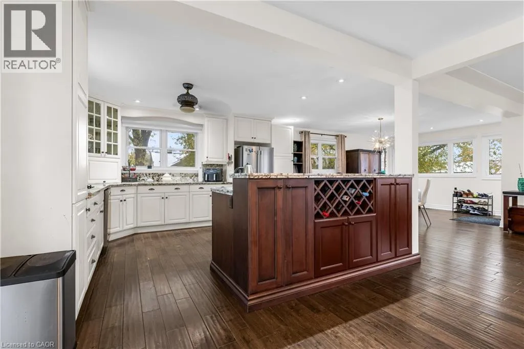 Lakeside Drive between Fairview and Whittaker This special property is truly one of a kind. Uniquely situated, it offers the best views in town NOT on the water. Sitting on your front porch or simply walking out your front door, you and your guests are greeted with the tranquil serenade of the gentle waves of Lake Ontario. This bungalow is perfect for families of all ages, both younger and older, with modern attributes such as updated open concept kitchen, powder room, 4 piece bathroom and main floor laundry creatively nestled in the centre of the home amongst the 3 main floor bedrooms. The basement features a kichenette, 3 piece bath and a gas fireplace for relaxation, or for teen / in-law retreat. Many big ticket updates have been completed including 200 amp service (2023), roof (2022), furnace & heat pump (2023), stove (2025), dishwasher (2022), washer/dryer (2021), convenient kitchen organizers and pull outs (2021). The fully fenced back yard is family ready AND pool sized with incredible 3 season, heated and cooled, bunkie, flex space to explore. Lakeside drive is one of the most peaceful, serene streets in Grimsby and a favourite walking destination for locals. This one of a kind home is ready to move in and enjoy life by the shores of Lake Ontario. (id:27476)