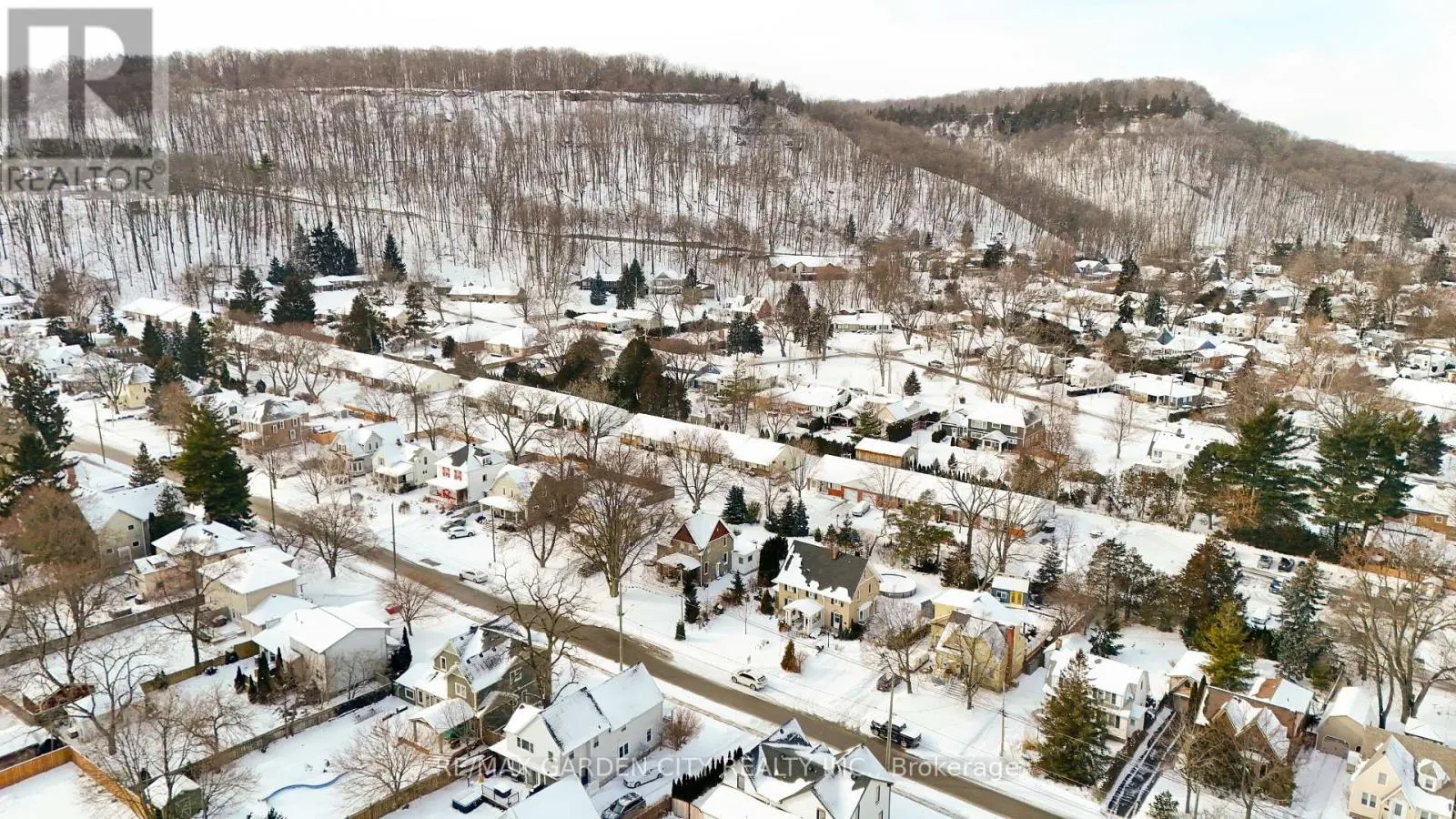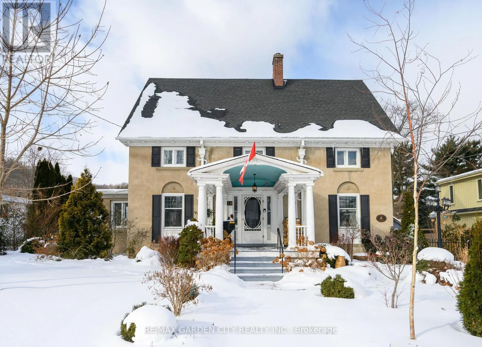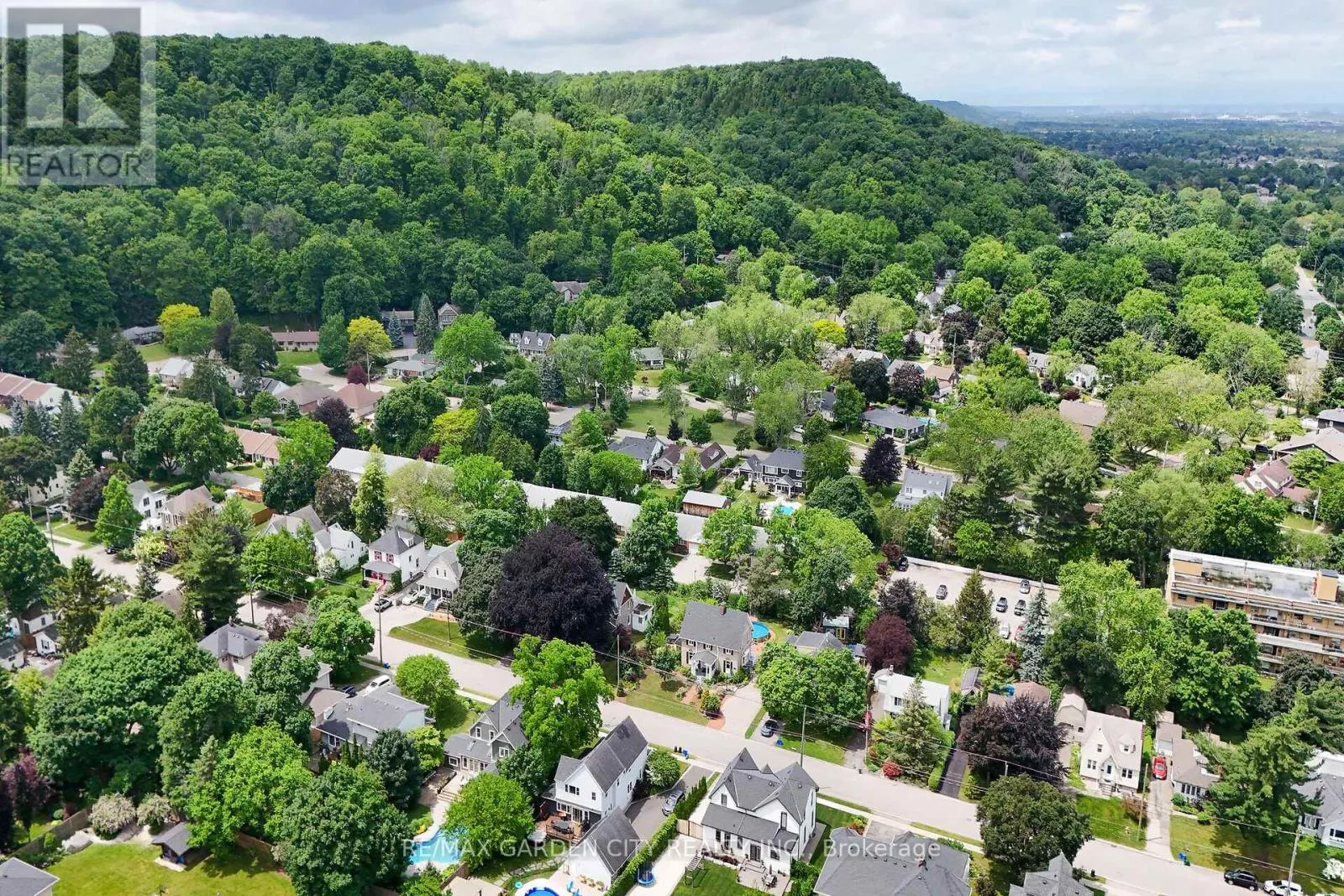 Cross Streets: MAIN ST E. ** Directions: QEW, EXIT AND SOUTH ON MAPLE AVE, RIGHT ON MAIN ST E, LEFT ON ROBINSON ST S. STATELY 2 1/2 STORY GEORGIAN STYLE DESIGNATED HISTORICAL HOME. Built in 1905, known as the Helen Gibson House. Located on large property in the heart of the downtown core on quiet tree-lined street below the escarpment among other character homes. Beautifully updated throughout! The front of this home is graced by the impressive neo-classical vaulted portico with pillars. Spacious foyer opens to large family room with newly installed wood burning fireplace insert in 2023 and oversized leaded glass bay window to bring in the light. Formal dining room with leaded glass windows overlooking the gardens. New kitchen installed in 2023. Main floor laundry, 2PC bath, main floor den/office with wall-to-wall bookcases. Double sliding doors lead to deck, patios & backyard oasis complete with pool & gazebo. Open staircase to upper-level leads to primary bedroom with walk-in closet & ensuite bath. Two additional bedrooms & bath. Second staircase leads to attic (764 square foot space) great potential to create extra living space. OTHER FEATURES INCLUDE: hardwood floors, new roof shingles 2018, new above ground pool 2024, new hot tub 2024, stainless steel appliances in kitchen, washer/dryer, 2 1/2 baths, 200 amp service. Heat pump, A/C & new on-demand water heater (owned) 2023. Long interlock double driveway (fits 4 cars), EV charger, walkway & patios. Two garden sheds. Perfectly situated a block from the downtown core and a short stroll to the Bruce trail & park. This heritage home is surrounded by its award-winning gardens. Calling all historians: It will take only one visit for you to fall in love with this rare offering! (id:27476)