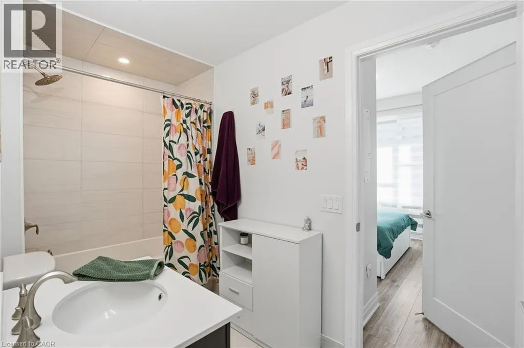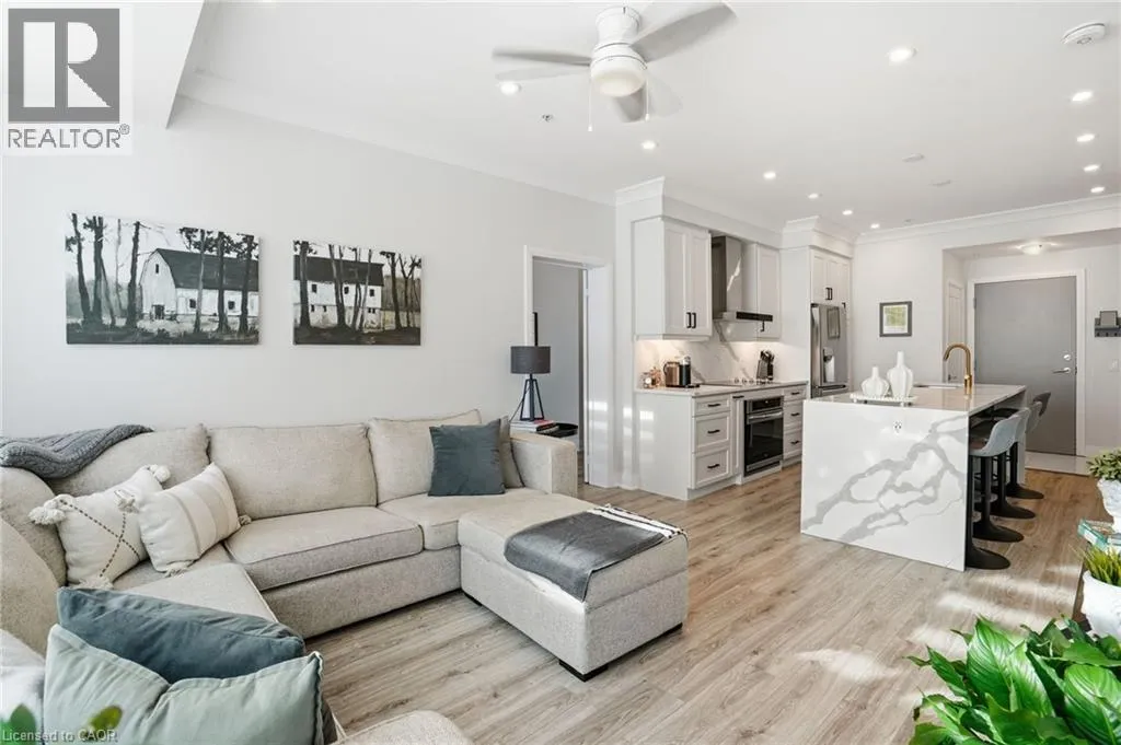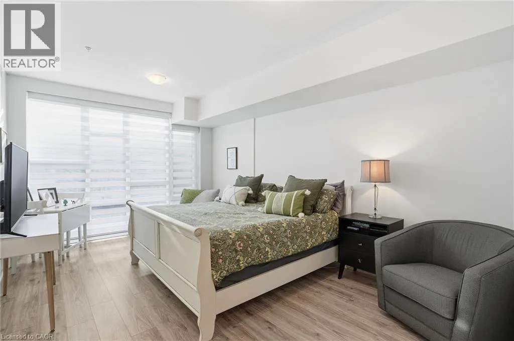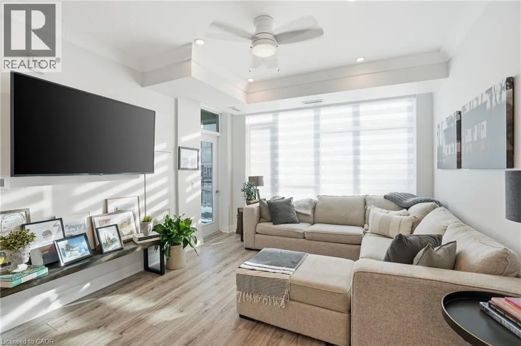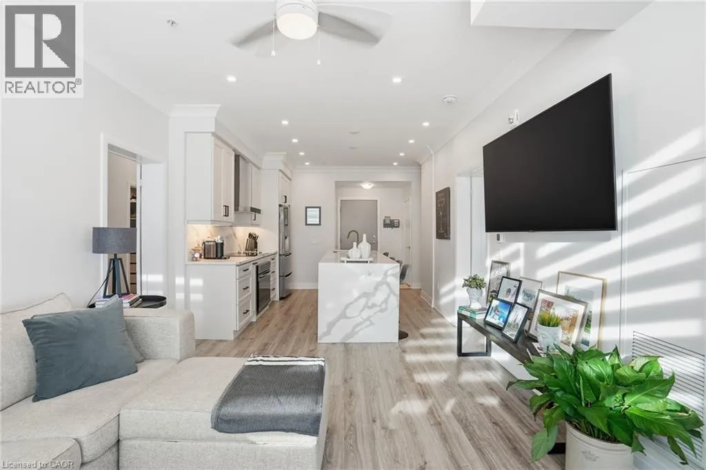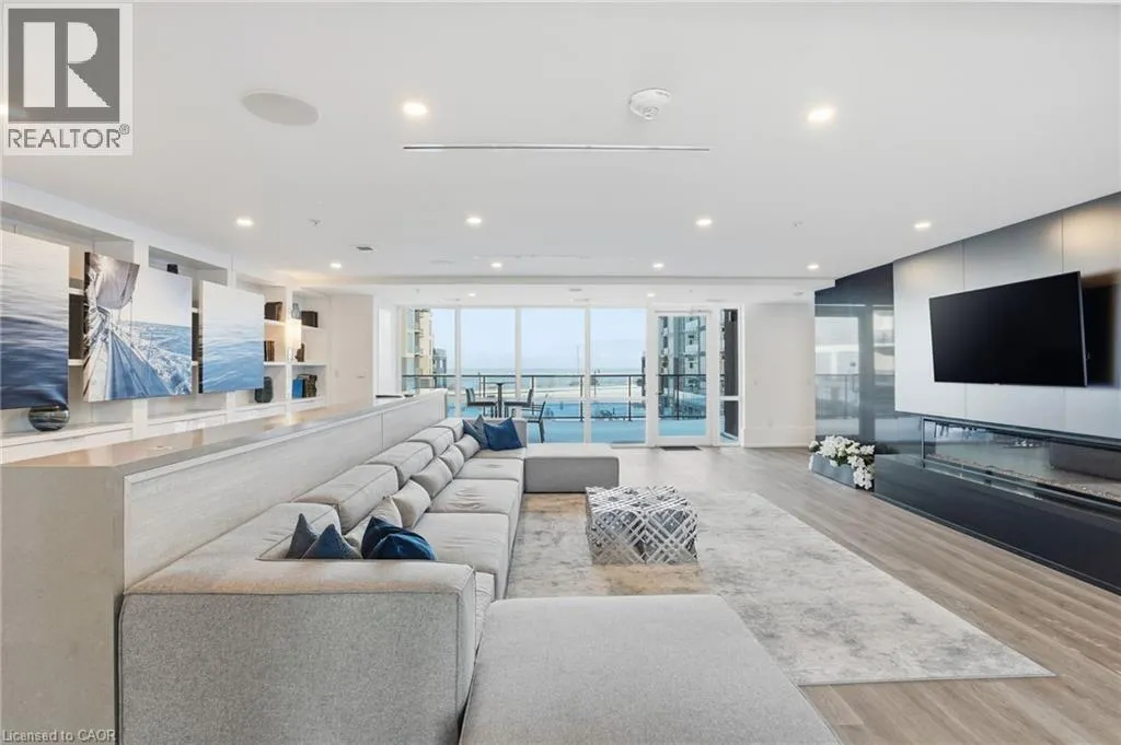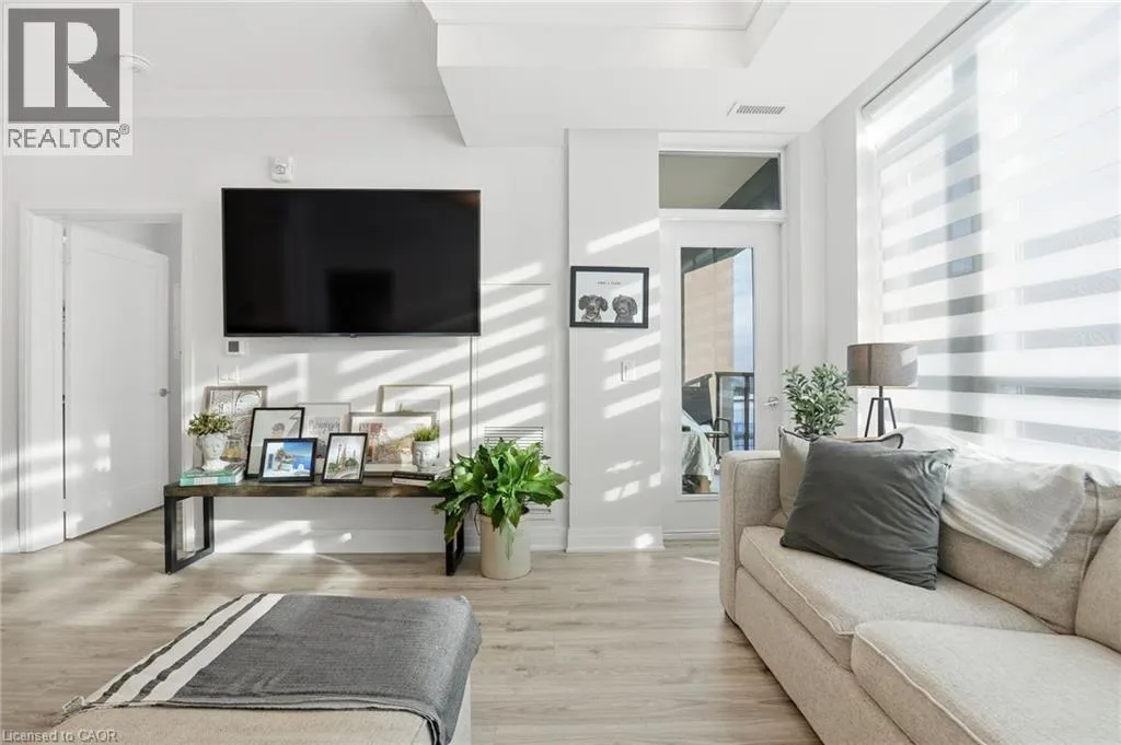 Casablanca Blvd. to South Service Rd. to Concord Place. 3rd floor suite offering over 1100 sq. ft. of carpet-free living with 9â ceilings, crown moulding, and wall-to-wall windows. Private 55 sq. ft. north-east facing balcony with open views of the pool and courtyard. Upgraded kitchen featuring a waterfall quartz breakfast bar, soft-close cabinetry, and stainless steel appliances. Includes in-suite laundry and smart thermostat with independent heating/cooling. Resort-style amenities include an in-ground pool, cabana, fitness centre, party/media rooms, and BBQ area. Comes with 2 owned parking spaces and 2 lockers, plus EV charging in visitor parking. Pet-friendly building close to highways, future GO Train, waterfront trails, shopping, dining, schools, and beaches. (id:27476)