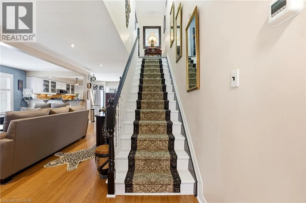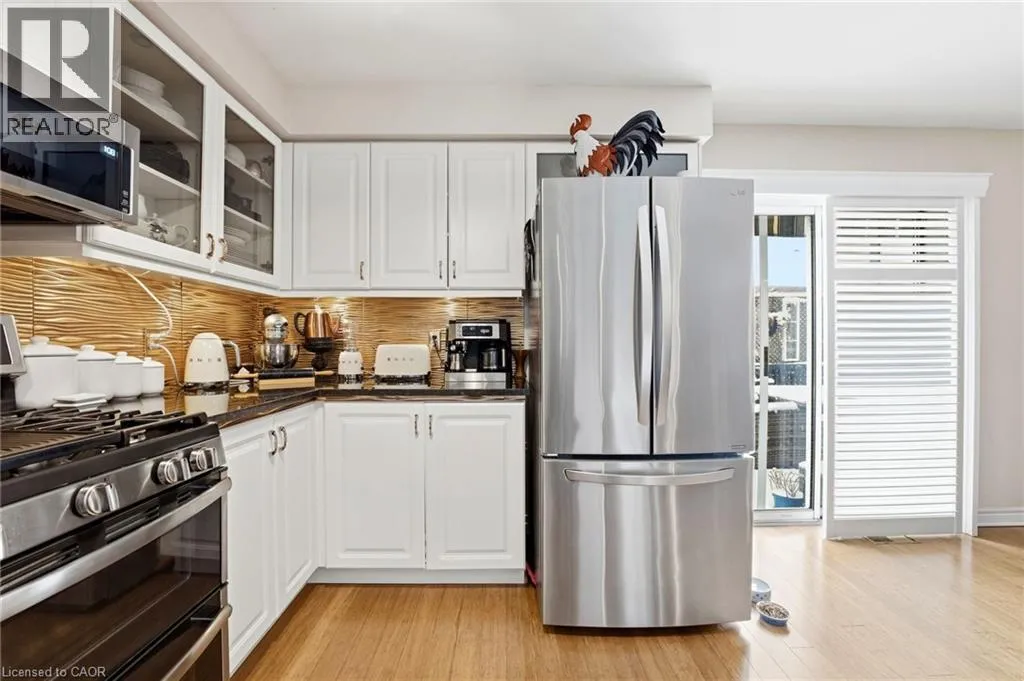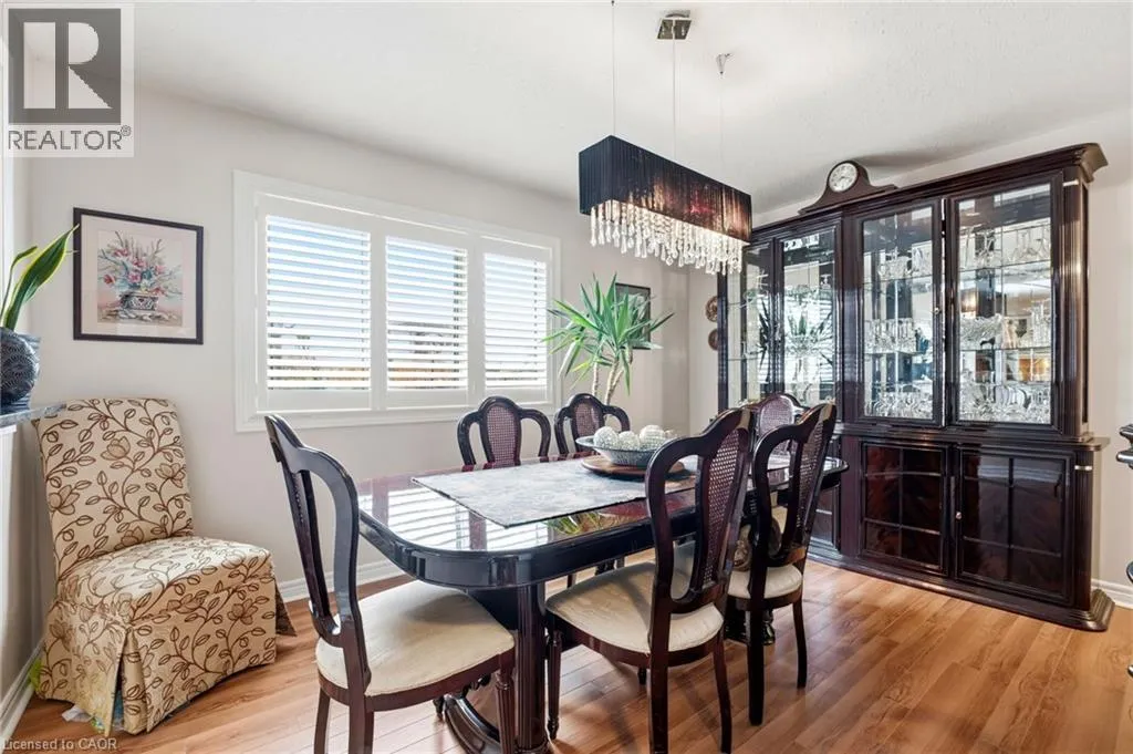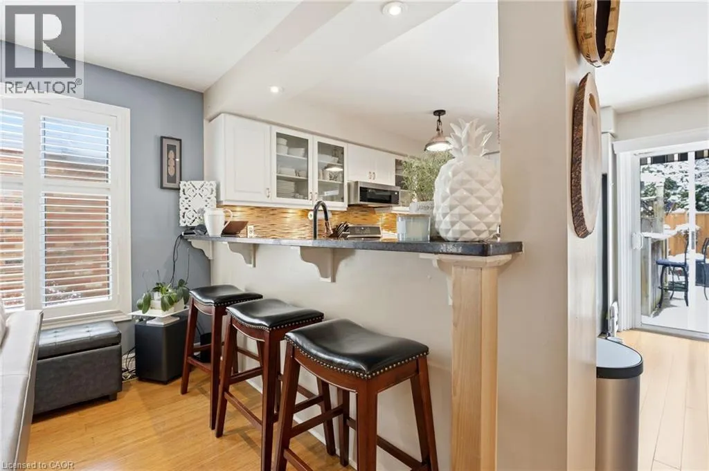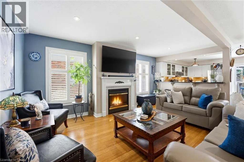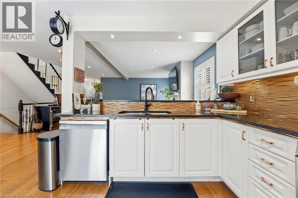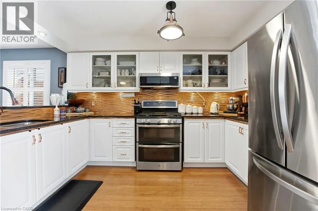 Dorchester Drive to Udell Way to Griffith Discover the charm and versatility of this beautiful bungaloft located in the heart of Grimsby along the renowned Niagara Wine Route. Just a short walk to local schools and the historic Olde Town, you'll enjoy easy access to vibrantt shops, restaurants, and nearby Ontario wineries. This thoughtfully designed home offers 2 bedrooms and 4 bathrooms with a bright open-concept layout featuring hardwood, laminate, and tile flooring throughout. The main floor includes a spacious living area and a light-filled kitchen with granite countertops, a gas range, and seamless flow into the dining area. The dining room was originally the main-floor primary bedroom and could easily be converted back to suit your needs. A patio door walkout leads to a beautifully landscaped, fully fenced backyard complete with mature trees, a deck, a recently installed retractable awning - perfect for relaxing or entertaining. The second floor is dedicated to an impressive primary retreat, featuring a massive bedroom with an electric fireplace, two dressing rooms one with closet organizers, and a luxurious updated 5-piece ensuite bathroom. The finished basement adds exceptional living space with a large recreation room, a distinctive glass wine storage room under the stairs, plus two additional versatile rooms - a den with a closet and an office with a closet - ideal for work-from-home flexibility or guest accommodations. Additional highlights include a recently updated furnace (2021) and a private yard offering both comfort and privacy. This unique bungaloft combines flexible living spaces, stylish finishes, and an unbeatable location in one of Niagara's most desirable communities. (id:27476)
