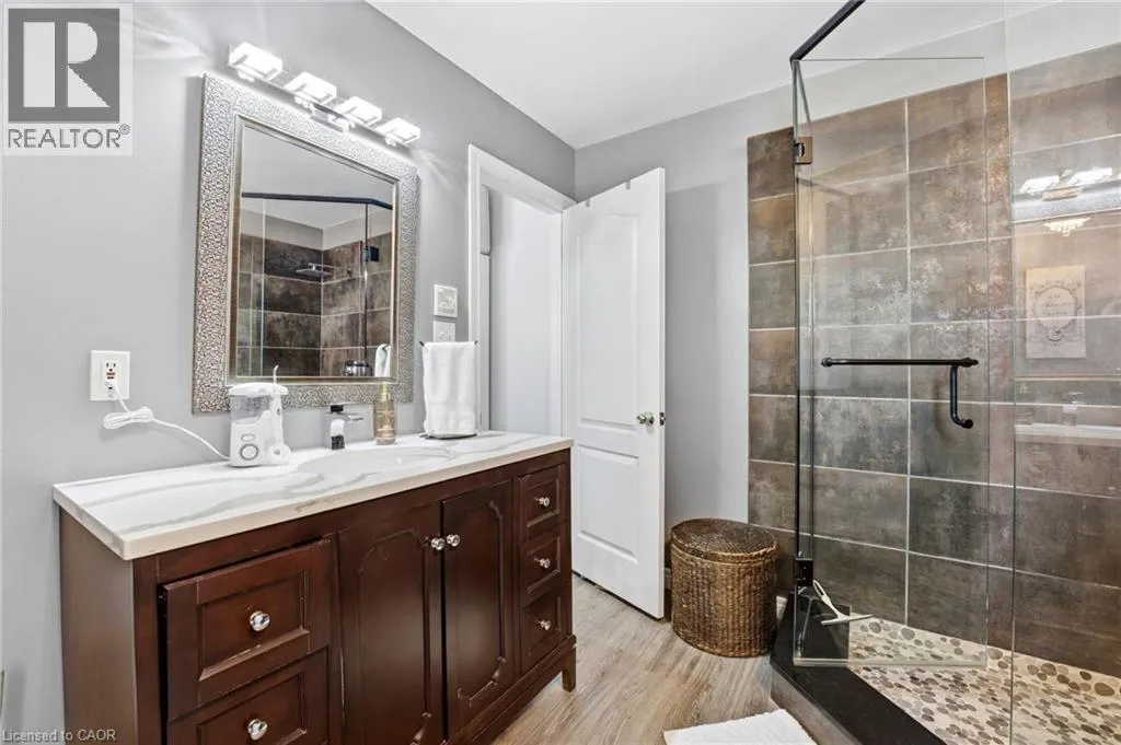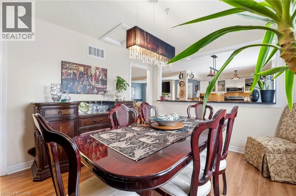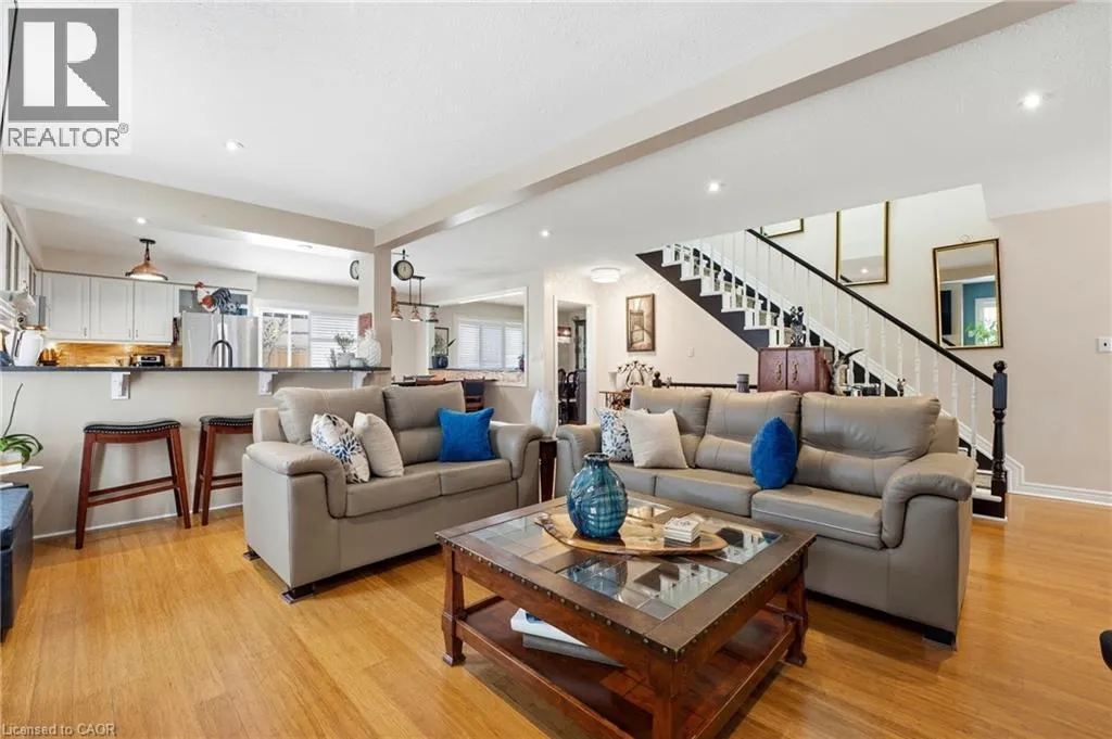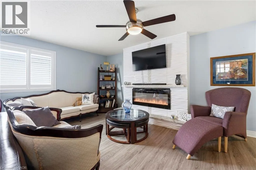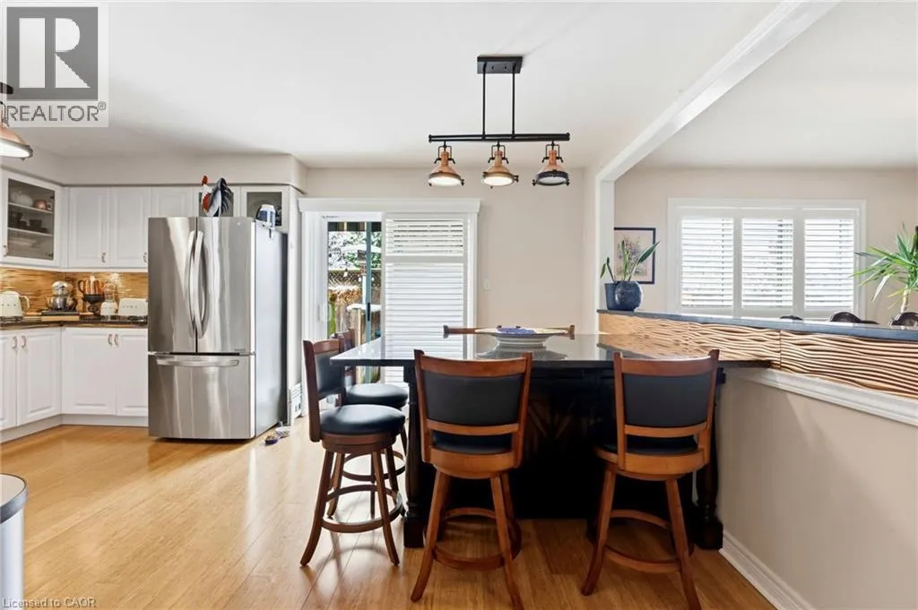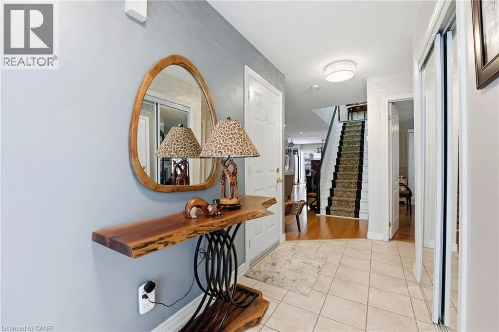 Dorchester Drive to Udell Way to Griffith Discover the charm and versatility of this beautiful bungaloft located in the heart of Grimsby along the renowned Niagara Wine Route. Just a short walk to local schools and the historic Olde Town, you'll enjoy easy access to vibrantt shops, restaurants, and nearby Ontario wineries. This thoughtfully designed home offers 2 bedrooms and 4 bathrooms with a bright open-concept layout featuring hardwood, laminate, and tile flooring throughout. The main floor includes a spacious living area and a light-filled kitchen with granite countertops, a gas range, and seamless flow into the dining area. The dining room was originally the main-floor primary bedroom and could easily be converted back to suit your needs. A patio door walkout leads to a beautifully landscaped, fully fenced backyard complete with mature trees, a deck, a recently installed retractable awning - perfect for relaxing or entertaining. The second floor is dedicated to an impressive primary retreat, featuring a massive bedroom with an electric fireplace, two dressing rooms one with closet organizers, and a luxurious updated 5-piece ensuite bathroom. The finished basement adds exceptional living space with a large recreation room, a distinctive glass wine storage room under the stairs, plus two additional versatile rooms - a den with a closet and an office with a closet - ideal for work-from-home flexibility or guest accommodations. Additional highlights include a recently updated furnace (2021) and a private yard offering both comfort and privacy. This unique bungaloft combines flexible living spaces, stylish finishes, and an unbeatable location in one of Niagara's most desirable communities. (id:27476)