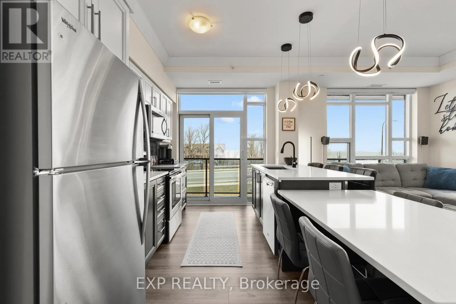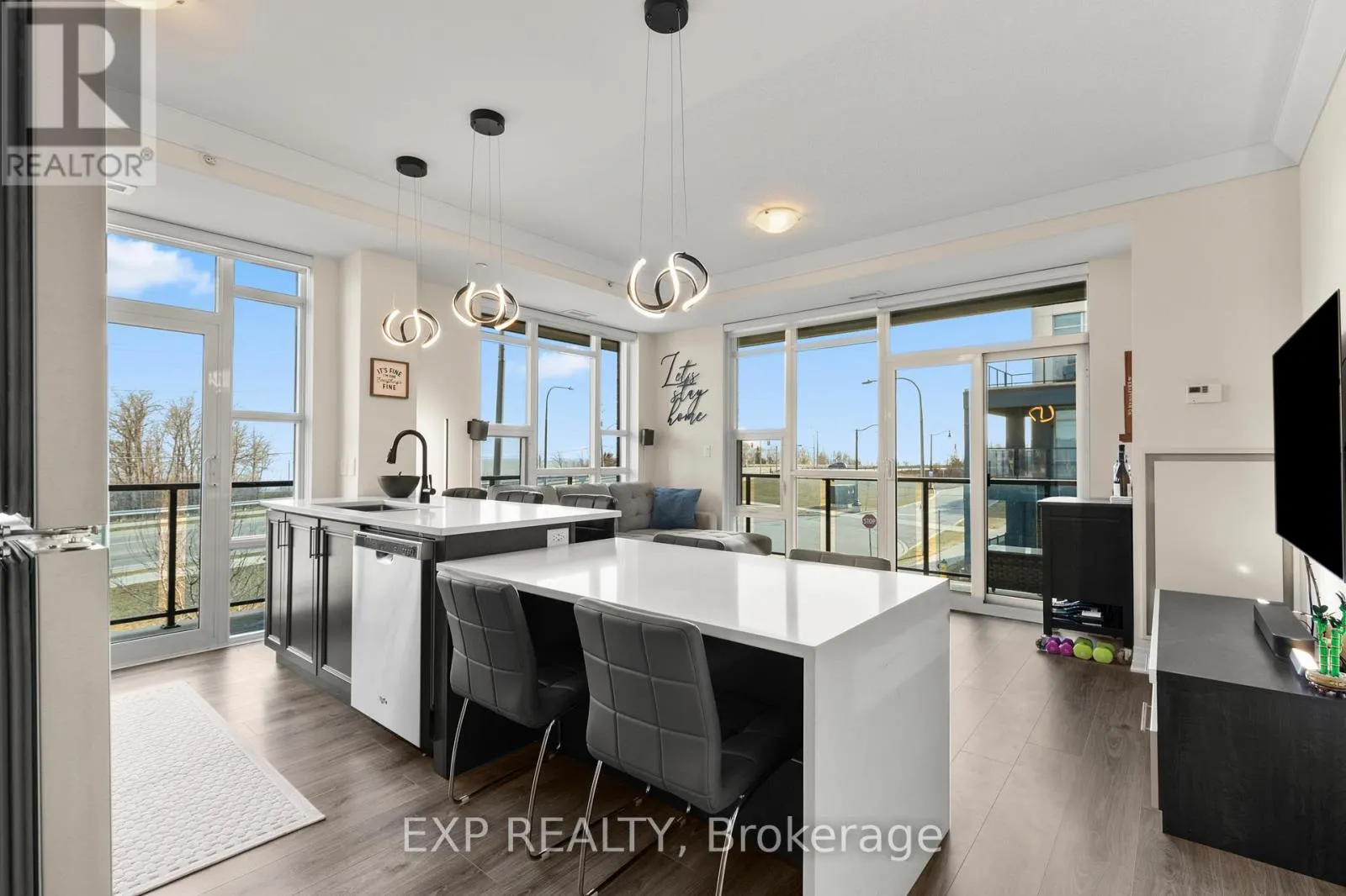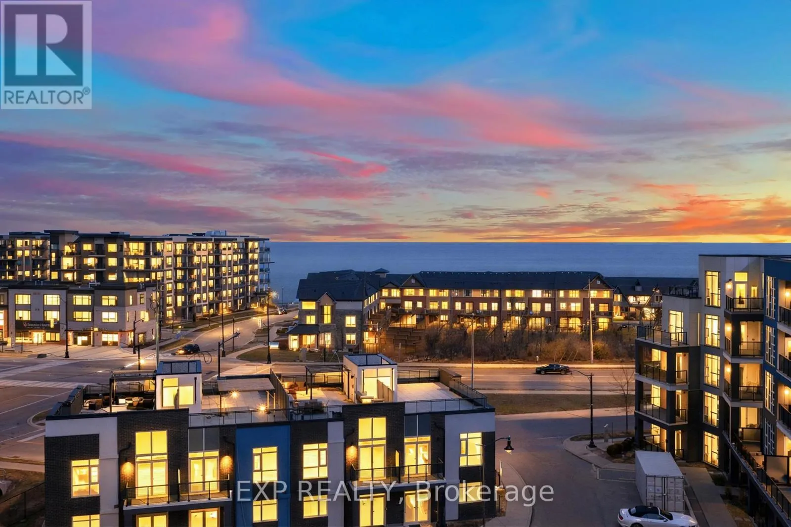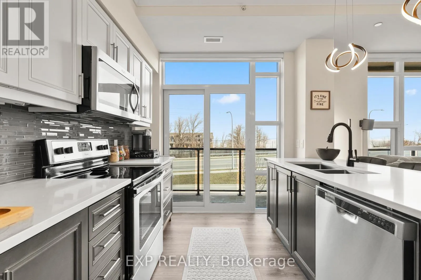 Cross Streets: Casablanca Blvd & N. Service Rd. ** Directions: South off N. Service Rd., west on Concord Pl. #10 AquaBlu on left. 10 Concord Place, Unit 209 in Grimsby offers well-planned living in a quiet, well-managed building. The layout is open and easy to live in, centered around a bright living area with floor-to-ceiling windows and a walkout to a private balcony with a clear view toward the lake. The kitchen is finished with quartz countertops, updated fixtures, and a defined breakfast nook that adds structure while keeping the space open. Crown moulding and trim carry throughout, maintaining a cohesive airy feel. Both bedrooms are thoughtfully positioned for privacy. The primary bedroom includes a three-piece ensuite, making the layout well suited for guests or a balanced setup. In-suite laundry, a dedicated storage locker, and two underground parking spaces handle the practical side. Amenities include a rooftop terrace, fitness area, and a reservable space for hosting. The location is conveniently located with quick highway access for commuting, and everyday essentials nearby including Costco, The Grimsby-on-the-Lake area is close by for restaurants, cafés, and local spots, with parks and the waterfront easily worked into your routine. If you're looking for a condo that delivers strong value on layout, lighting, and usability, this one is worth seeing in person. (id:27476)