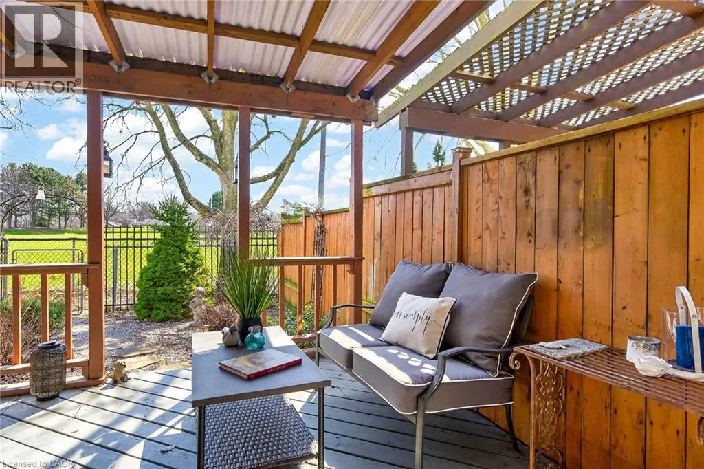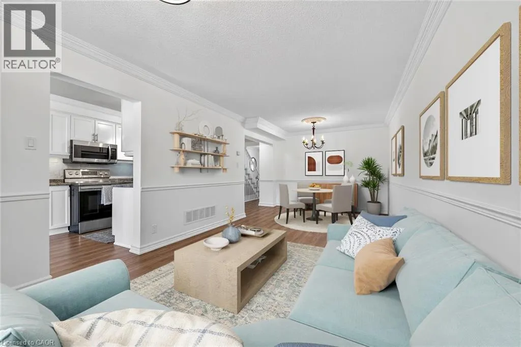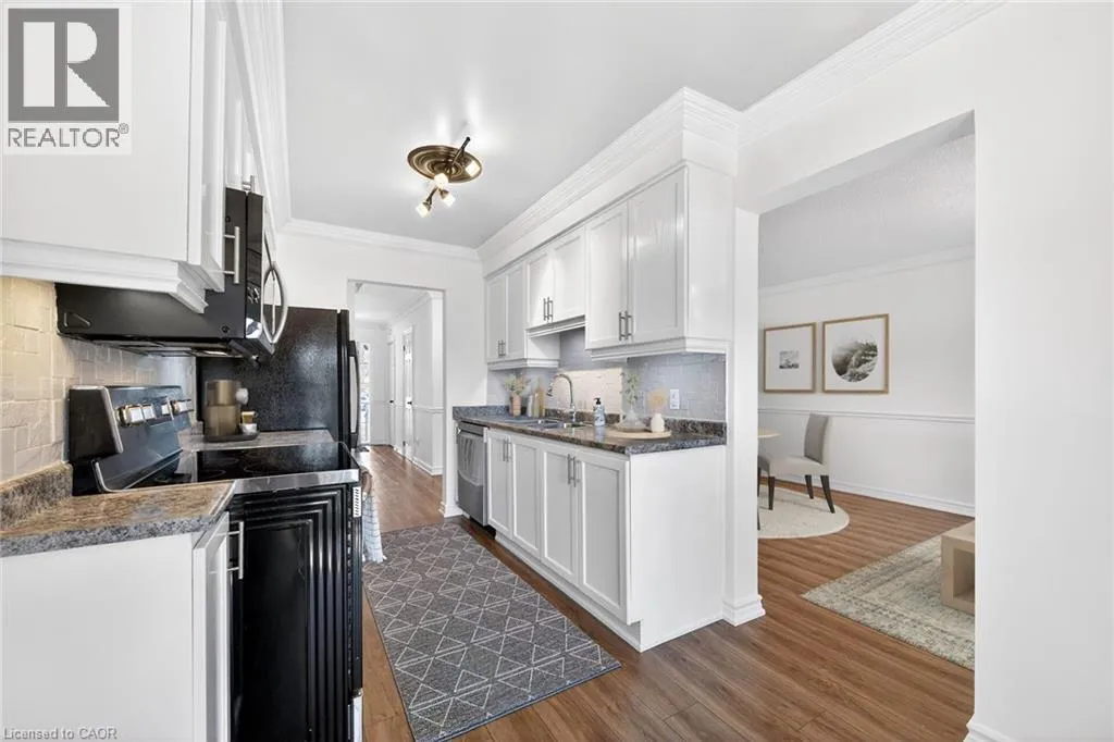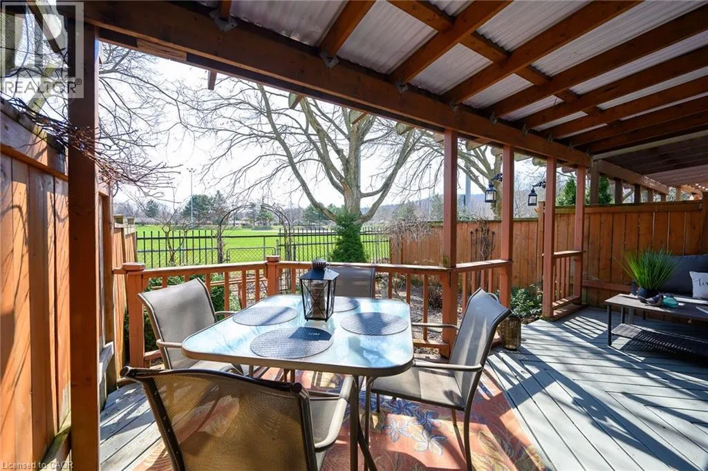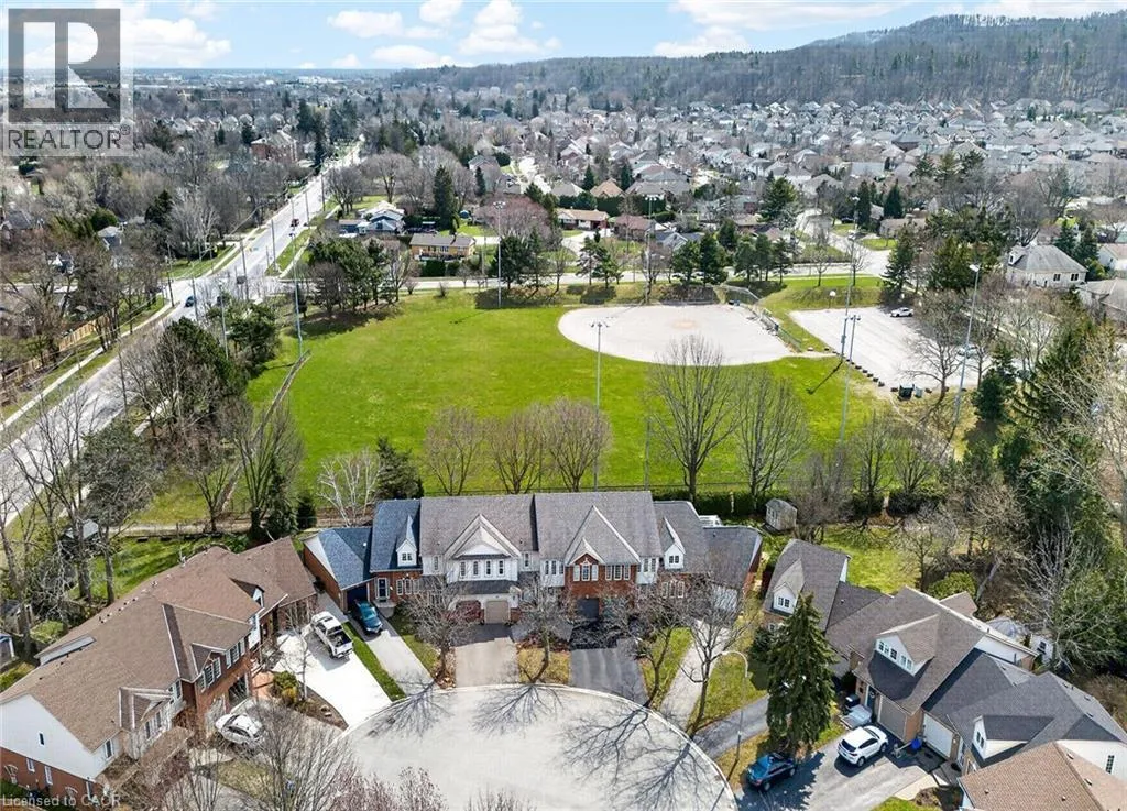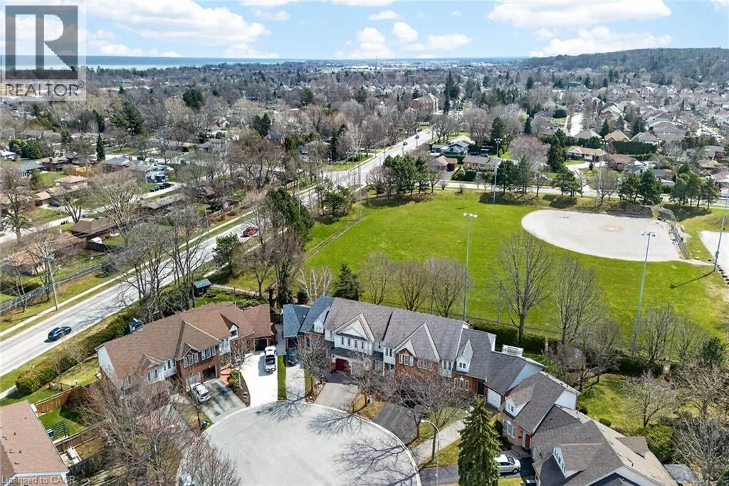 STUNNING 3 BEDROOM, 2.5 BATH, FREEHOLD TOWNHOME ON QUIET COURT backing onto Parkland. This spacious home is beautifully finished top-to-bottom. Welcoming foyer leads to gracious living room/dining room with crown moldings throughout. Fabulous kitchen with abundant cabinetry & appliances. Sliding doors from kitchen lead to serene backyard oasis with expansive covered deck, fenced yard with park & escarpment views. Large primary bedroom suite with 4-piece ensuite bath & walk-in closet. Finished lower level with electric fireplace features a large space for entertaining & relaxation. OTHER FEATURES INCLUDE: 2 1/2 baths, new central air unit 2024, all window treatments, new microwave/fan & premium flooring 2021, new garage door 2023, washer/dryer, roof shingles & furnace replaced, new dishwasher 2025. Steps to park, hospital & conveniences. This home offers a wonderful lifestyle in an idyllic setting! Some photos virtually staged. (id:27476)