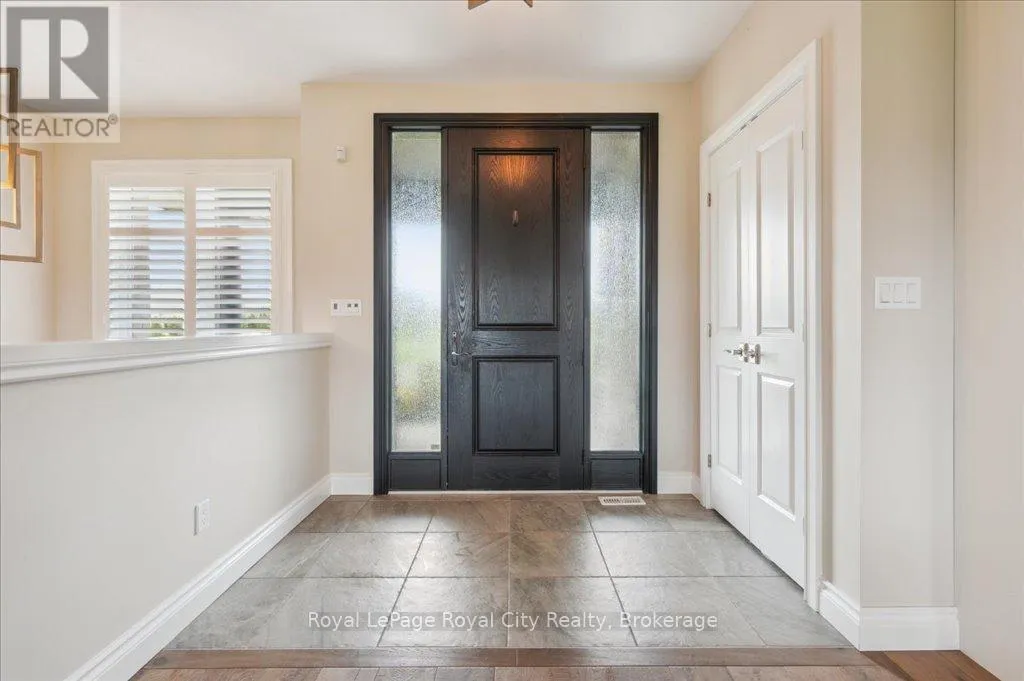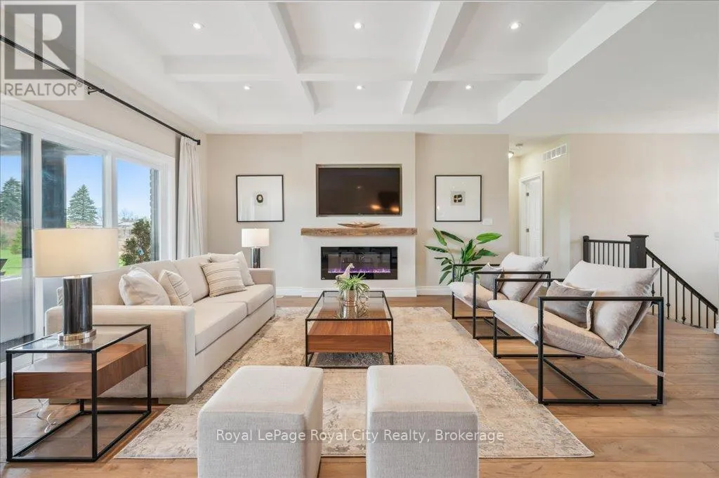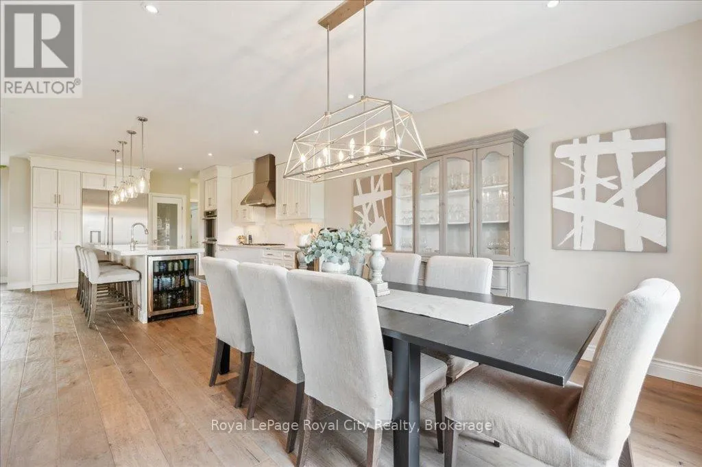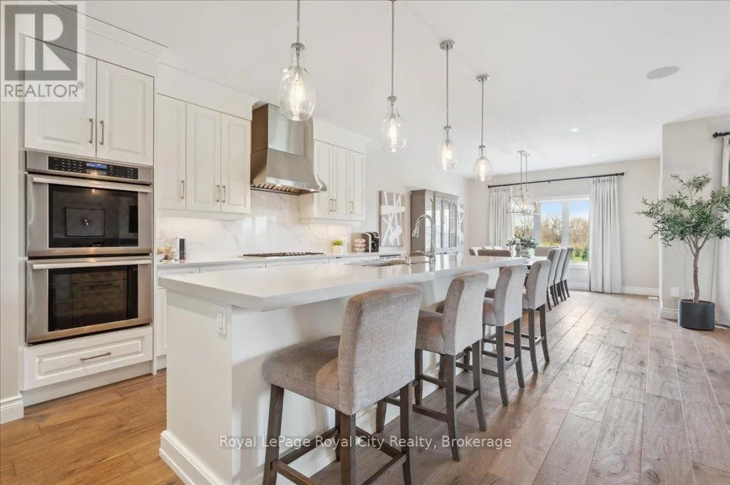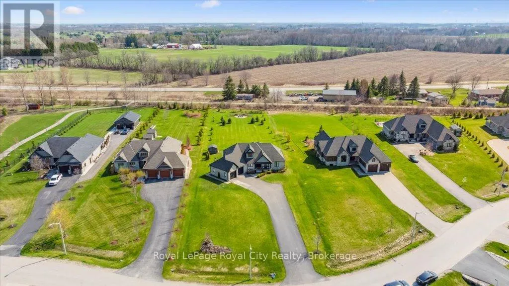Off Wellington Rd. 51 Tucked away on a prestigious cul-de-sac in Ariss, this extraordinary executive residence epitomizes refined luxury, privacy, and community. From the moment you arrive, the attention to detail and upgrades, both inside and out, set this home apart as a true showpiece. The open-concept main level is a masterpiece of design, showcasing hand-scraped engineered hardwood beneath soaring 9' ceilings. In the living room, a striking coffered ceiling elevates the space with architectural elegance, while oversized windows flood every corner with natural light. A massive quartz island anchors the gourmet kitchen/dining area, surrounded by floor-to-ceiling custom cabinetry, premium finishes, a generous pantry, and high-end appliances, including a gas countertop range, double built-in ovens, and a MARVEL wine fridge. Step outside to the covered rear porch and adjoining composite deck, where a built-in hot tub invites relaxation overlooking the expansive backyard and the scenic Kissing Bridge Trail beyond. The primary suite is designed to rival any five-star spa, boasting a luxurious ensuite with a frameless glass shower, dual vanities with custom cabinetry, a spacious walk-in closet, and direct access to the deck and hot tub. Two additional bedrooms, a stunning 5-piece bathroom, and an elegant powder room provide comfort and sophistication for family and guests alike. The main-level laundry and mudroom combination is both beautiful and practical, finished to the same high standard as the rest of the home. The lower level is equally impressive, with soaring ceilings, engineered hardwood, a striking stone-clad gas fireplace, a 4-piece bathroom, and two generously sized bedrooms- creating the perfect space for guests, teenagers, or extended family. Ideally located just minutes from Guelph, K/W, and Centre Wellington, and a short stroll to Ariss Valley Golf Course, this home delivers an unparalleled lifestyle of elegance and convenience in a highly desirable rural setting. (id:27476)