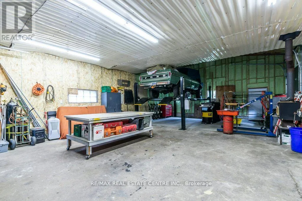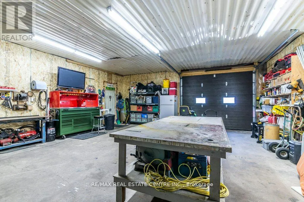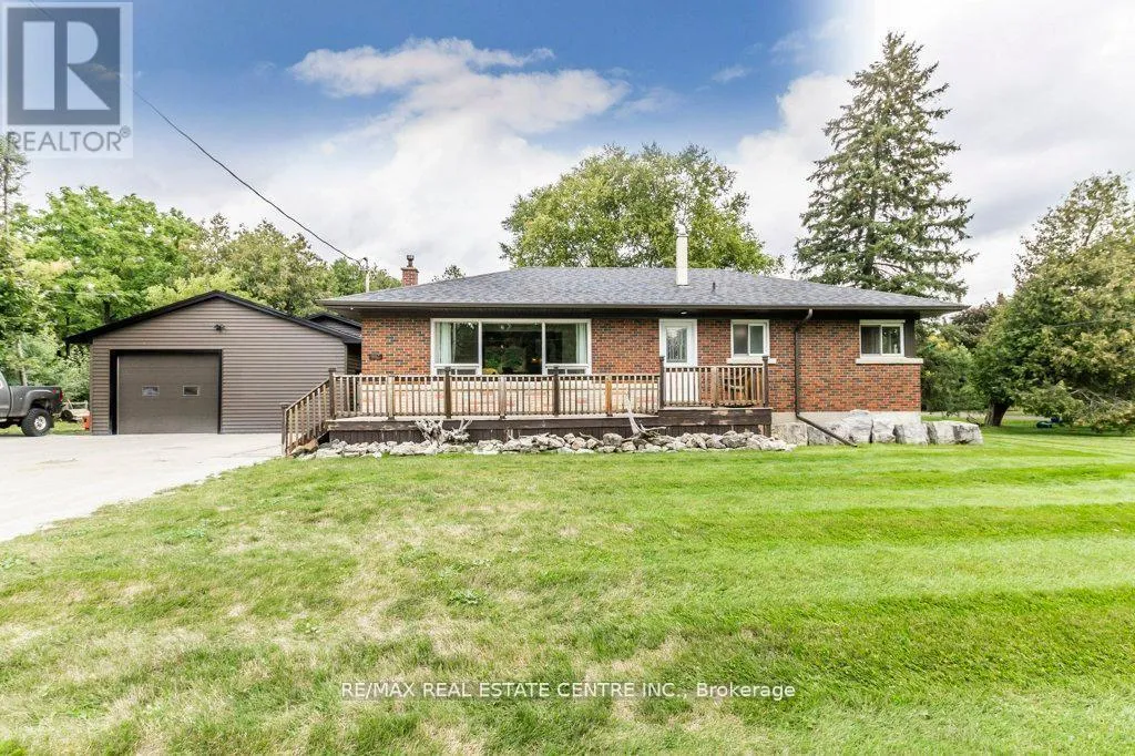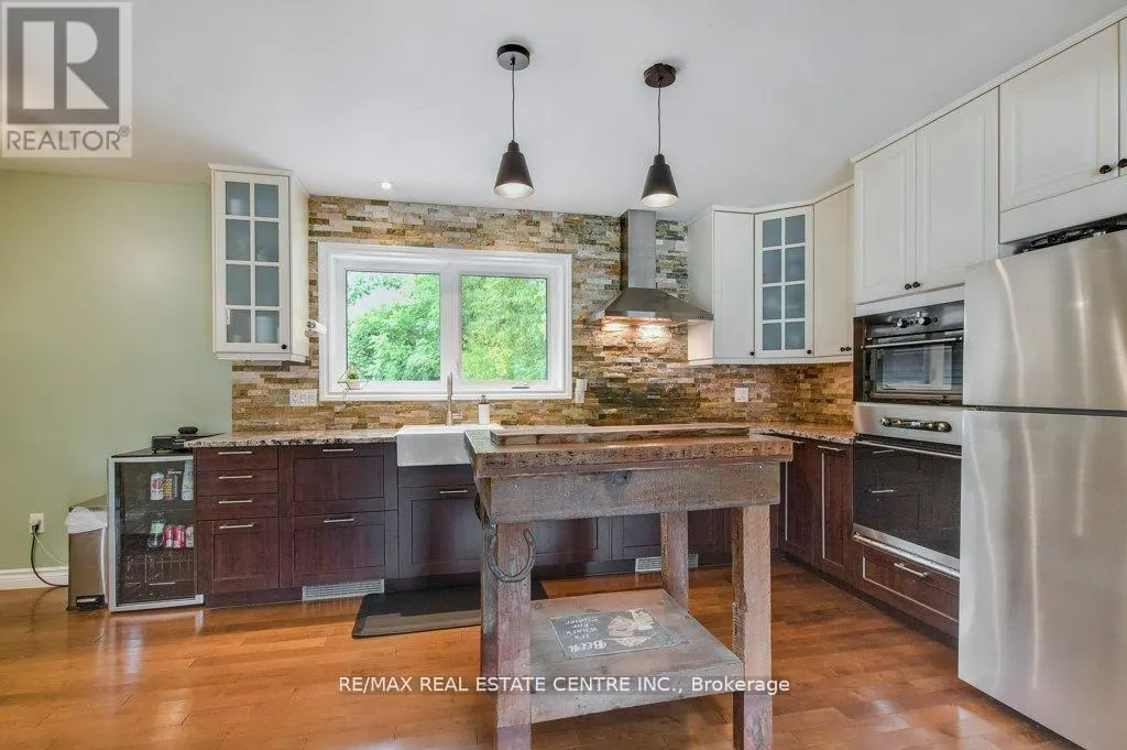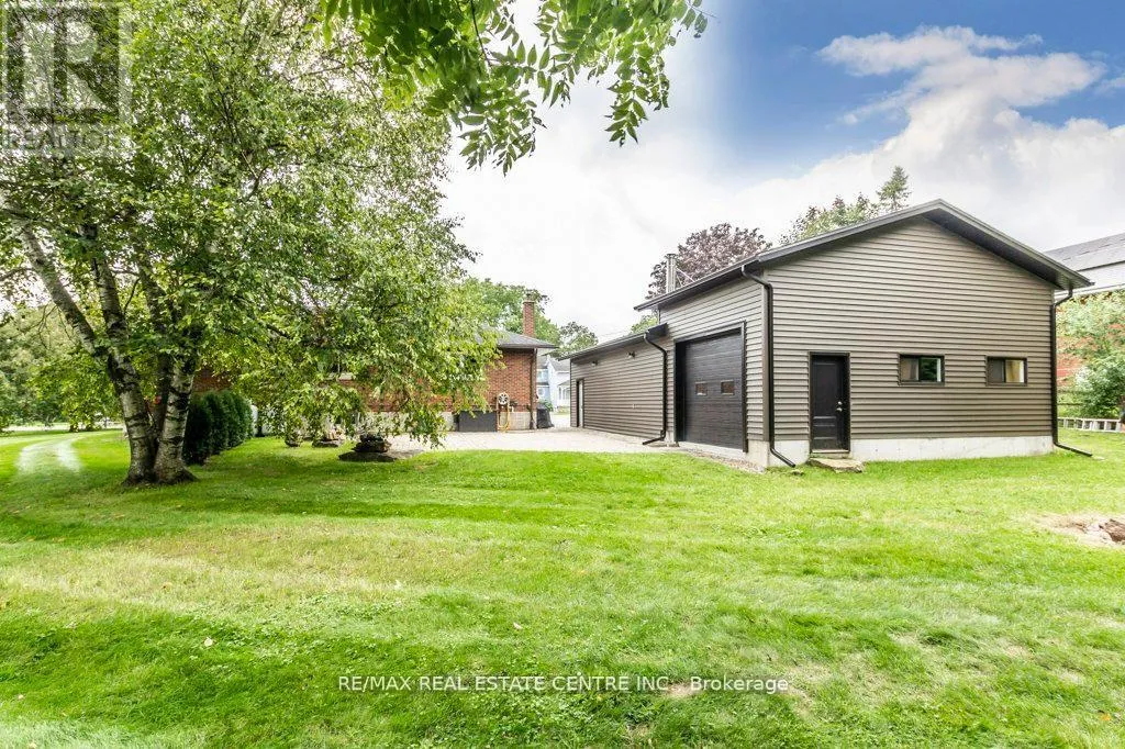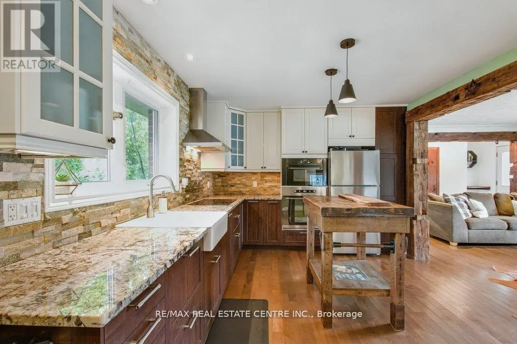 Wilson Street and GuelphLine Gorgeous upgraded open concept brick bungalow with a huge garage/workshop on half an acre in picturesque village of Eden Mills. The expansive eat-in kitchen is enhanced with rich cabinetry with undermount lighting, stunning granite counters with farm-style sink inset, stone backsplash, and movable island. Stainless steel built-in microwave, built-in oven, countertop range, stainless steel hood fan and stainless steel refrigerator. The kitchen overlooks the vast living room with huge picture window. Rich hardwood floors and barn beam accents compliment the main floor with huge primary bedroom, second bedroom and a renovated four piece bathroom with heated floors and luxurious ceramics. The lower level offers a huge recreation room, spacious bedroom and a recent three piece washroom with built-in laundry. Lots of storage available in the utility room and in the furnace room. The massive garage/workshop has 220 amp power, room for more than four vehicles and a second garage door to the side opening to the private backyard oasis. Notable features: new propane furnace and water heater (December 2024), waterproofed basement, 125 amp house panel, attic insulation (June 2024), new bathroom/laundry room (October 2024), new soffits, facia and eavestrough on house and shop (June 2024), 500 sq.ft. addition to shop (June 2024), new siding on shop (June 2024). A truly awesome opportunity to live in a quiet village setting. (id:27476)