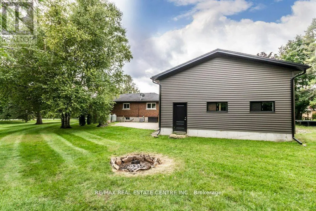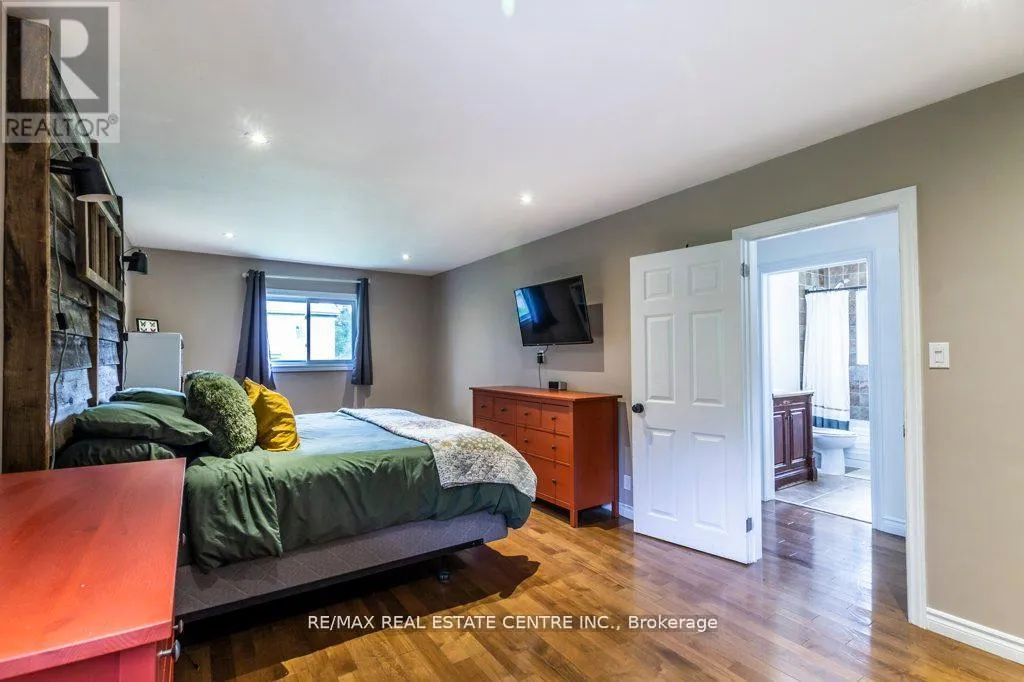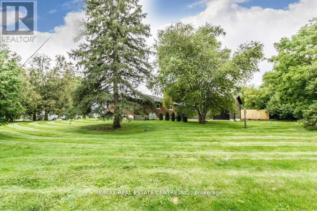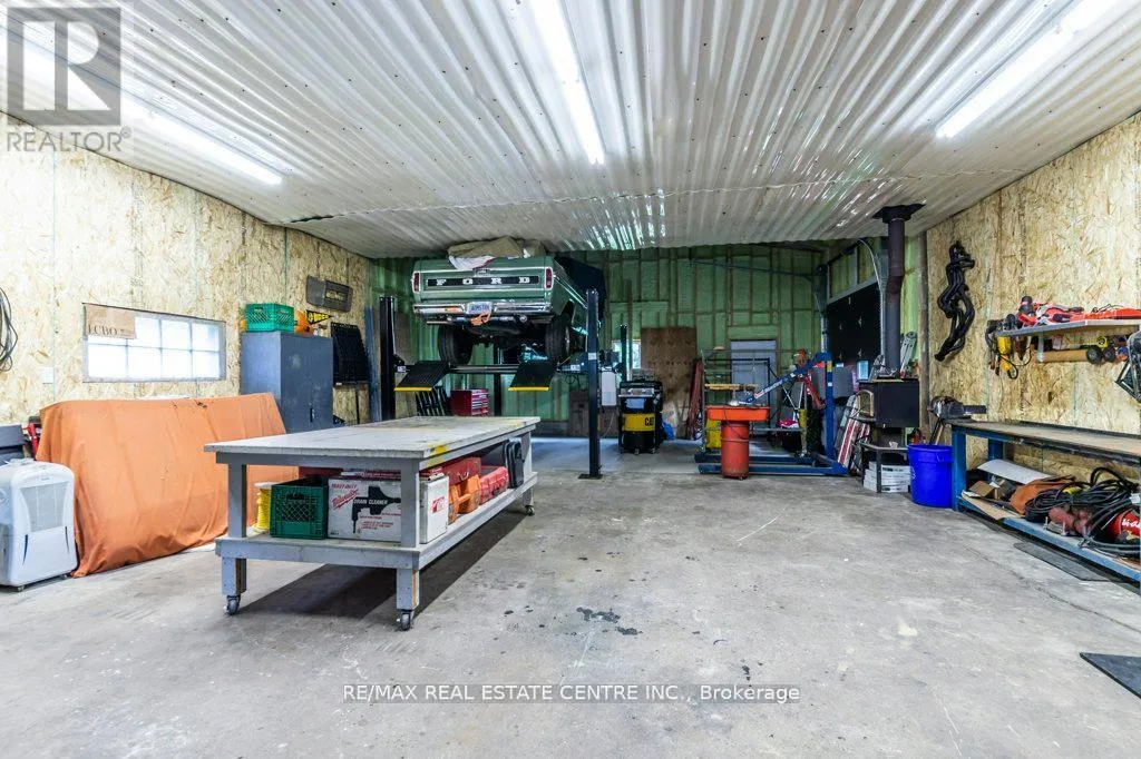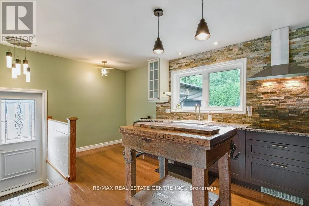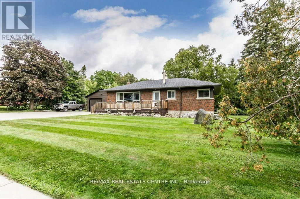 Wilson Street and GuelphLine Gorgeous upgraded open concept brick bungalow with a huge garage/workshop on half an acre in picturesque village of Eden Mills. The expansive eat-in kitchen is enhanced with rich cabinetry with undermount lighting, stunning granite counters with farm-style sink inset, stone backsplash, and movable island. Stainless steel built-in microwave, built-in oven, countertop range, stainless steel hood fan and stainless steel refrigerator. The kitchen overlooks the vast living room with huge picture window. Rich hardwood floors and barn beam accents compliment the main floor with huge primary bedroom, second bedroom and a renovated four piece bathroom with heated floors and luxurious ceramics. The lower level offers a huge recreation room, spacious bedroom and a recent three piece washroom with built-in laundry. Lots of storage available in the utility room and in the furnace room. The massive garage/workshop has 220 amp power, room for more than four vehicles and a second garage door to the side opening to the private backyard oasis. Notable features: new propane furnace and water heater (December 2024), waterproofed basement, 125 amp house panel, attic insulation (June 2024), new bathroom/laundry room (October 2024), new soffits, facia and eavestrough on house and shop (June 2024), 500 sq.ft. addition to shop (June 2024), new siding on shop (June 2024). A truly awesome opportunity to live in a quiet village setting. (id:27476)