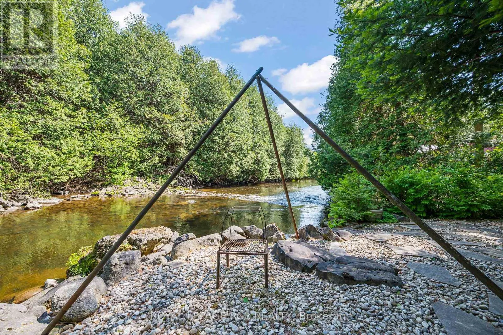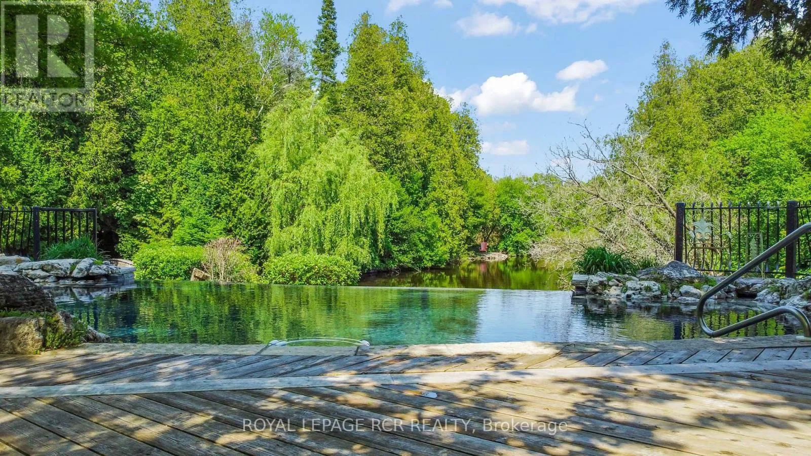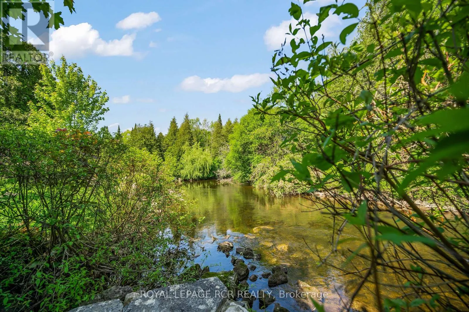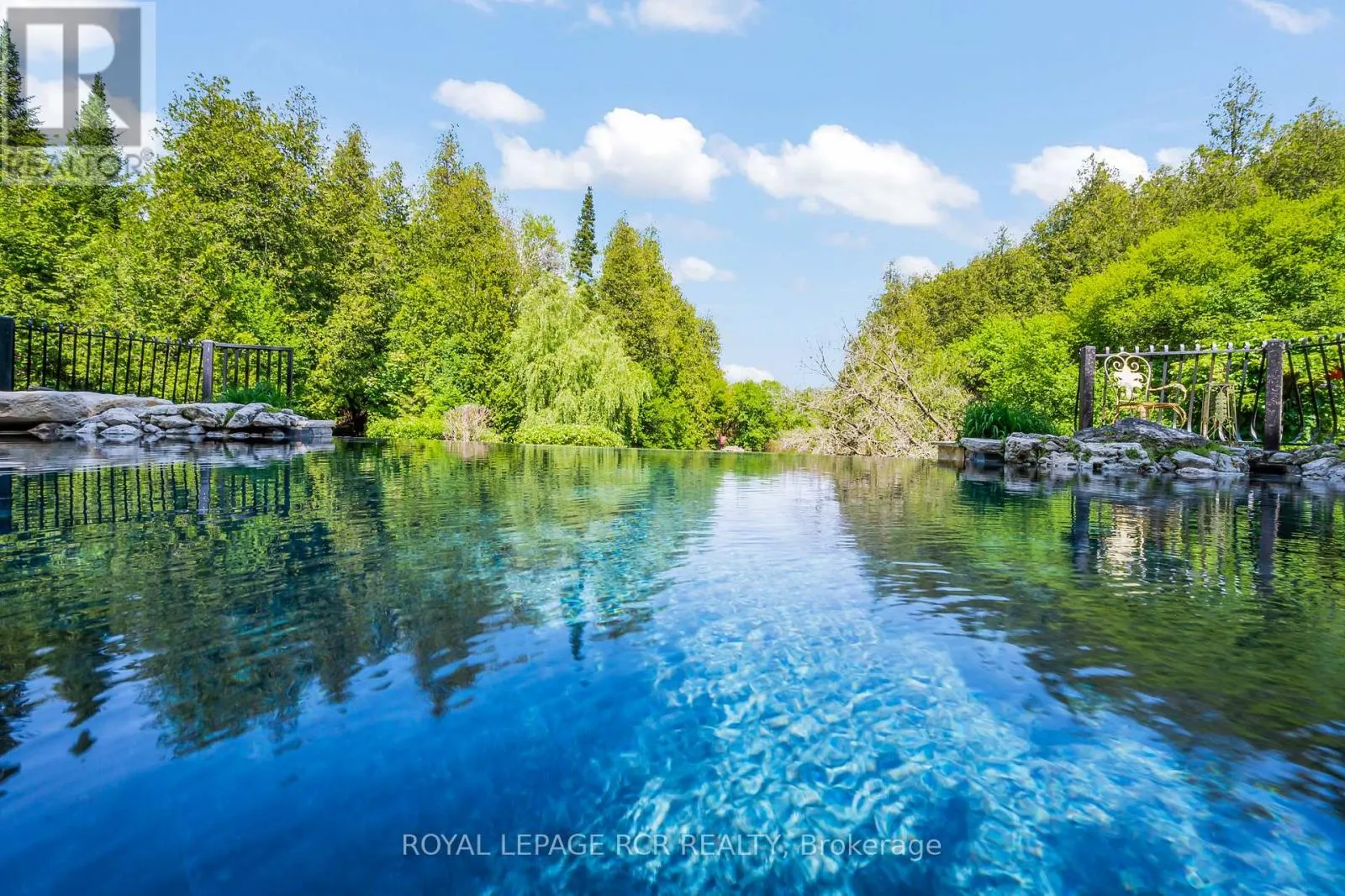 Cross Streets: Fourth Line/Guelph Line & Highway 7. ** Directions: South on River Bluff Path from Highway 7. Tucked away on a secluded road, 15 River Bluff Path offers an extraordinary sanctuary blending natural beauty, creative energy, and quiet seclusion. Set on 13 acres with over 750 feet along the Eramosa River, this property presents a once-in-a-lifetime opportunity, with many unique features grandfathered in by the GRCA. The winding drive leads through a forest of mature trees to an almost otherworldly scene where a breathtaking infinity pool appears to spill into the river, surrounded by tranquil vistas and lush vegetation. Enjoy the scenery from the tiered deck, relax in the indoor hot tub, or watch wildlife such as deer, herons, and turtles. The private trail system leads to whimsical outbuildings, including a screened wooden pergola, a Japanese Maple Zen garden, and an outdoor privy. Once owned by a renowned Canadian naturalist, the property brims with creativity and inspiration. Inside, the great room captivates with soaring ceilings, stained glass accents, rustic wood beams, and a dramatic gas fireplace. A wall of windows connects the indoors to the breathtaking river view. The adjoining dining nook is perfect for gatherings, while the spacious kitchen features ample storage, a skylight, and an iconic AGA gas cooker. The main floor includes a vaulted-ceiling bedroom, a dressing/hobby room, two three-piece bathrooms (one wheelchair accessible), and a large laundry room. Upstairs, a loft-style theatre room provides an ideal space for entertainment, and two additional bedrooms share an impressive four-piece bathroom with heated floors and a spacious walk-in glass shower. With a two-car garage and an intercom system throughout, this retreat guarantees comfort and connectivity. Despite its privacy, it's just minutes from Rockwood's amenities and easily accessible to Guelph, Milton, and Pearson Airport. 15 River Bluff Path is more than just a home - it's a legacy property rooted in nature and creativity, where every moment feels extraordinary. (id:27476)