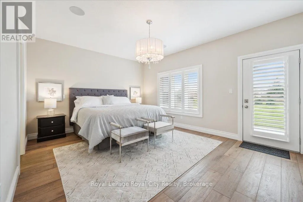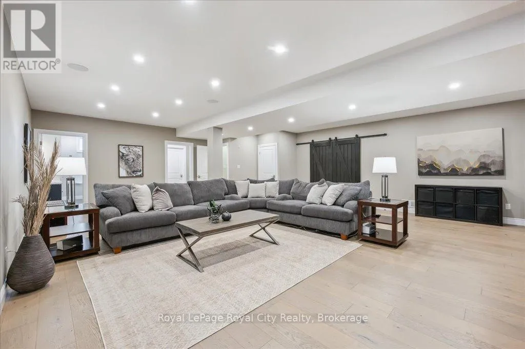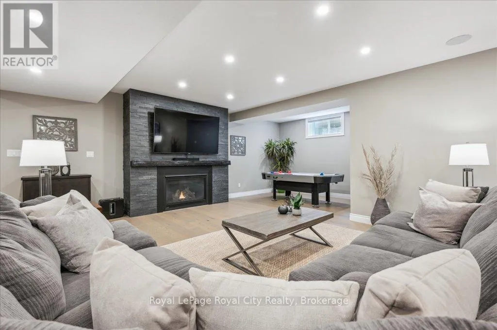 Off Wellington Rd. 51 Tucked away on a prestigious cul-de-sac in Ariss, this extraordinary executive residence epitomizes refined luxury, privacy, and community. From the moment you arrive, the attention to detail and upgrades, both inside and out, set this home apart as a true showpiece. The open-concept main level is a masterpiece of design, showcasing hand-scraped engineered hardwood beneath soaring 9' ceilings. In the living room, a striking coffered ceiling elevates the space with architectural elegance, while oversized windows flood every corner with natural light. A massive quartz island anchors the gourmet kitchen/dining area, surrounded by floor-to-ceiling custom cabinetry, premium finishes, a generous pantry, and high-end appliances, including a gas countertop range, double built-in ovens, and a MARVEL wine fridge. Step outside to the covered rear porch and adjoining composite deck, where a built-in hot tub invites relaxation overlooking the expansive backyard and the scenic Kissing Bridge Trail beyond. The primary suite is designed to rival any five-star spa, boasting a luxurious ensuite with a frameless glass shower, dual vanities with custom cabinetry, a spacious walk-in closet, and direct access to the deck and hot tub. Two additional bedrooms, a stunning 5-piece bathroom, and an elegant powder room provide comfort and sophistication for family and guests alike. The main-level laundry and mudroom combination is both beautiful and practical, finished to the same high standard as the rest of the home. The lower level is equally impressive, with soaring ceilings, engineered hardwood, a striking stone-clad gas fireplace, a 4-piece bathroom, and two generously sized bedrooms- creating the perfect space for guests, teenagers, or extended family. Ideally located just minutes from Guelph, K/W, and Centre Wellington, and a short stroll to Ariss Valley Golf Course, this home delivers an unparalleled lifestyle of elegance and convenience in a highly desirable rural setting. (id:27476)