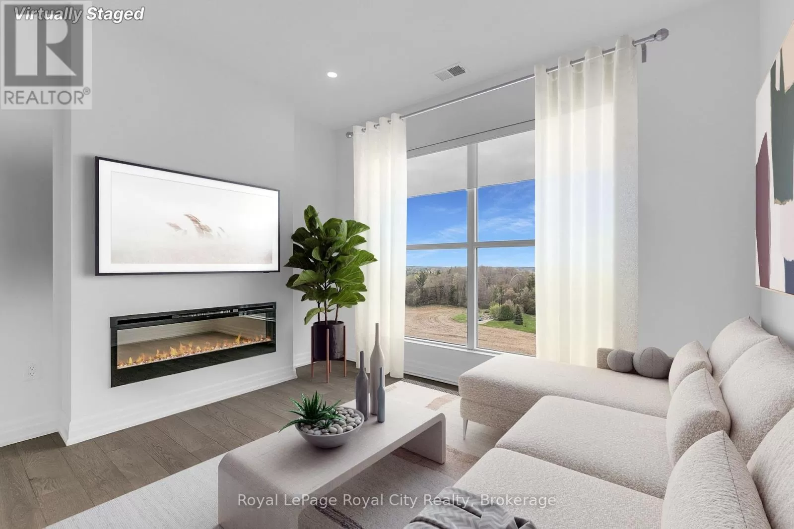 Cross Streets: Gordon Street just south of Poppy Lane. ** Directions: Gordon Street S of Poppy Lane. You'll love the exceptional floor plan that this 2 bedroom, 2 bath corner unit offers. Sun floods every room and you can take in morning sunrises as well as sunsets from the wrap around balcony. The kitchen is worthy of any chef and features loads of counter space, stainless appliances, stone counters and a large island that is perfect for casual meals. The adjacent dining room offers a larger space for more formal dining. The living room with its fireplace is open to the kitchen and dining room and full windows take in the southern exposure. Comfortable and nicely designed, the west-facing primary bedroom boasts a walk-in closet and a great ensuite with walk-in shower and double sinks. The second bedroom also faces west and is quite spacious. A lovely 4pc bath is conveniently located in the hallway between the bedrooms. Located in a building that offers an impressive list of amenities like a guest suite, gym, party room and golf simulator. The location can't be beat! Around the corner from groceries, library, restaurants and movie theatre. It's prime for those commuters needing easy access south towards the 401 as well. Whether starting out or downsizing, this stylish 10th floor unit with its bright neutral colour palette awaits. (id:27476)
