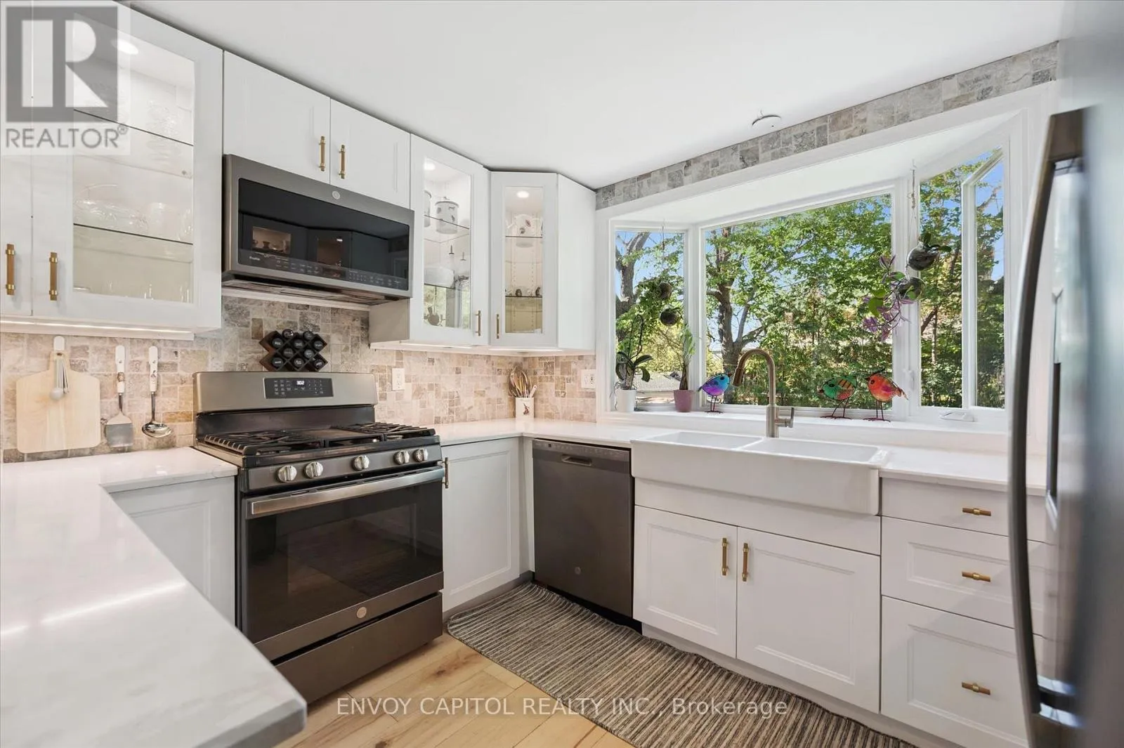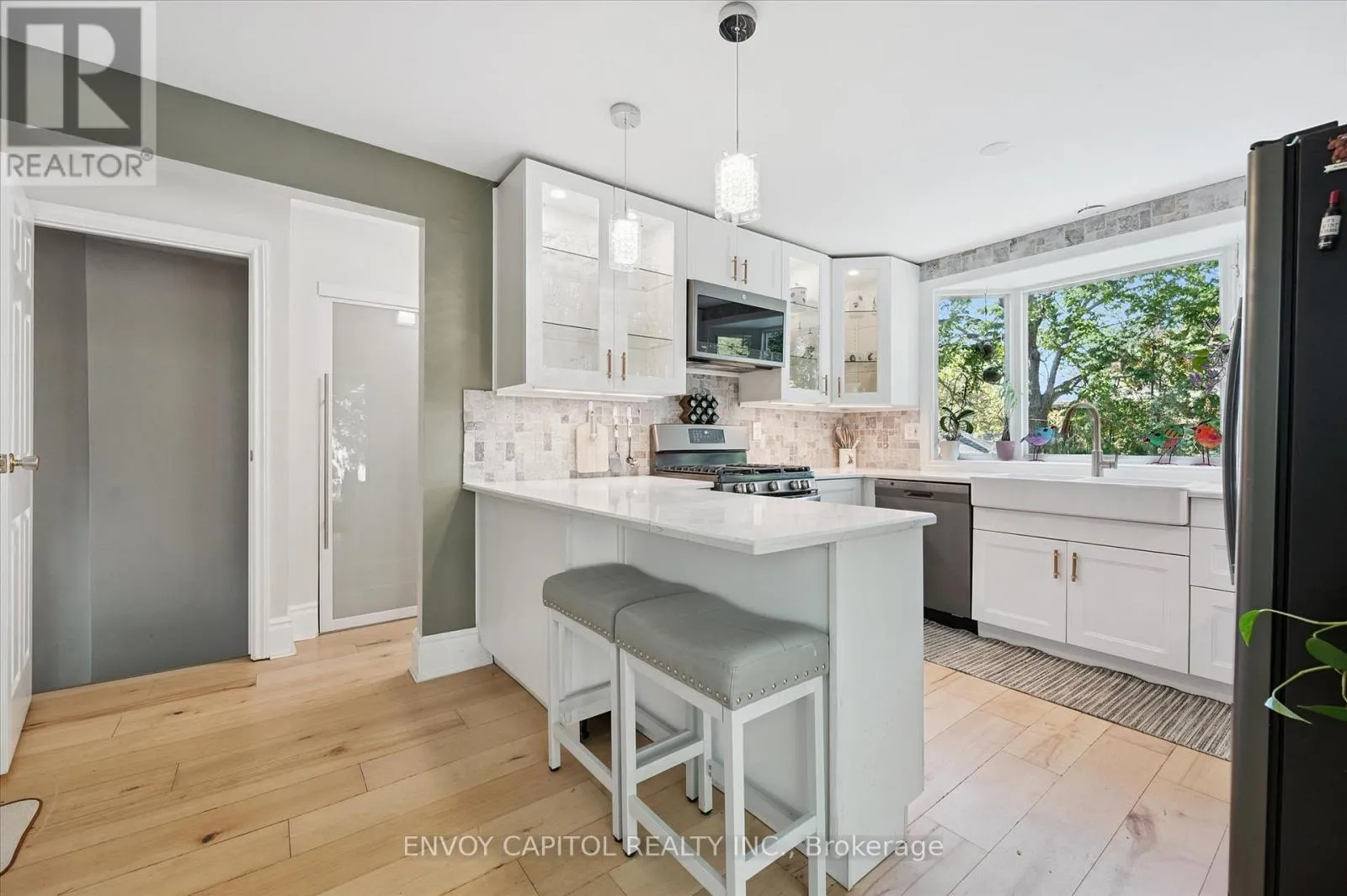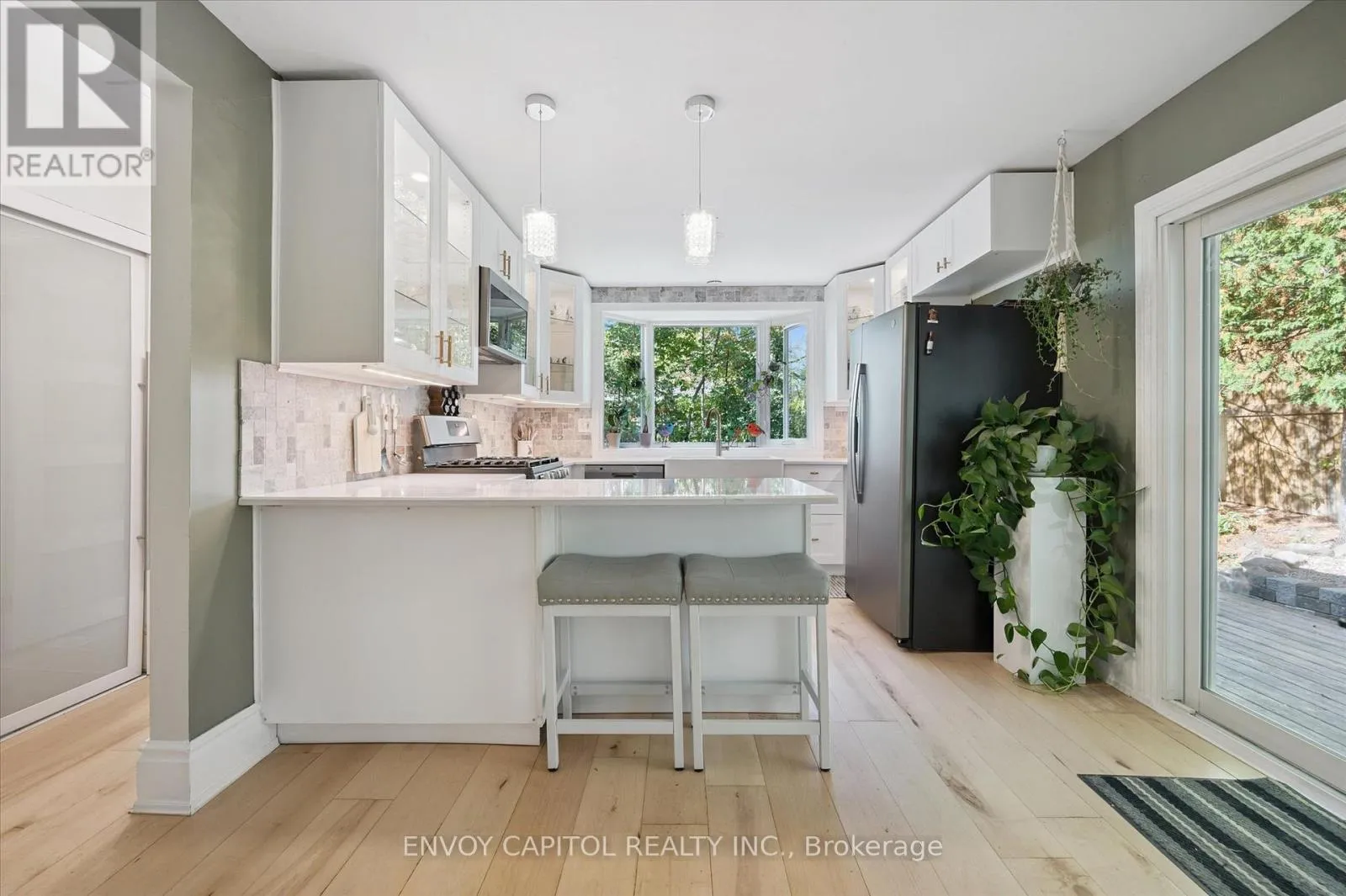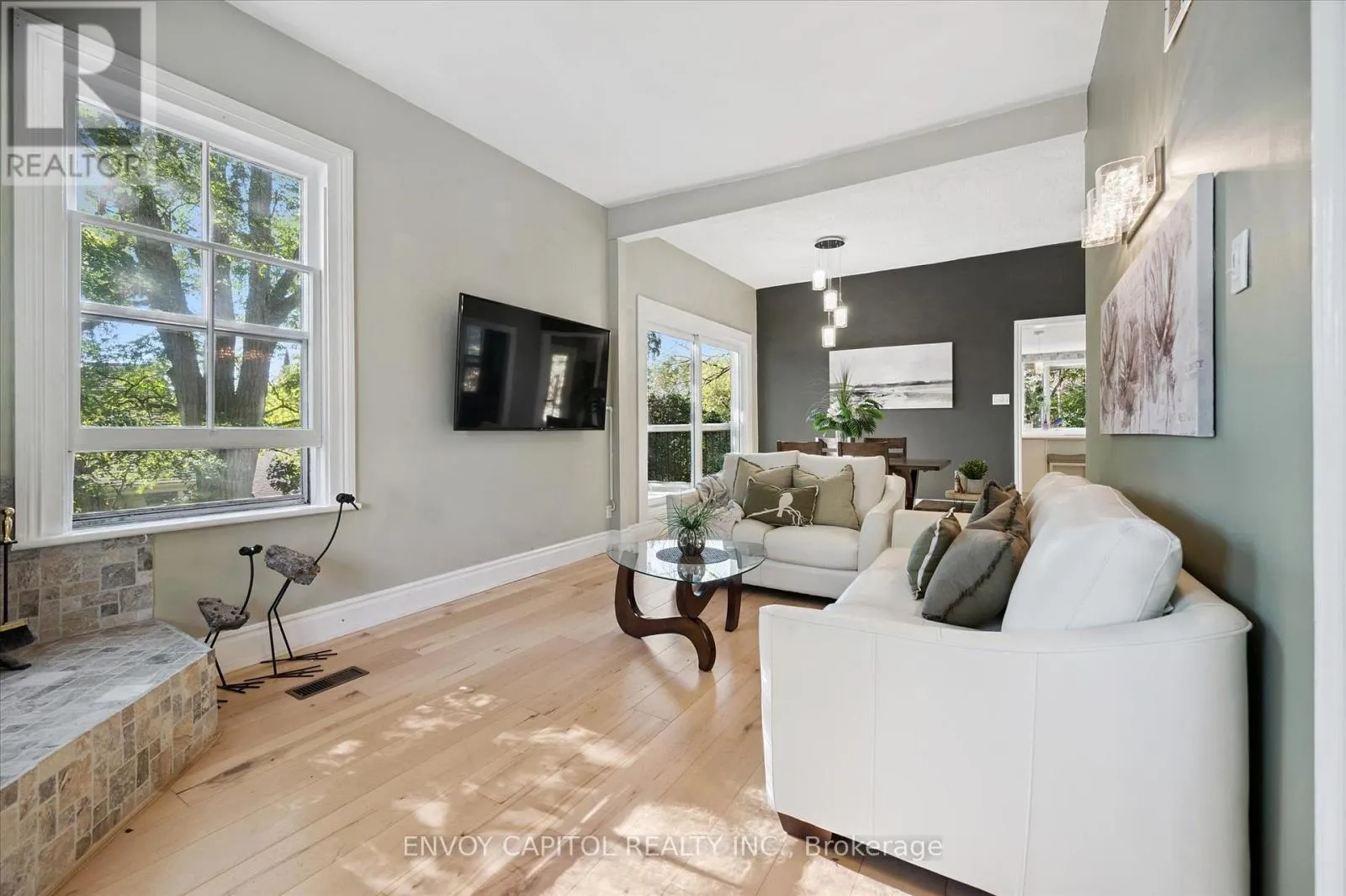 Cross Streets: King St/Eramosa Rd. ** Directions: south of King St, north of Mitchell St. Adorable circa 1875 build set on a generous and private 75' x 117' lot. The house is set on a hill and is surrounded by mature trees making this home all the more magical. Ideally located close to trendy downtown shops and dining, Speed River trails, the Go Station and a short drive to University of Guelph. The home has been lovingly renovated top to bottom and is perfect for first-timers and right-sizers. The chef inspired kitchen, complete with eat-in peninsula, gas stove, and new appliances grant easy and welcoming entertaining opportunities. Directly off the kitchen is the open concept dining and living rooms allowing for a functional and airy layout with 10ft ceilings. After dinner cozy up and enjoy the crackle of the wood stove while you relax in this welcoming space. 2 bedrooms off this area make for convenient sleeping quarters. A fully renovated bathroom with awe-inspiring walk-in glass shower completes this floor. The walkout basement is the definition of flex space in this house. An in-law suite, kids quarters, secondary entertaining space or even a potential rental income stream could be considered for this lower level retreat. Through the basement walkout, privacy abounds in the much desired greenspace that this property lends to you. With rolling hills, a large sun filled deck and a handy storage shed this property exudes charm and character! Updates: kitchen reno (23-24), furnace (25), ac (24), fencing (25), deck and stairs (24), windows/doors (24), appliances (23), washer/dryer (23), water softener (22). (id:27476)