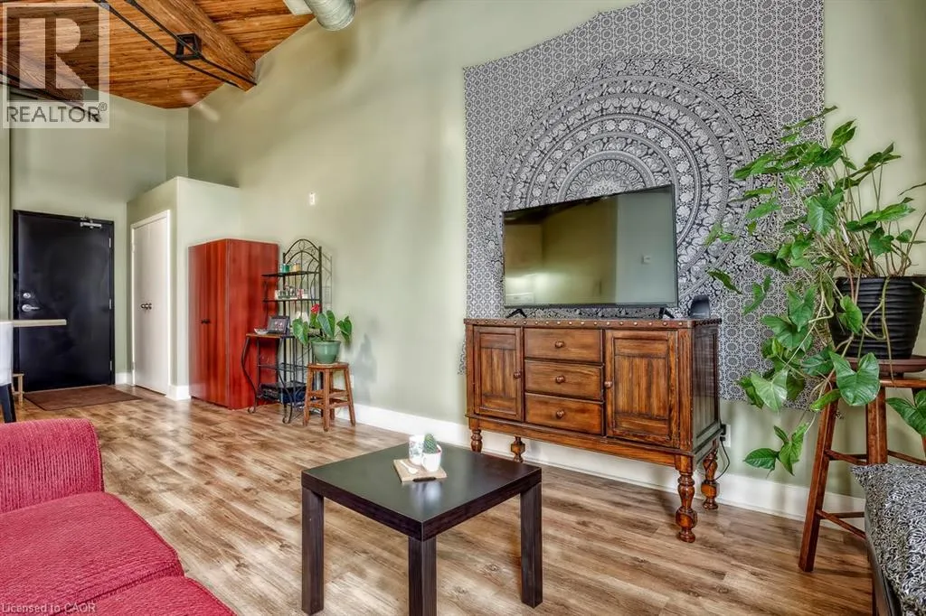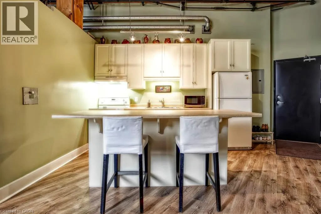 Wellington to Neeve to Ontario Welcome to the historic Mill Lofts in the heart of downtown Guelph. This charming one-bedroom condo has so much character featuring soaring ceilings, exposed brick walls, large windows and is filled with warmth and natural light. The open-concept layout offers an inviting living area, a functional kitchen and in-suite laundry for added ease. Enjoy the perks of an owned parking space, separate storage locker and heat included in your condo fees. GO Transit, restaurants, shops and parks, everything downtown Guelph has to offer, is just steps away. Ideal for commuters, first time buyers, students or anyone who loves the charm of loft living, this is your opportunity to own a piece of Guelphâs history. (id:27476)