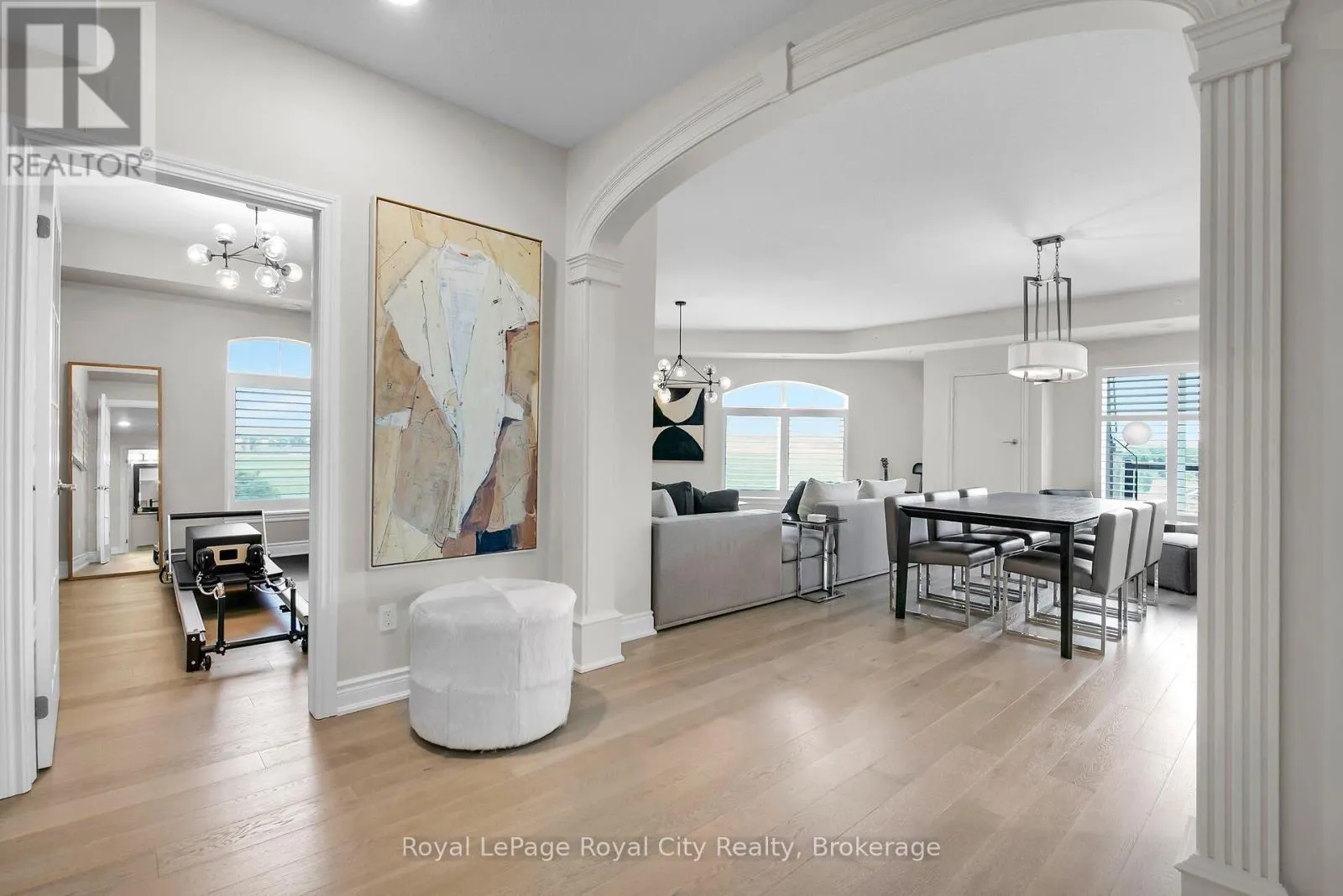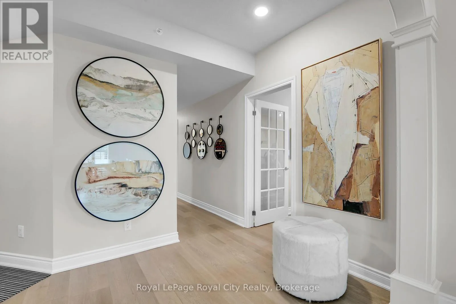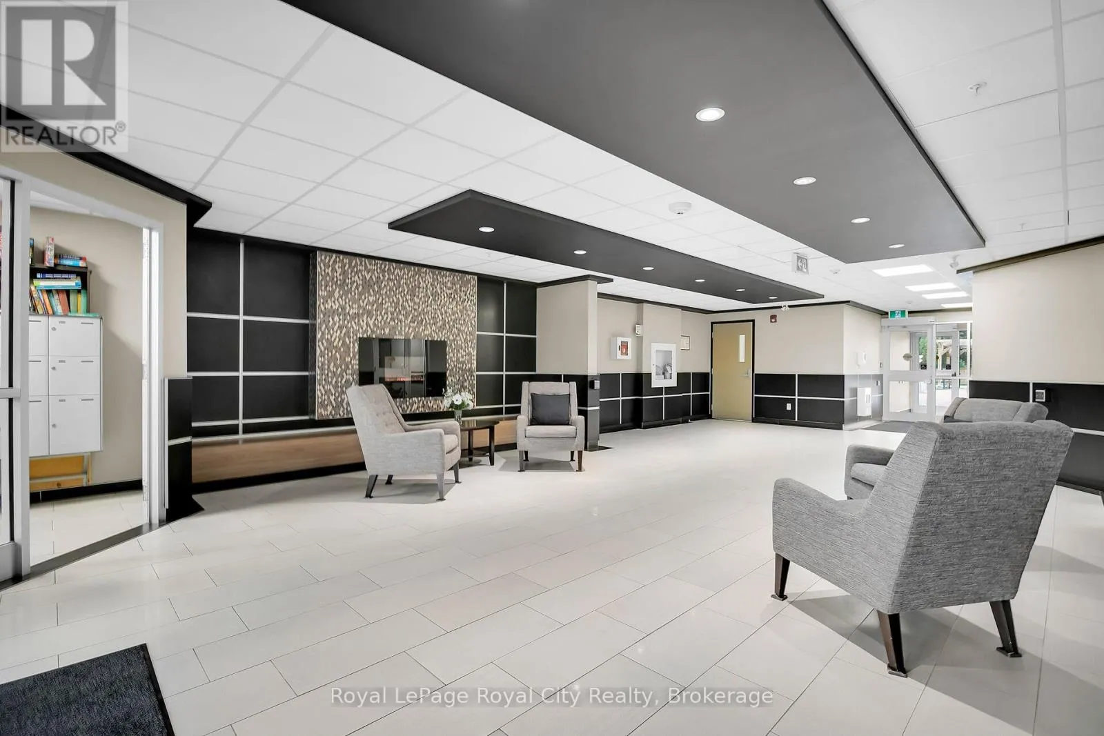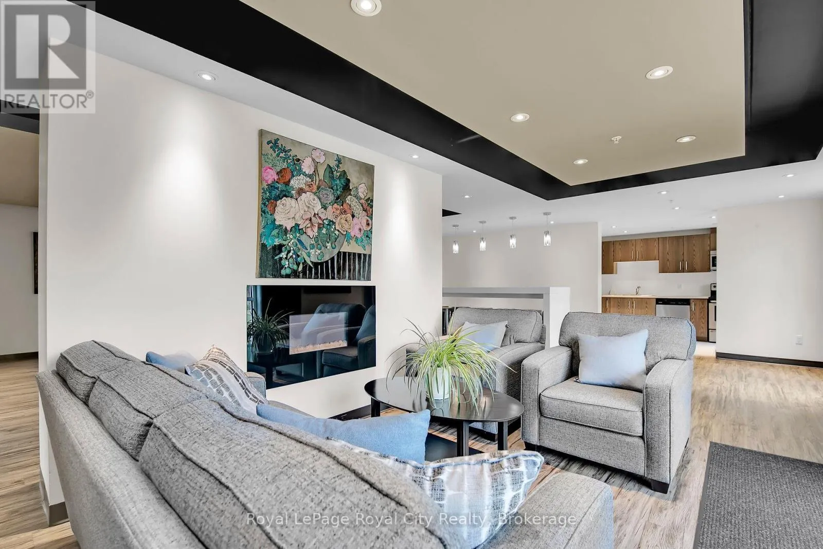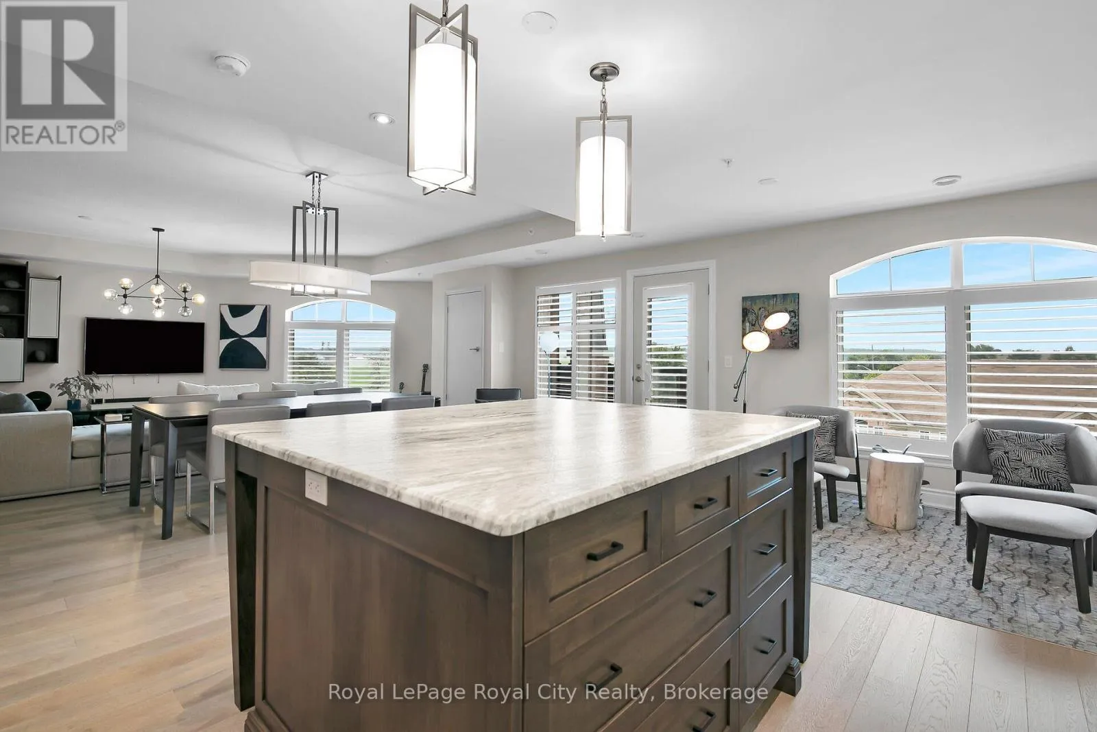 Cross Streets: Arkell & Victoria. ** Directions: Arkell Rd turn south at Victoria. Experience luxury, space, and convenience in this immaculate top-floor corner suite, offering over 2,150 sq ft of beautifully designed living. Enjoy breathtaking sunrise and countryside views from two private balconies in this spacious 2+1 bedroom, 3-bathroom home. The open-concept layout is flooded with natural light and features a chefs kitchen with granite countertops, high-end stainless steel appliances, and an oversized island perfect for entertaining. The expansive living and dining areas offer a seamless flow, ideal for both everyday living and gatherings. The primary suite is a true retreat with its own private balcony, a massive walk-in closet, and a spa-inspired 5-piece ensuite with a separate glass shower. A generous second bedroom and a bright den or home office (optional third bedroom), 4-piece main bath, 2-piece powder room, and a full laundry room round out the floor plan. This well-maintained, quiet building offers premium amenities, including a fitness room, party room with fireplace and kitchen, inviting lobby with fireplace, dual elevators, and a top-floor communal terrace with BBQs just steps from your door. Gorgeous landscaped gardens surround the property, and you'll enjoy two deeded underground parking spaces and a large storage locker. Located in Guelphs desirable south end, close to shopping, restaurants, Starkey Hill, and the University of Guelph. Shop and compare, this gorgeous home s priced to move. (id:27476)