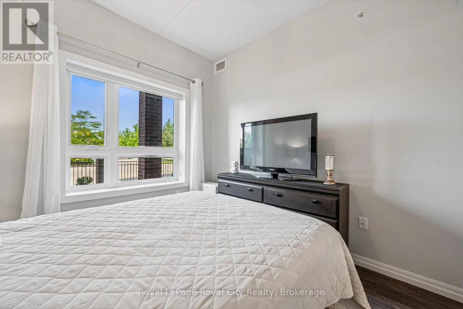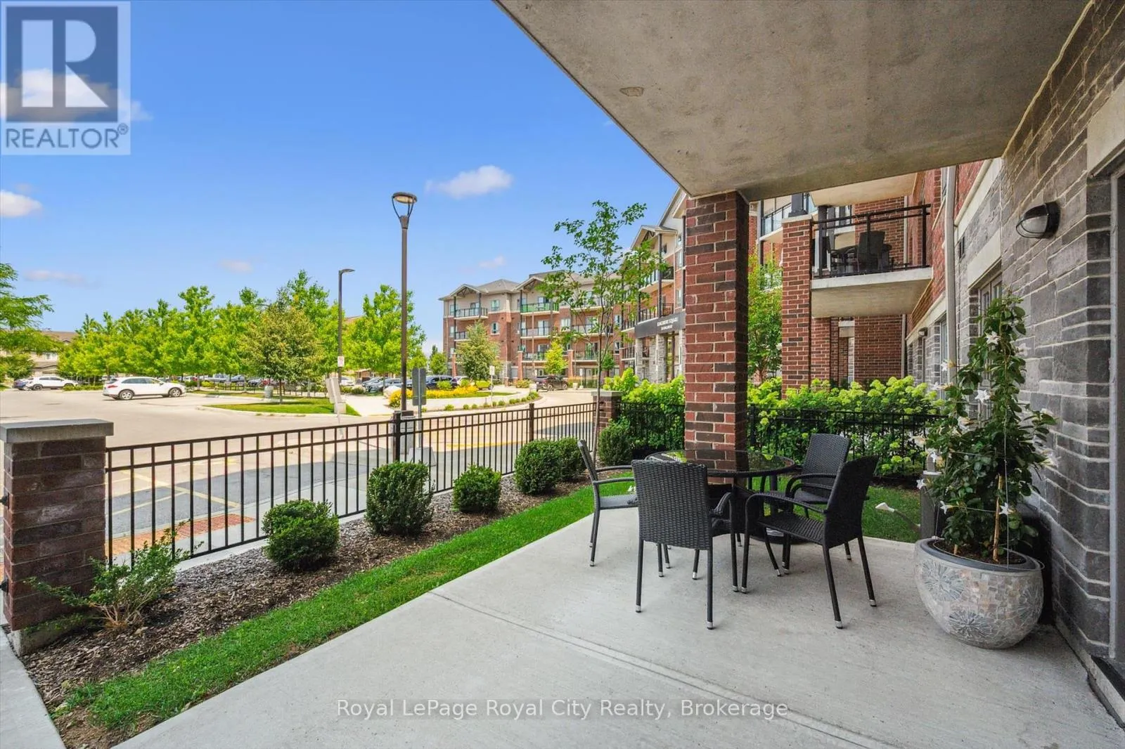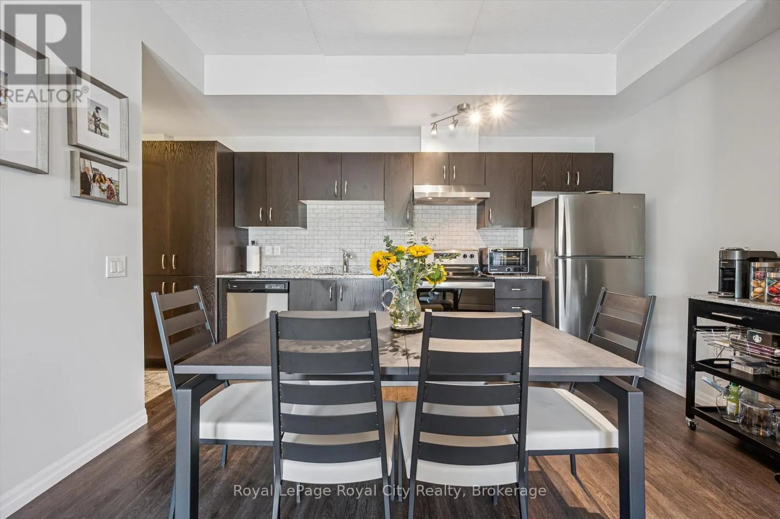 Clair Road to Samuel Drive to Kingsbury Square Welcome to #12135 Kingsbury Square - a stylish, move-in ready condo in Guelphs popular south end! This bright 2-bedroom, 2-bathroom unit has a smart split-bedroom layout, making it perfect for roommates, guests, or anyone working from home. With 852 sq ft of living space plus a covered ground-floor terrace, its a great option for dog owners, downsizers, or anyone who loves convenient main-level access. The open living and dining area features engineered hardwood and flows into a functional kitchen with stainless steel appliances, granite countertops, and a bonus built-in pantry. The primary bedroom has its own private ensuite, and the second bedroom is right next to a full bathroom - ideal for visitors or shared living. Youll also love the convenience of in-suite laundry, an owned parking space, and a dedicated storage locker. The building is beautifully maintained and located just minutes from groceries, restaurants, schools, transit, the 401, and all the amenities you need. Whether youre an end user or an investor, this unit checks all the boxes for modern, low-maintenance living in a fantastic location! (id:27476)