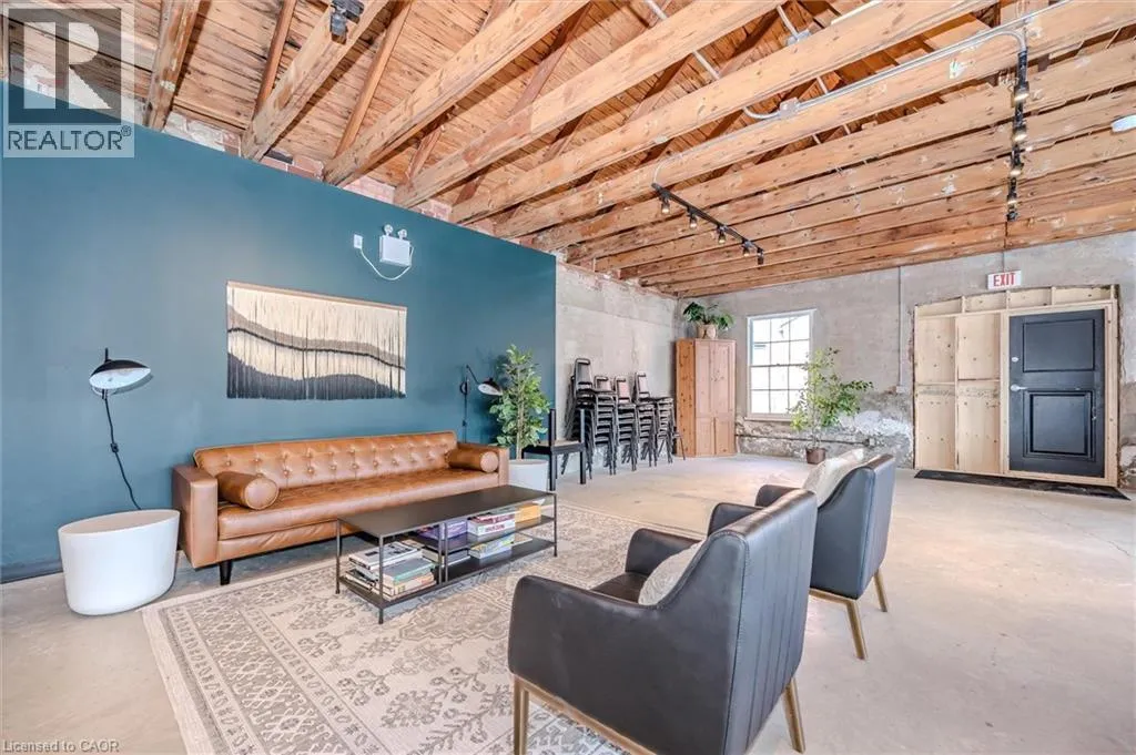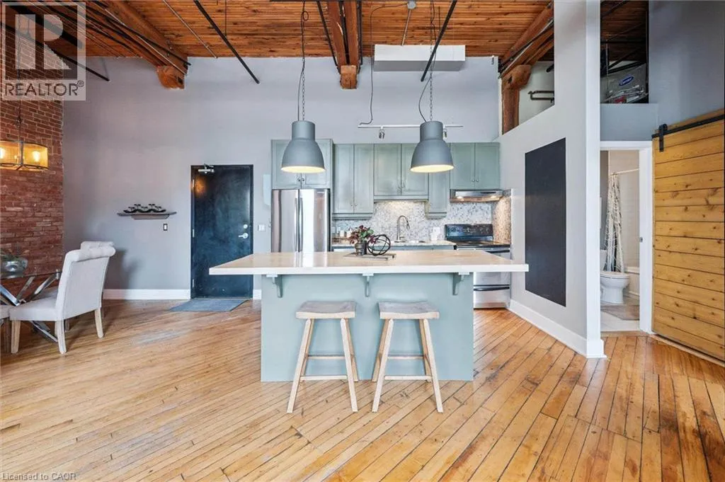 Arthur St S Discover rare industrial-loft living at 122-26 Ontario St, nestled in the luxurious Mill Lofts-formerly the historic Guelph Worsted & Spinning Company, circa 1902 & thoughtfully converted into boutique condos in 2004. This tastefully updated 2-bdrm loft offers the best of both worlds: modern luxury finishes paired W/preserved historic charm all nestled in the heart of downtown Guelph just steps from vibrant shops & cafés. Step inside & be captivated by dramatic 13ft ceilings showcasing exposed old-world wooden beams & original brick walls found in nearly every room. Oversized windows bathe the open-concept living & kitchen space in natural light, highlighting the rich hardwood floors & enhancing the warm, welcoming ambience. Sleek & sophisticated kitchen W/quartz counters, backsplash, S/S appliances & centre island W/pendant lighting-perfect for casual dining & entertaining. The adjacent dining space, graced with its own brick feature wall & designer lighting, rounds out the sociable layout. Both bdrms feature hardwood, massive windows, exposed brick & lots of closet space. Completing this home is renovated 4pcbath W/quartz counters & subway-tiled shower/tub. With only 78 units in this boutique heritage building, opportunities like this don't come up often! Unit includes in-suite laundry, 1 parking spot, locker & access to large detached party room-perfect for hosting friends & family. Main floor living means you get all the benefits of maintenance-free condo life without the hassle of stairs or waiting on elevators. Embrace the best of downtown with a highly walkable lifestyle, just steps to cafés, boutiques, dining hotspots, nightlife & GO Station. Just a few doors down from Standing Room Only, Canadas smallest bar & beloved local gem. For nature lovers, York Rd Park is right around the corner with picnic areas & sports fields, while the scenic Eramosa River Trail winds peacefully along the water-perfect for walking, running or cycling right from your doorstep. (id:27476)