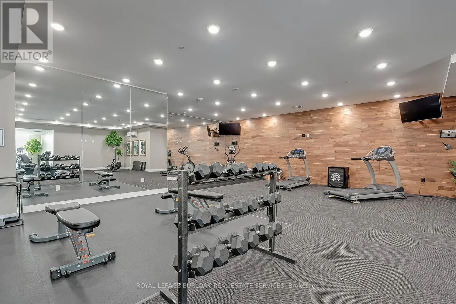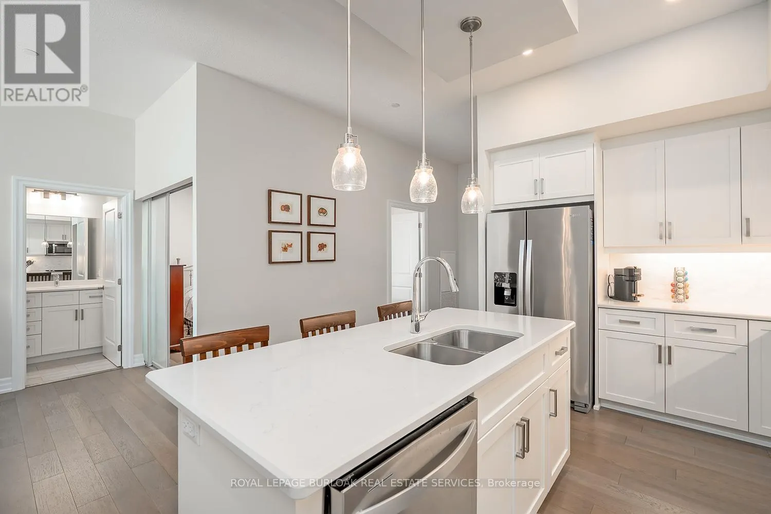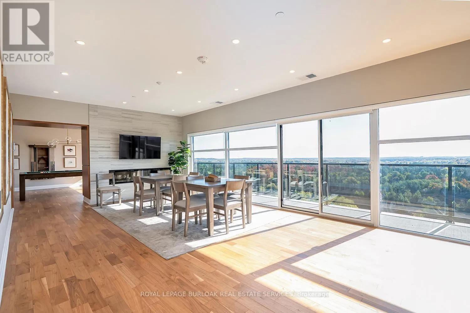 Cross Streets: Clair Rd W. ** Directions: South of Clair Road W, East of Hwy 6. Located in the heart of a vibrant community, this stunning 2 bedroom, 2 bathroom condo offers 1,464 square feet of luxurious living space and a 294 sq. ft. south facing terrace, perfect for entertaining or relaxing outdoors. Inside, 10 foot ceilings, hardwood flooring, LED pot lights, and floor to ceiling windows create a bright, elegant atmosphere. The kitchen is beautifully appointed with custom cabinetry, quartz countertops, an eat at island, Whirlpool stainless steel appliances, a custom backsplash, under cabinet lighting, and two double pantries. The open living/dining area features an electric fireplace, accent wall, and walk out to the terrace. The primary suite offers floor to ceiling windows, a custom walk in closet, and a spa like ensuite with double vanity, heated floors, and a glass shower with floor to ceiling tile. The second bedroom includes a double closet and frosted glass doors, while the main bath features a quartz topped vanity, soaker tub, and heated floors. A spacious laundry room with built in cabinetry provides excellent storage. Residents enjoy top tier amenities such as a golf simulator, games and party room with stunning views, exercise room, and elegant lobby. Steps to restaurants, shops, and entertainment, and minutes from Springfield Golf & Country Club. Includes two parking spaces (P2 #24 and #90) (id:27476)