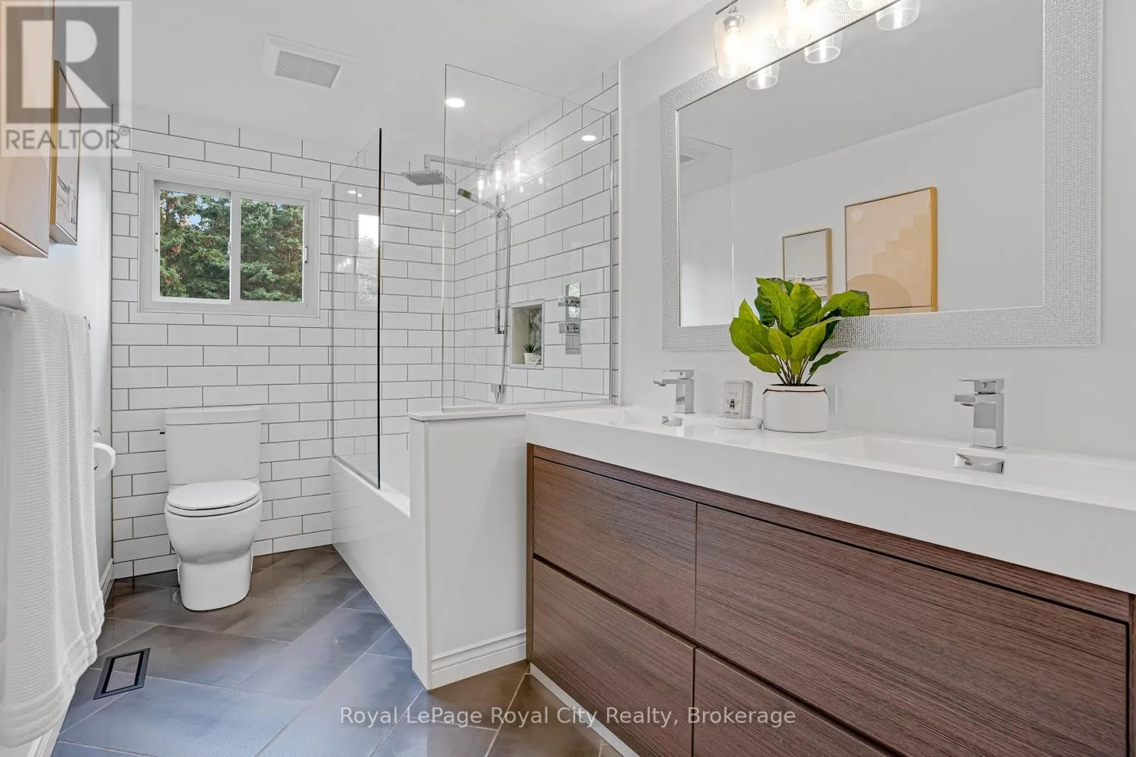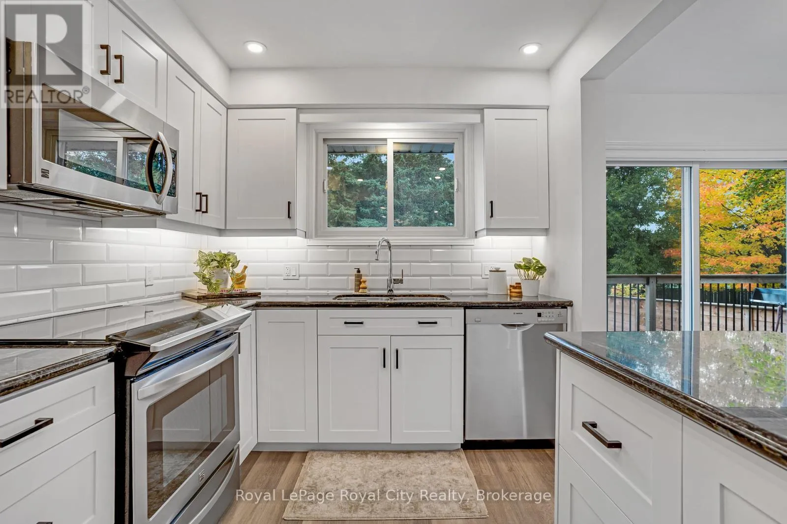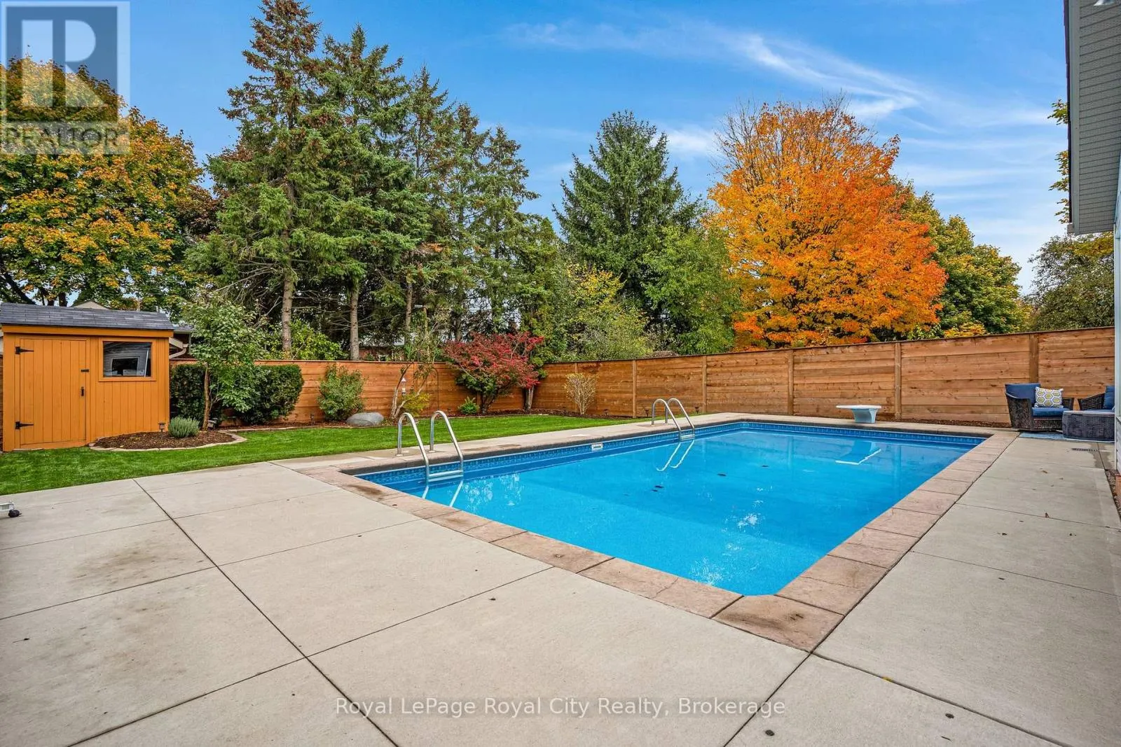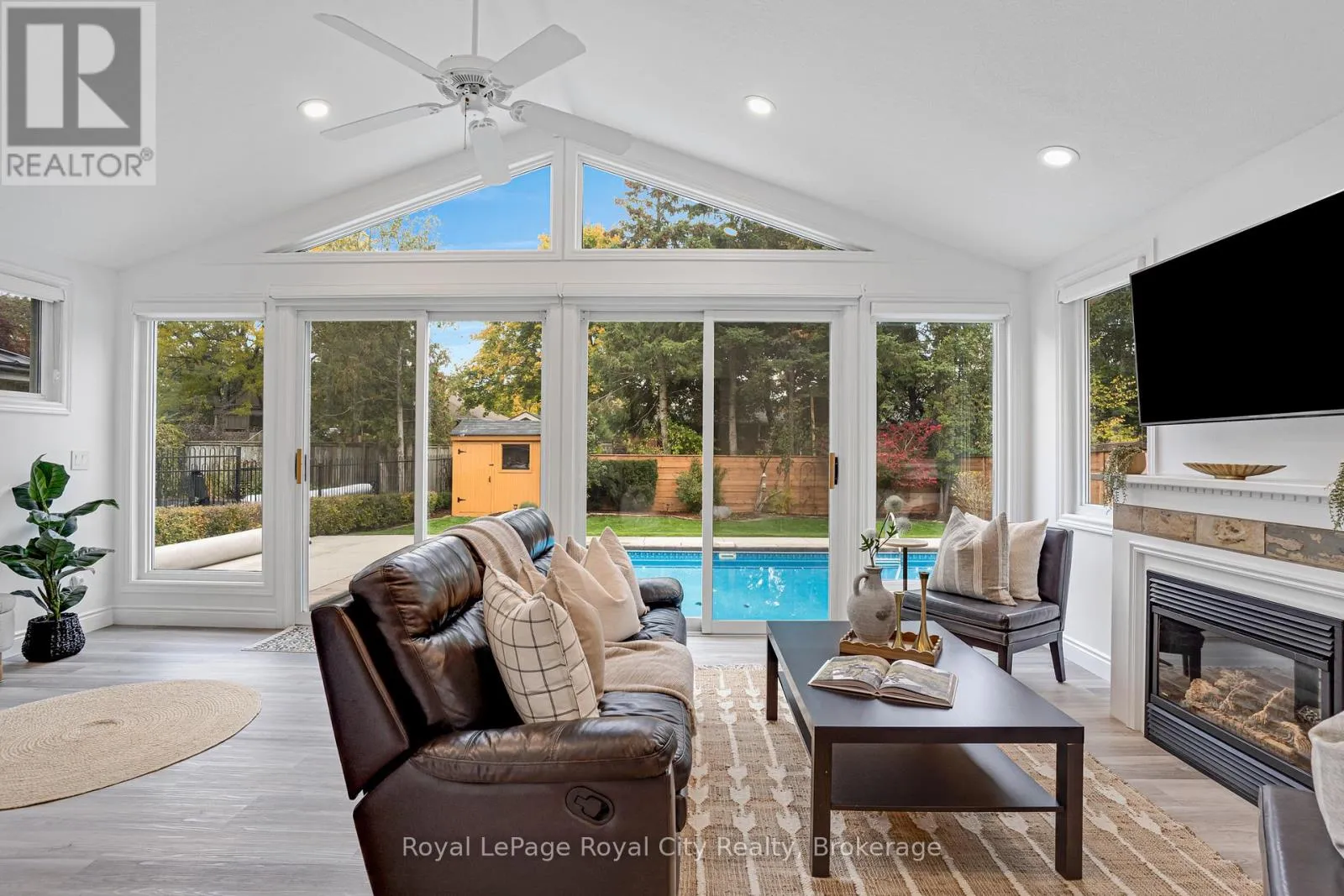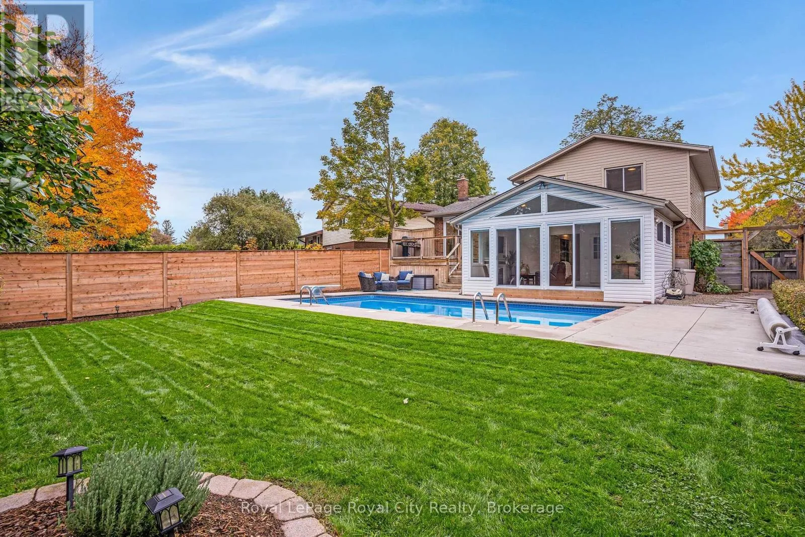Cross Streets: Hanlon Pkwy/College Ave W. ** Directions: Devere Dr to Lambert Cres. Tucked away at the back of Lambert Crescent, this tastefully updated sidesplit is move-in ready. From the moment you walk in the door the bright sunroom immediately catches your eye, offering vaulted ceilings, a cozy gas fireplace and heated floors, all with a view of the 16 x 32 heated inground pool. The main floor will continue to impress you with the open layout highlighted by a modern white kitchen, a dining space that opens to the deck with pool views, and a comfortable living area designed for relaxing or entertaining. The upper level includes 3 bedrooms and an updated 5-piece bathroom featuring a stunning tiled glass shower, double sinks, and in-floor heating. Built-in dresser drawers and shelving have been added to the primary bedroom, combining style with smart storage solutions. The finished basement provides yet another versatile living space that could serve as a family room, workout area, or home office. This level also showcases a fully renovated 3-piece bathroom. Whether it's summer pool parties or quiet evenings by the fire, this home offers the perfect setting for making memories. (id:27476)