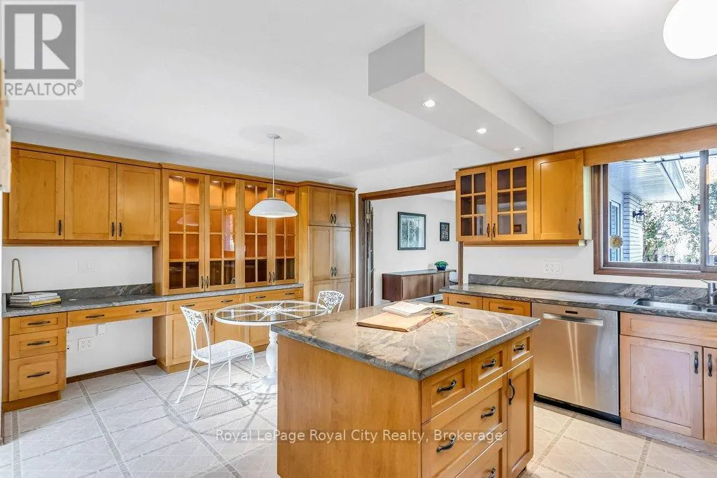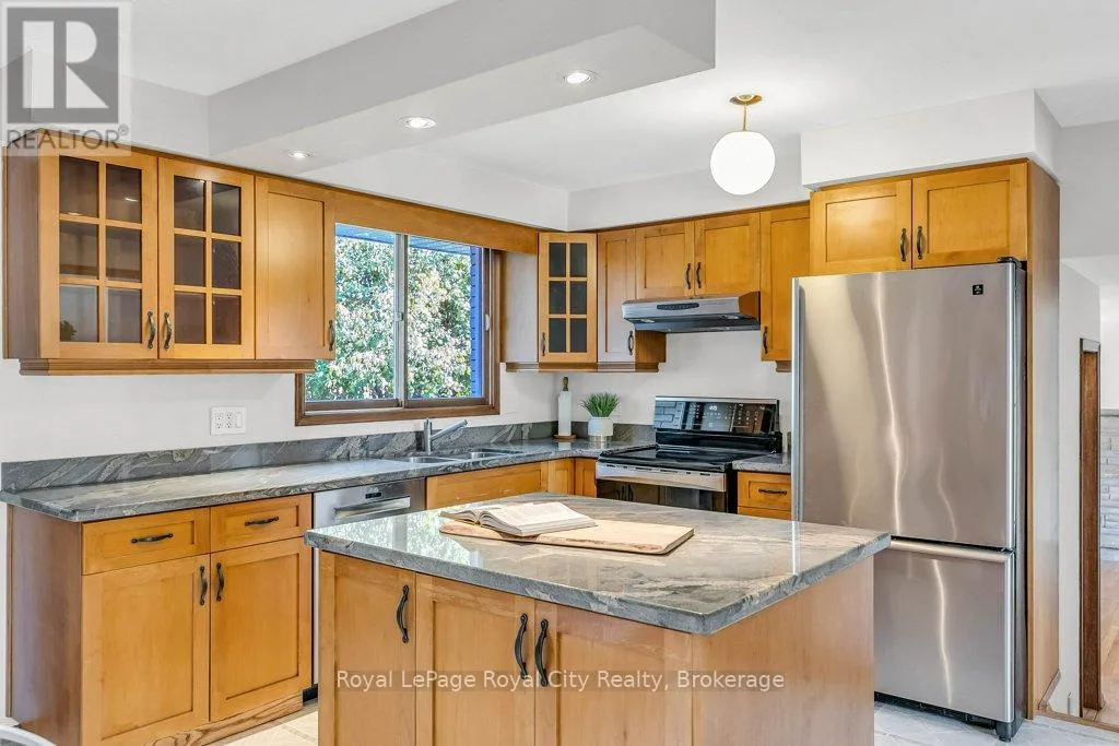 Cross Streets: Rickson Ave. ** Directions: Keats Cr. west of Rickson. Location, Space, and Charm in South Guelph! Set in one of South Guelph's most established neighbourhoods, this spacious 1,780 sq. ft. side-split is the perfect family home. Designed for living and growing, it offers 3 large bedrooms and 3 bathrooms in a bright, open-concept layout filled with natural light. The main floor is inviting, featuring hardwood floors and a living room that flows seamlessly into the dining area. A quality builder-completed addition (Brombal) includes the dining room, which opens through patio doors to a sunny deck-ideal for entertaining. The kitchen boasts granite counters, wood cabinets, and stainless steel appliances & island. Down a few steps, the cozy family room features a classic wood-burning fireplace and a sliding door leading to the private, fenced backyard-perfect for kids and pets. The thoughtfully finished basement extends your living space with a Rec room and a flexible bonus room (ideal for a home office or potential 4th bedroom). Surrounded by mature trees on a quiet street, this home is just steps from schools, Preservation Park, and scenic trails. It combines comfort and convenience, with the University of Guelph, Stone Road Mall, and easy 401 access only minutes away. (id:27476)