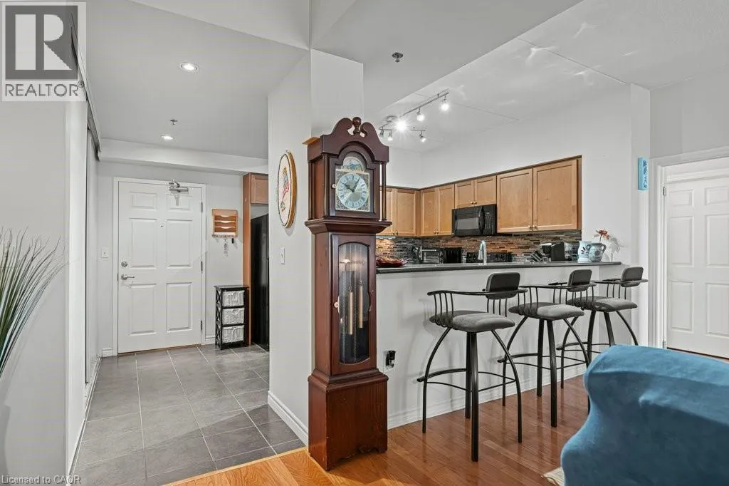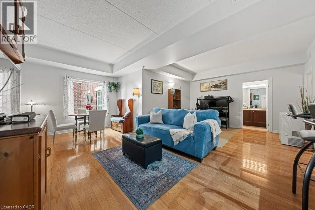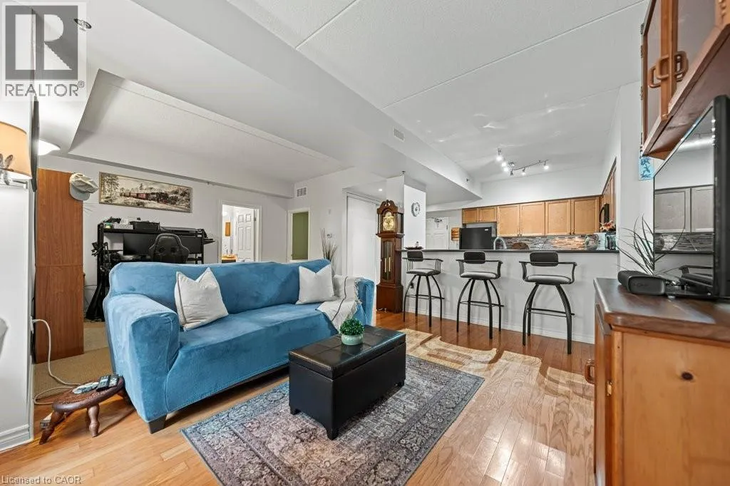 Grange Rd to Watson Parkway North Sitting at over 1,100 sq ft, this one-bedroom plus den easily functions as a two-bedroom unit, features two bathrooms, and comes with an underground parking spot and storage locker. An inviting entranceway leads to the spacious kitchen, featuring ample cabinets, counter space, and a breakfast bar. Hardwood flooring in the living room, dining room, and leading into the primary bedroom, featuring a private covered balcony, walk-in closet, and ensuite bath with a stand-up shower and separate soaker tub. The den is being used as a second bedroom and also has hardwood floors and easy access to the second bathroom. In-suite laundry and low condo fees which includes water (centrally softened), make this super affordable living. The location features amazing walking trails, great schools, and parks! (id:27476)