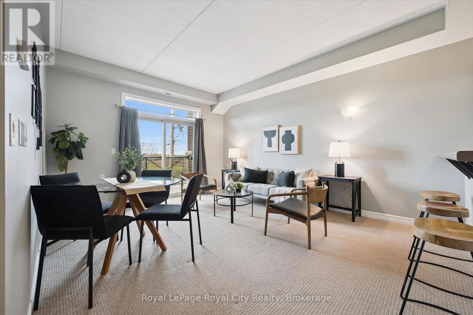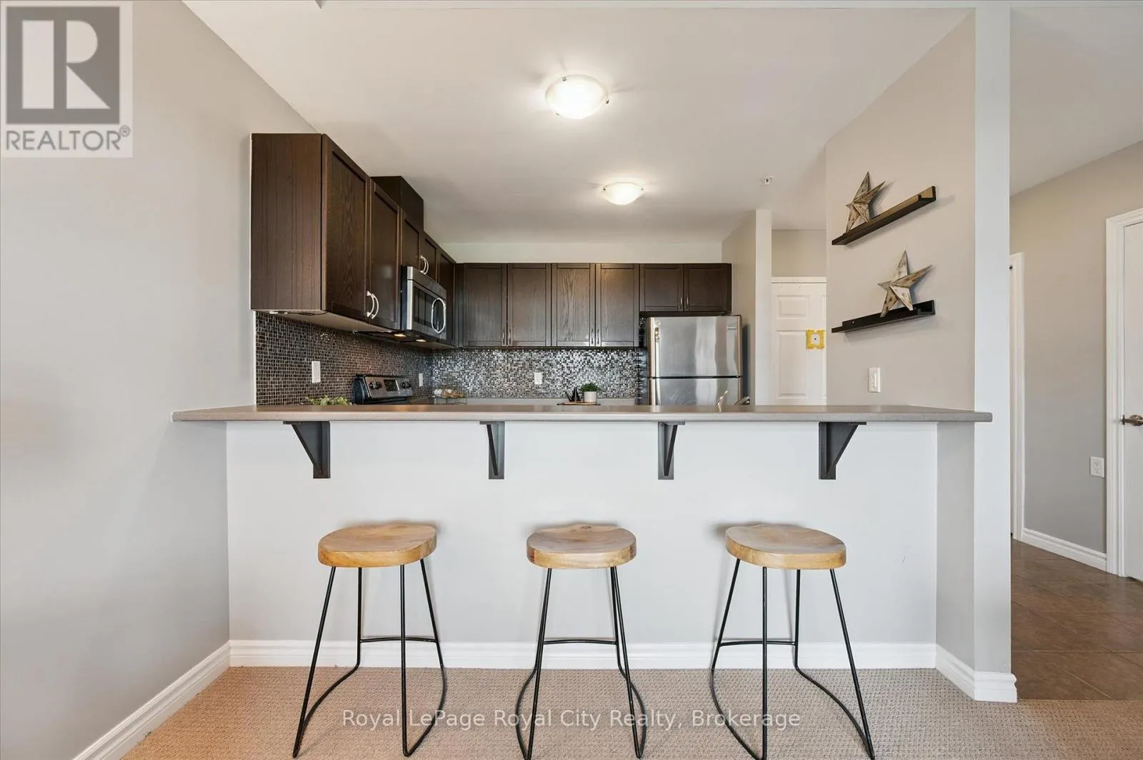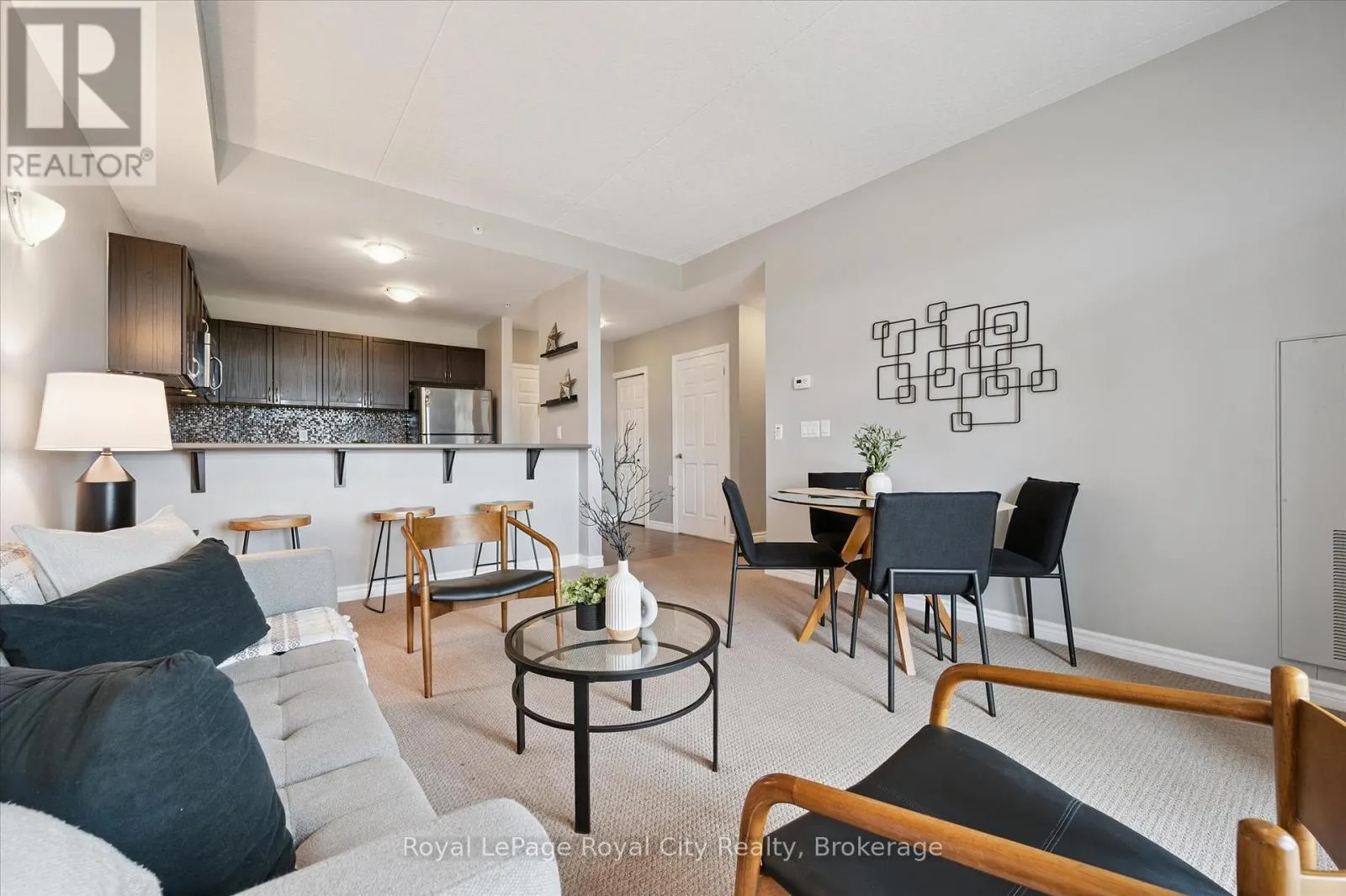 Cross Streets: Arkell Rd. ** Directions: East on Arkell Rd.......South on Colonial Dr. Step into homeownership with this stylish, move-in-ready condo in the sought-after South End of Guelph. Featuring soaring 9-foot ceilings and a bright, open layout, this spacious apartment offers everything you need for modern living. The kitchen is beautifully appointed with rich dark cabinetry, a tiled backsplash, and a handy breakfast bar perfect for casual meals. The open living room provides a welcoming space to relax, while offering a large sliding door to bring in plenty of natural light. Step out onto your private balcony and enjoy the great views. The two-bedroom layout includes a comfortable primary suite with a private ensuite and a second bedroom, which could be used as an office as well. This well-maintained building offers great amenities, including a fitness centre, party room, and secure underground parking. Plus, this unit comes with two parking spaces, giving you extra flexibility and value. Close to shopping, restaurants, transit, and everyday essentials. A perfect first home or investment property, affordable, convenient, and ready for you to move in. Book your showing today! (id:27476)