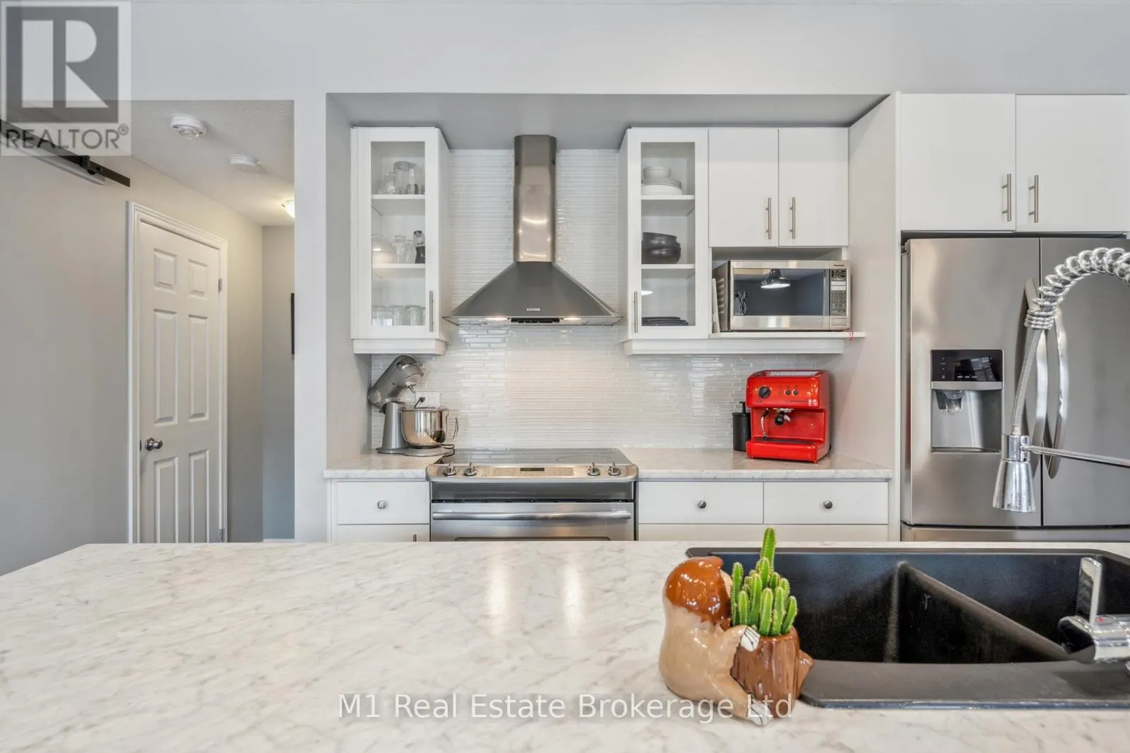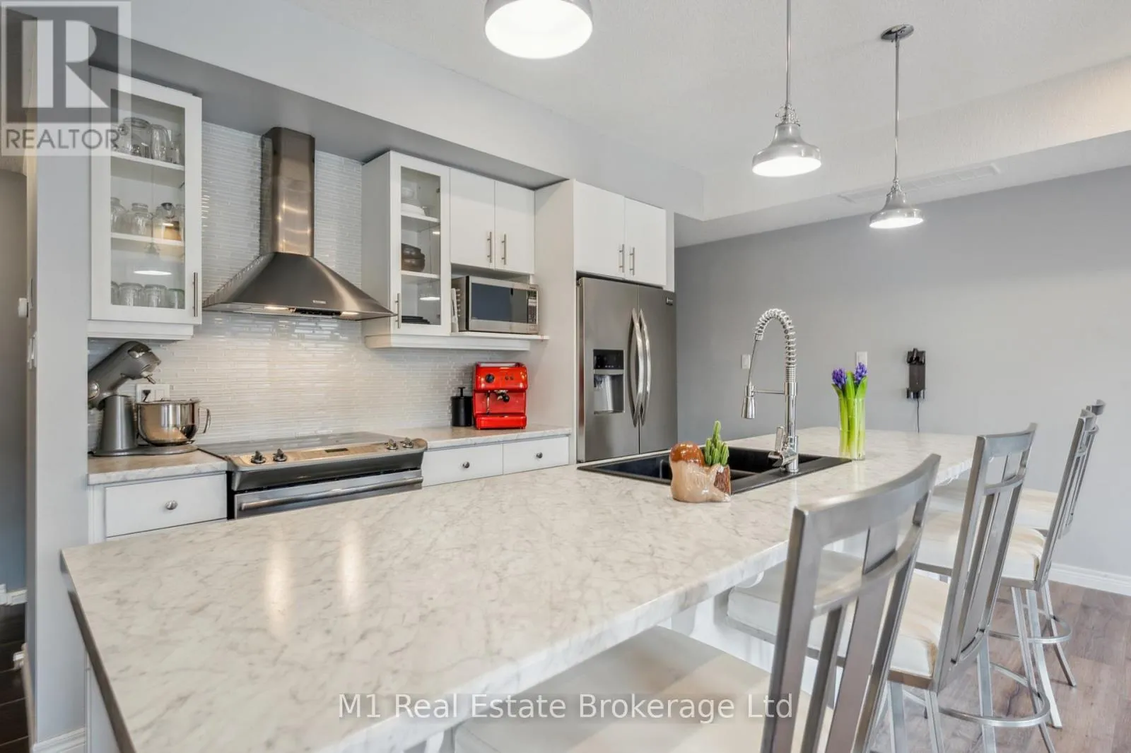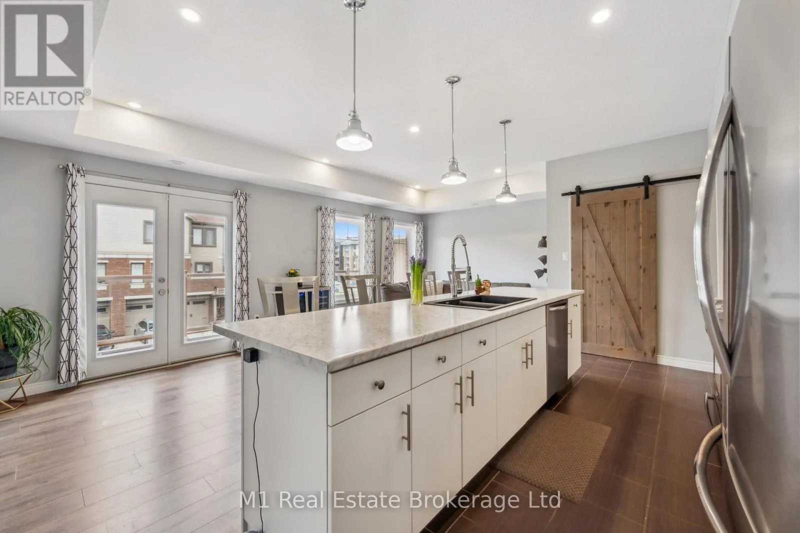 Cross Streets: Poppy Drive. ** Directions: From Clair Rd E, turn on Dallan Rd and right on Kay Crescent. A rooftop terrace and two parking spots are just the beginning of what makes this modern 2-bedroom, 1.5 bathroom townhome so special. Located in Guelph's highly sought-after South End, this bright and stylish home perfectly blends comfort, convenience, and contemporary design.The open-concept kitchen is a true showstopper, featuring an extended breakfast bar, sleek finishes, and a charming barn door pantry that adds both character and storage. Upstairs, unwind on your private rooftop terrace or one of two additional balconies, perfect spots for morning coffee, entertaining friends, or relaxing under the stars.With spacious bedrooms, modern bathrooms, and thoughtful details throughout, this home offers low-maintenance living in a vibrant, connected community. Two dedicated parking spots add extra convenience and value. Close to parks, schools, shopping, and commuter routes, this home truly has it all. Don't miss your chance to make this South End gem your own! (id:27476)