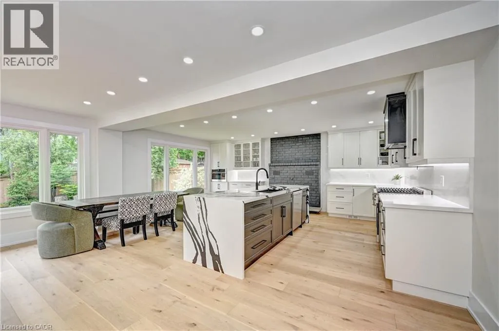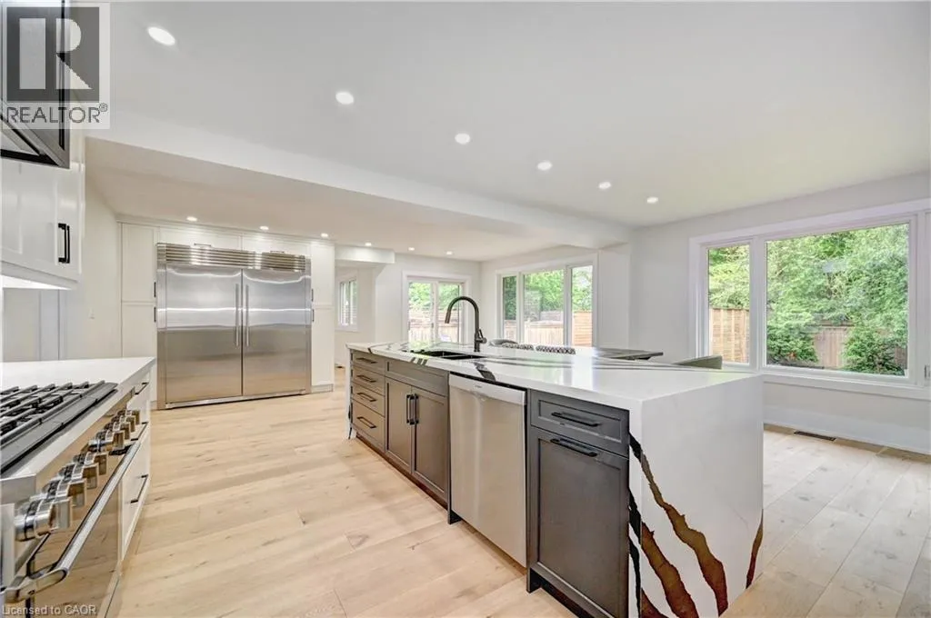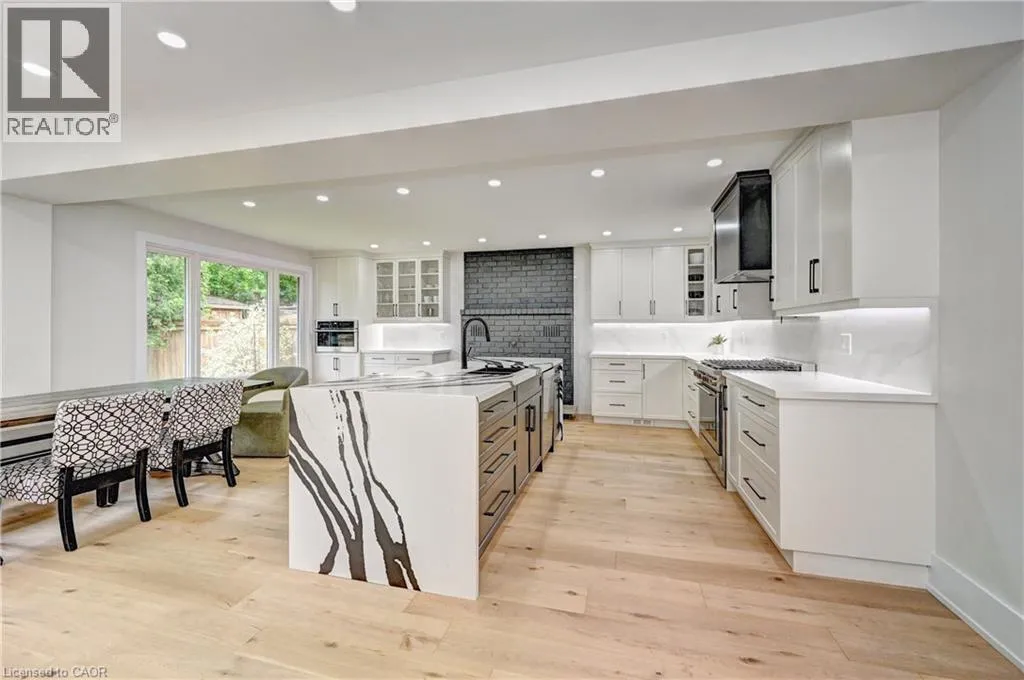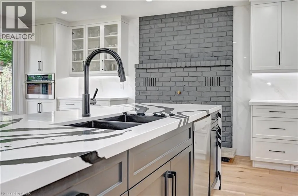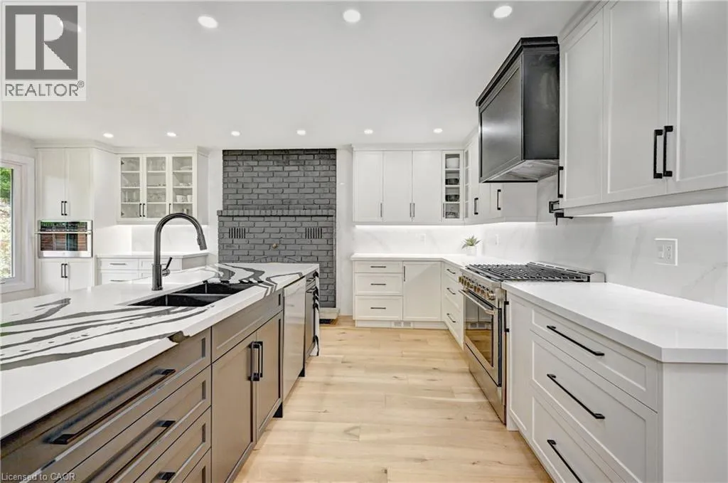 Elmira Road South and Stephanie Drive Beautifully updated home offering exceptional curb appeal with a neutral cream brick exterior, modern front door, concrete driveway, and double car garage. Inside, youâll find a spacious layout designed for both everyday living and entertaining. The heart of the home is the chef-inspired kitchen, fully upgraded in 2024, featuring a side-by-side refrigerator and freezer, six-burner gas stove with pot filler, built-in microwave, quartz countertops and backsplash. The main floor has beautiful engineered hardwood and ceramic flooring throughout, the striking wood staircase with glass railing, also updated in 2024, sets a modern tone. Convenient main floor laundry with a gas dryer adds everyday functionality. Upstairs, retreat to the oversized primary suite complete with a walk-in closet and spacious ensuite bath. Generously sized bedrooms and bathrooms provide comfort for the whole family. The fully finished basement extends your living space with endless possibilities for a future home theatre, gym, office, or play area. Step outside to your private backyard oasis! Enjoy a stamped concrete patio, a deck with privacy wall (2023), a hydro pool, gas line for barbecue and future fire pit, and a fully fenced yard (2020). The roof was replaced in 2019, offering peace of mind for years to come. This home blends timeless charm with modern updatesâtruly a must see! (id:27476)