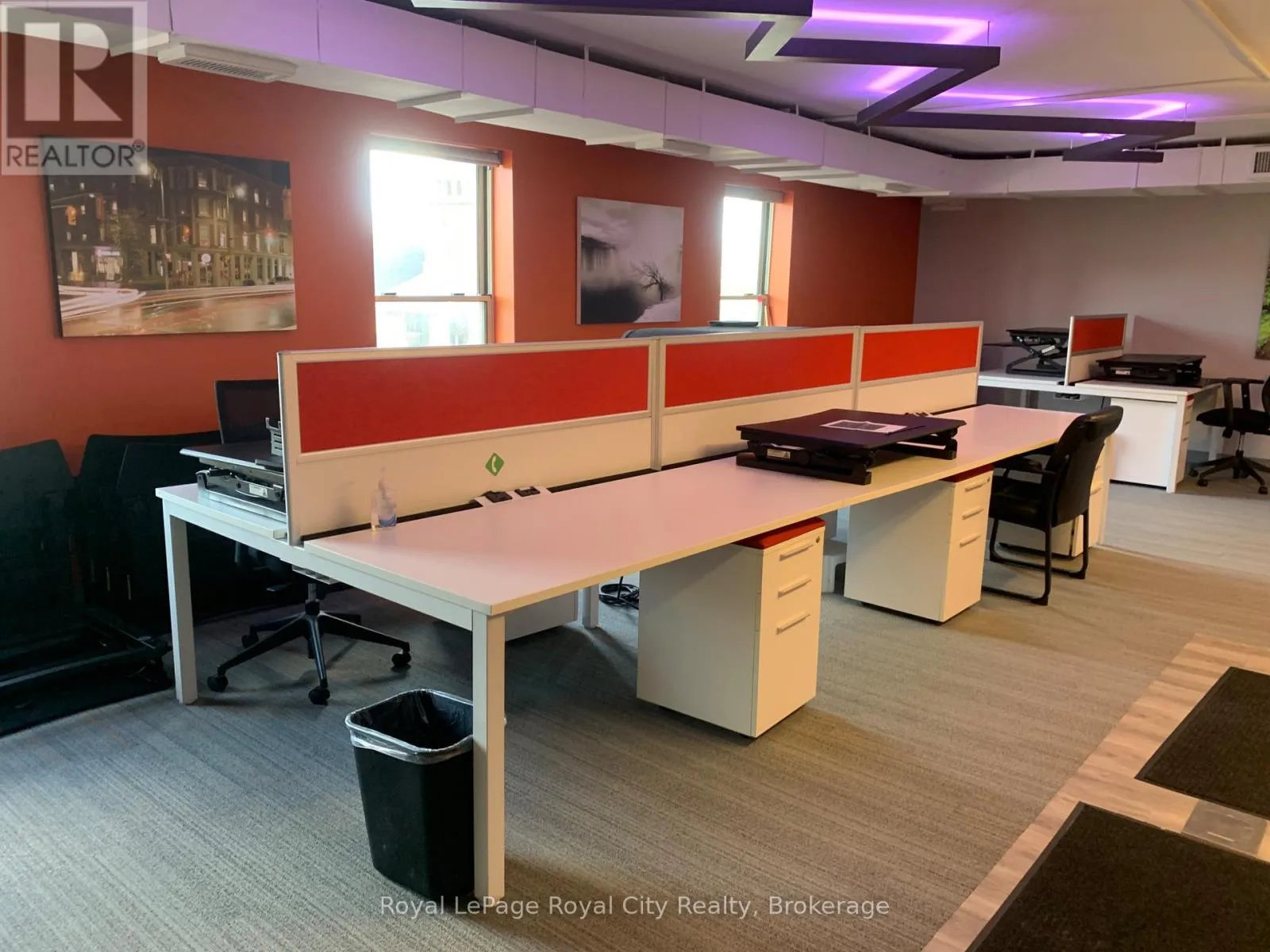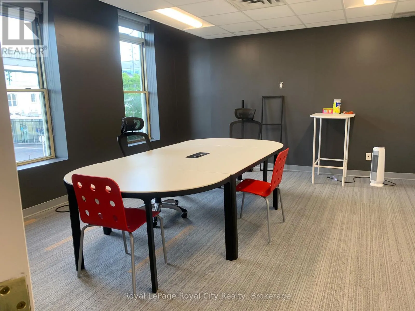 Cross Streets: Carden. ** Directions: call listing agent. Welcome to this beautiful second-floor professional office space, a bright and modern workspace in the heart of Downtown Guelph. This completely renovated suite features sleek, glass-walled offices, creating a modern and open feel. The layout includes individual offices and a dedicated boardroom, perfect for meetings and collaboration and flexible open space. The space also boasts shared full kitchen with a fridge and dishwasher, ample closet space, and modern washrooms, including a convenient shower room for bike commuters. The location can't be beaten, with Planet Bean Coffee shop on the main floor, directly across from City Hall, and kitty-corner to the GO station. Plus, you'll have access to a spectacular 869-square-foot rooftop patio, offering an ideal spot for breaks or entertaining. This is an exceptional opportunity to lease a truly unique and highly functional office in a prime downtown location. (id:27476)