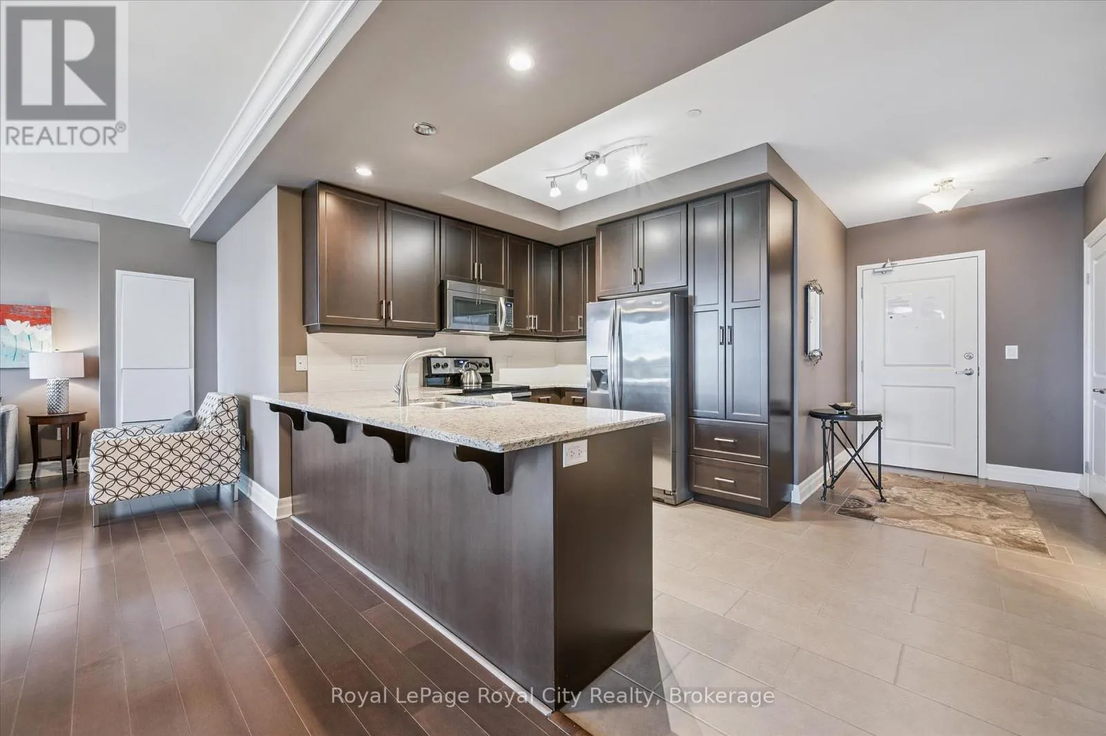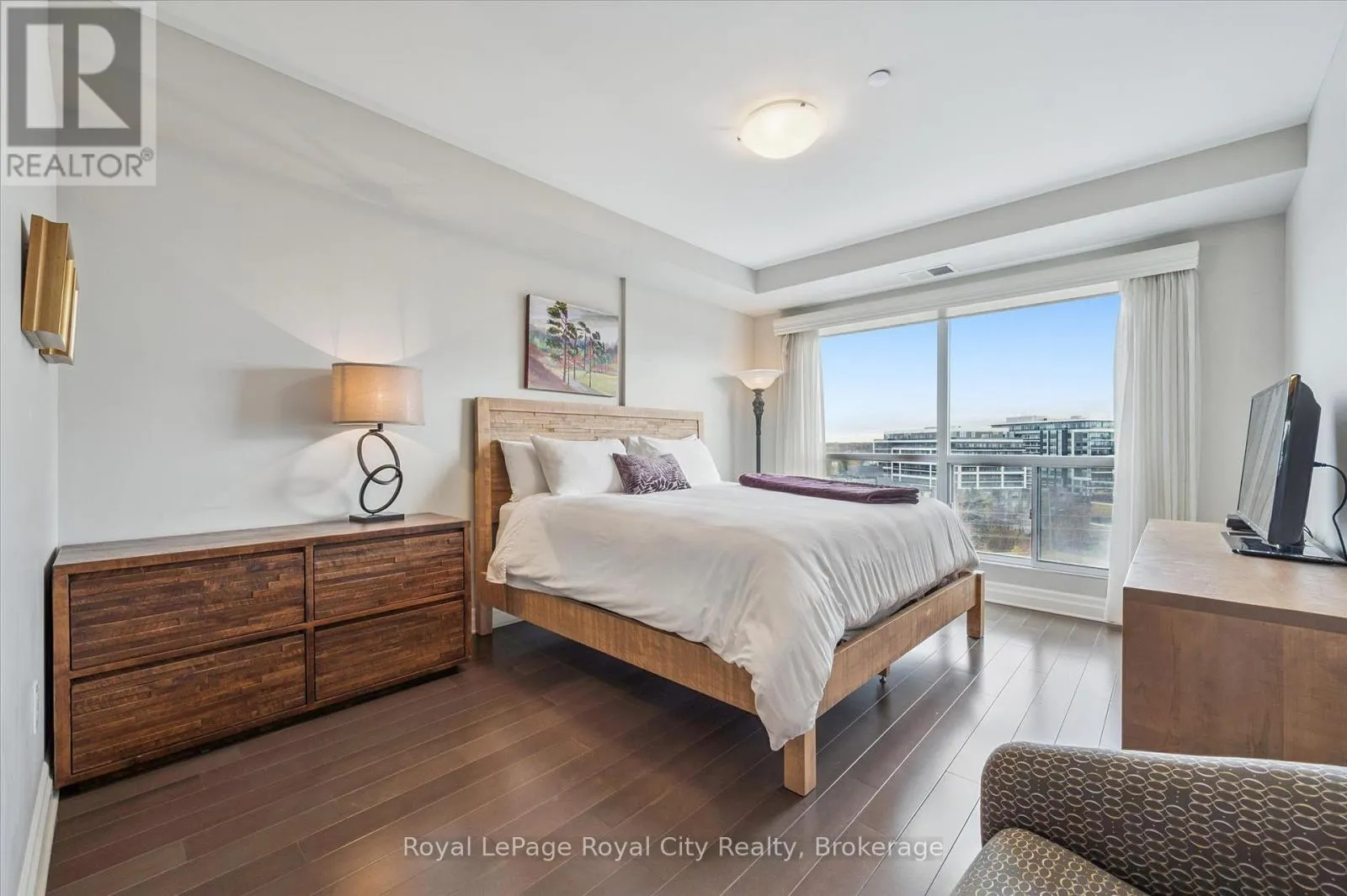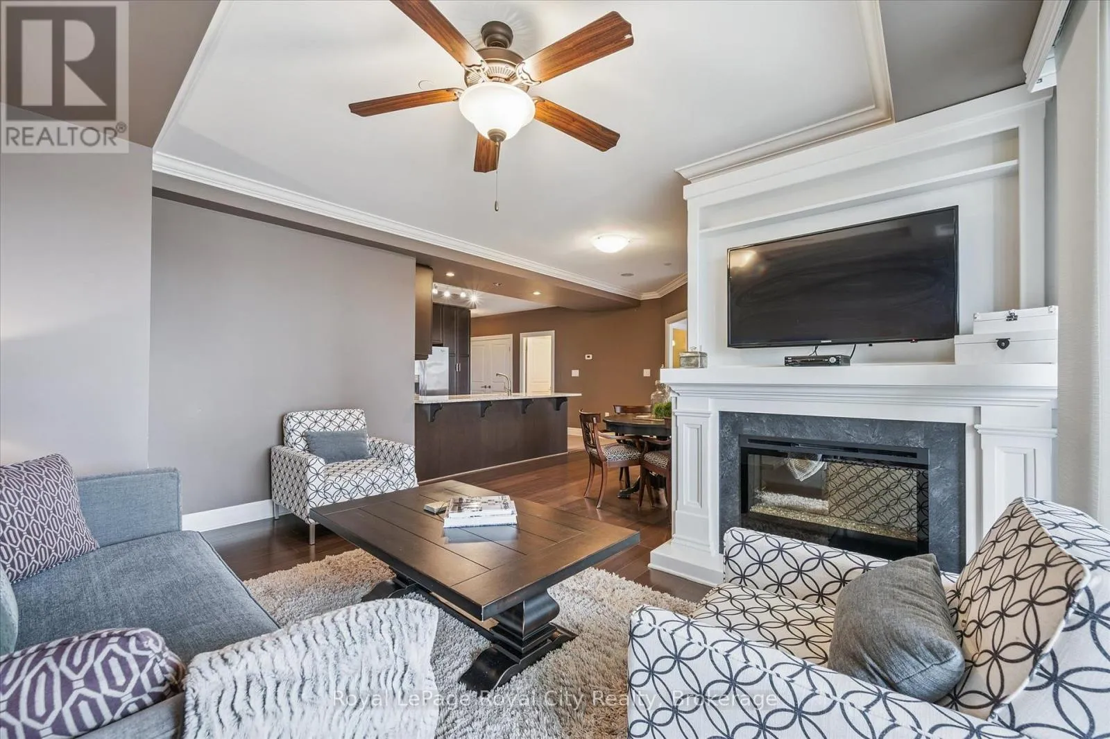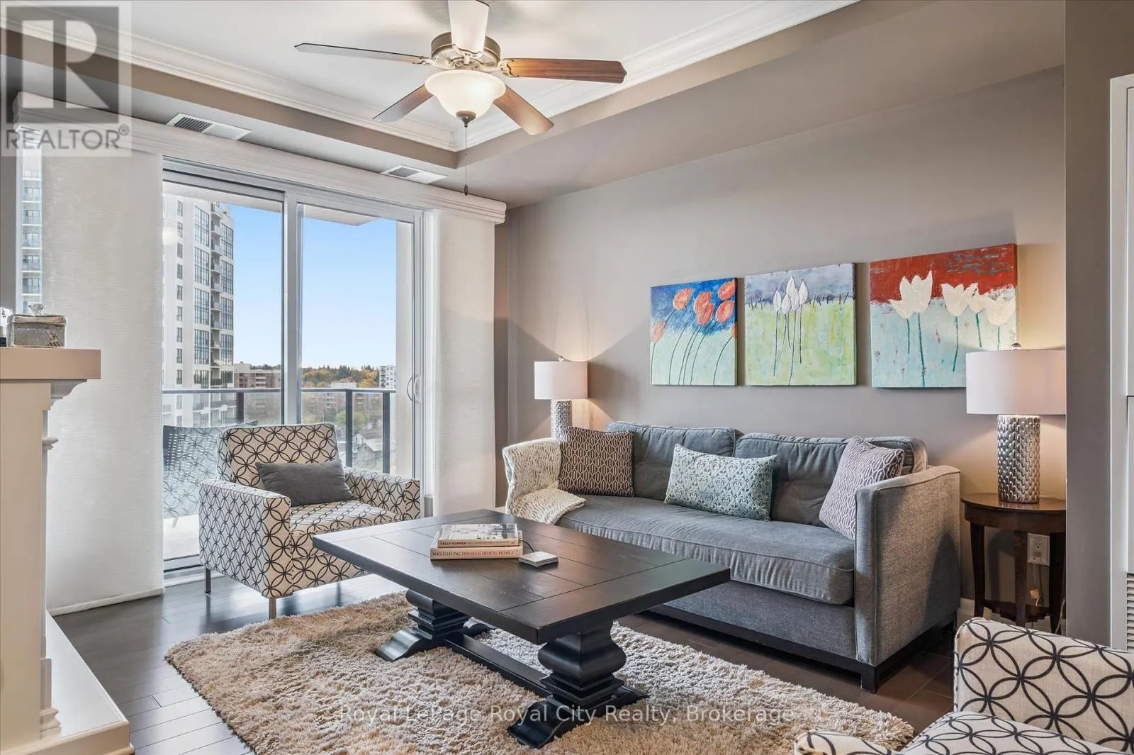 Cross Streets: MACDONELL STREET AND WOOLWICH STREET. ** Directions: At the corner of Macdonell and Woolwich Street. Parking available around the rear of building in East Parkade. Welcome to RiverHouse, one of downtown Guelph's most sought-after condominium residences. This stylish turnkey suite pairs luxury finishes with an urban lifestyle just steps from the GO station, Sleeman Centre, Speed River and the city's best shops, dining, and downtown amenities. Inside, the open-concept layout is bright and inviting, with large windows and a private balcony showcasing panoramic city views. The kitchen features rich espresso cabinetry, granite countertops, stainless steel appliances, and an island with bar seating that flows seamlessly into the living and dining area. The living room offers elegant crown moulding, a fireplace feature, and sliding doors to the balcony - an ideal space for morning coffee or relaxing above the city. Both bedrooms are generously sized, with the primary suite offering floor-to-ceiling windows, a walk-in closet, and a spa-like ensuite with a glass-enclosed shower and stone vanity. A second full bathroom with a frameless glass shower serves guests and the secondary bedroom. Additional highlights include in-suite laundry, 2 underground parking spaces with an EV rough-in set up for future installation and a storage locker. RiverHouse provides a refined lifestyle with amenities such as a fitness centre, party room equipped with a bar/lounge, large outdoor terrace, and guest suite, all within a secure and well-managed building. A rare opportunity to experience upscale condominium living in the heart of Guelph's vibrant downtown core. All furniture can be purchased, see realtor remarks for further details. (id:27476)