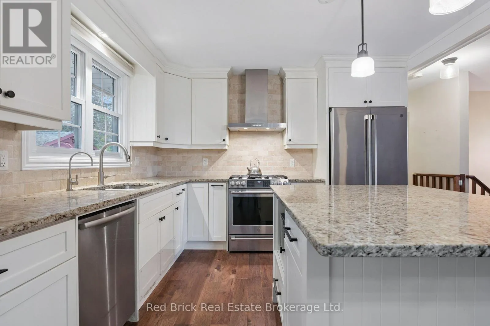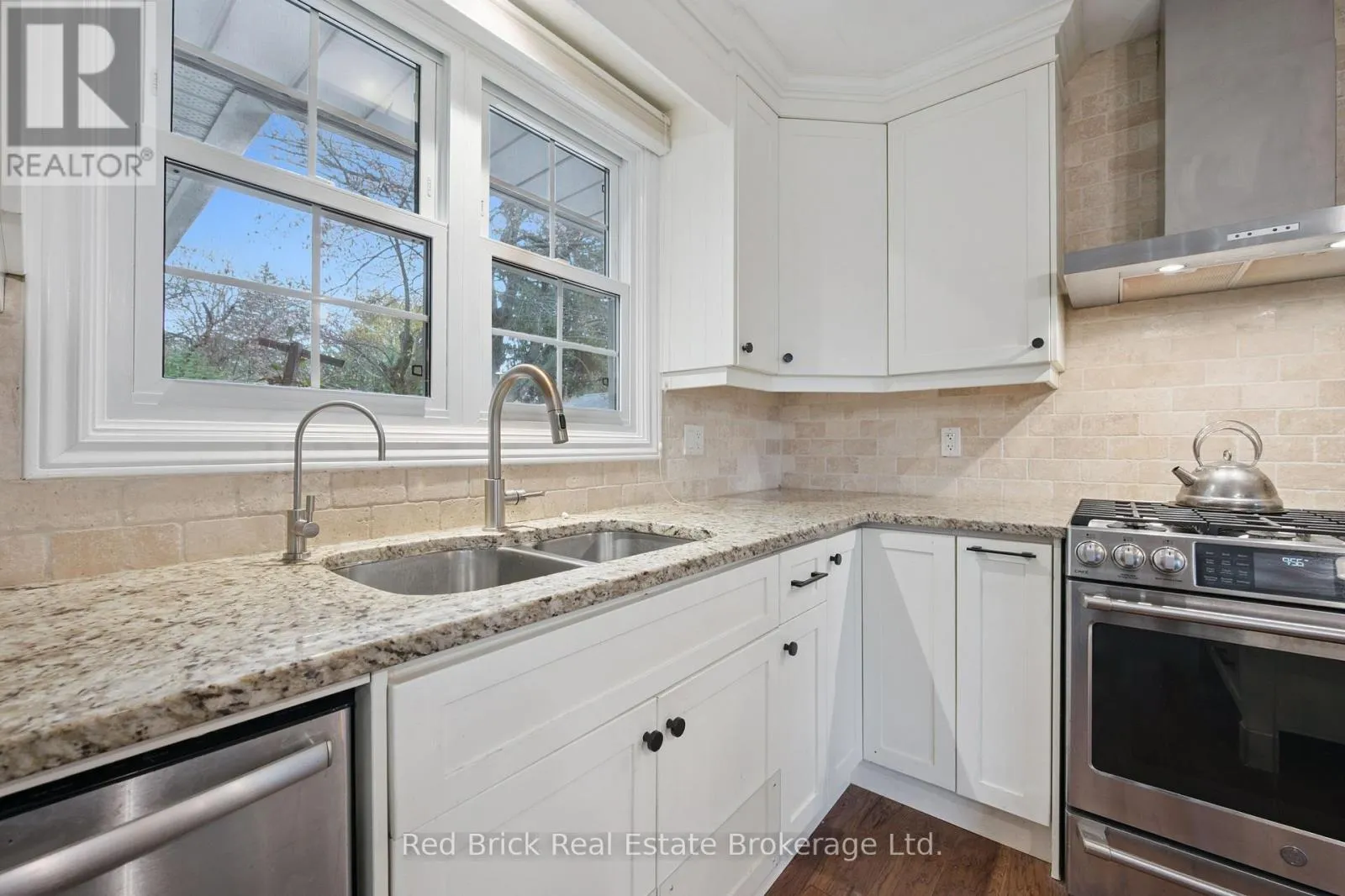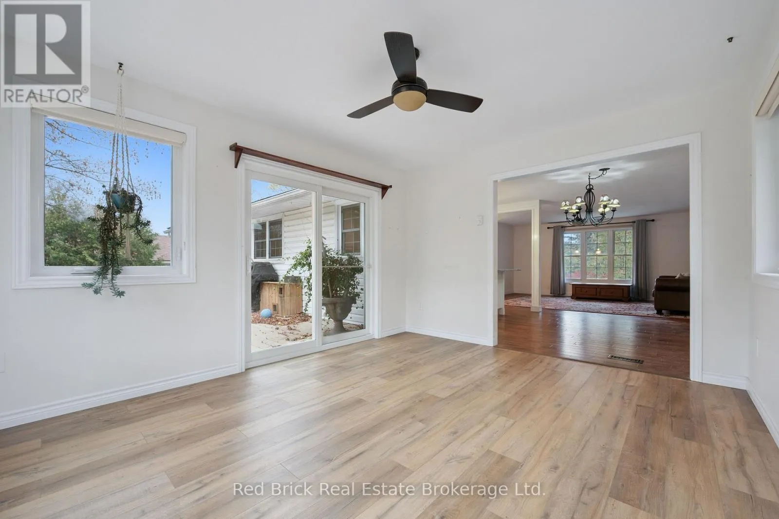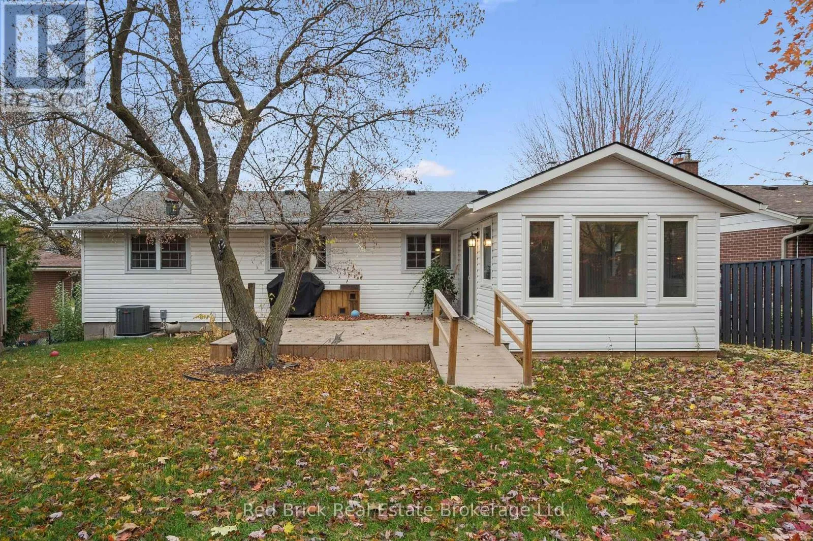 Cross Streets: SPEEDVALE. ** Directions: EAST ON SPEEDVALE TURN RIGHT ON SHERWOOD DR. Charming detached raised bungalow in an amazing quiet neighbourhood situated on a large (invisible) fenced yard. The bright and sunny main floor features an open concept layout with Living room, dining room on to a large 4 season sunroom with many windows and patio doors unto a composite deck. Kitchen with granite counters, stainless steel appliances, large island with breakfast bar. Hardwood floors in the main living area.3 spacious bedrooms, 3 pc main bath with walk-in shower, heated floors newly renovated. Newer furnace and air conditioning. Very large 2 car garage with garage door opener. Front Porch was recently renovated. The basement has a 2 pc. bath and entrance from the garage. Recreation room plus an area for a 4th bedroom or home office. Plenty of storage area under stairs.P.S. owner had additional insulation blown into R20 value. Also the aluminum wiring has been upgraded with Pig Tails and approved by ESA. Book your showing today. (id:27476)