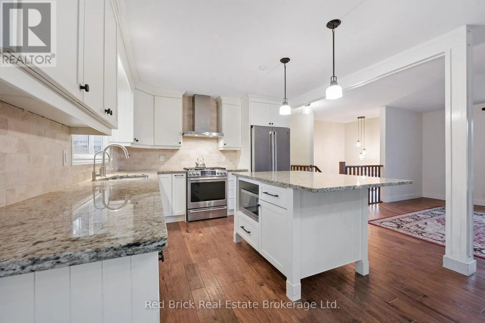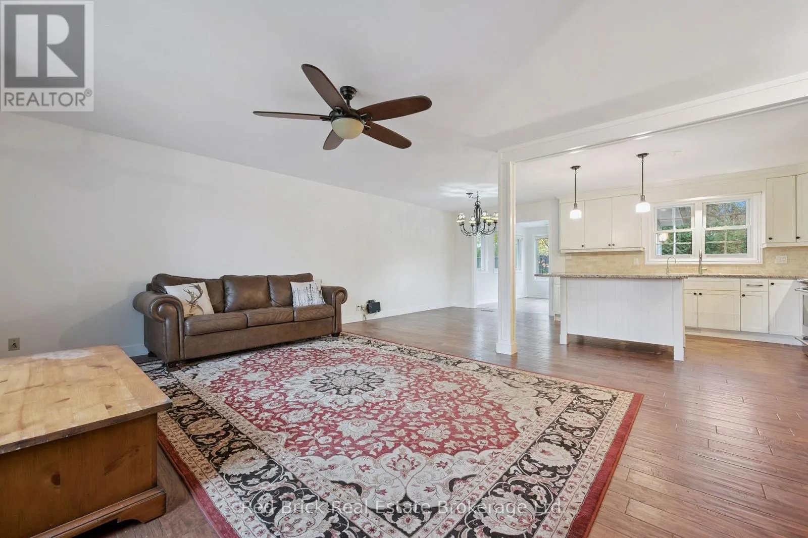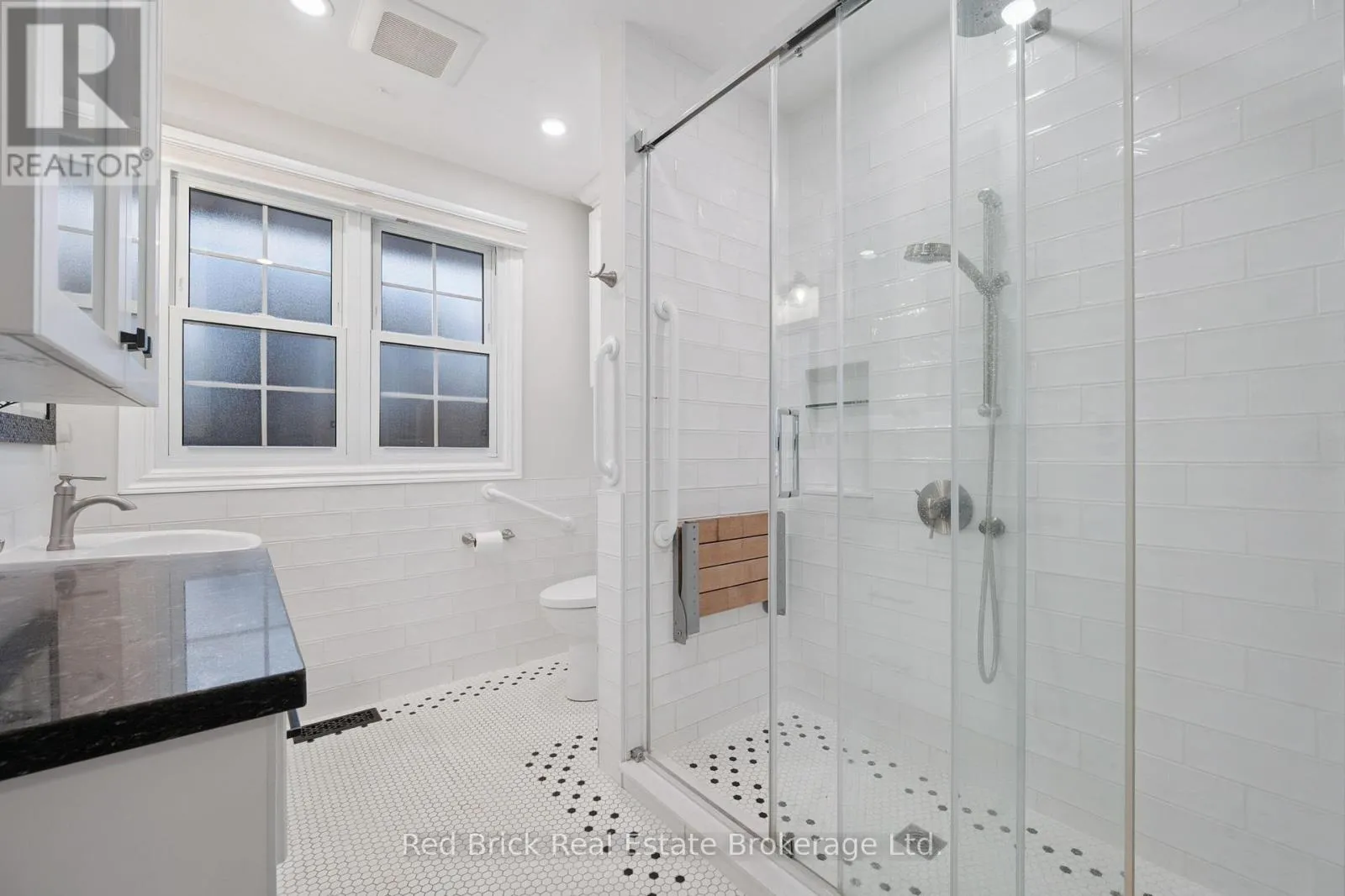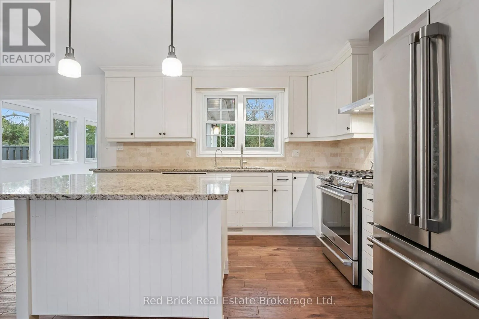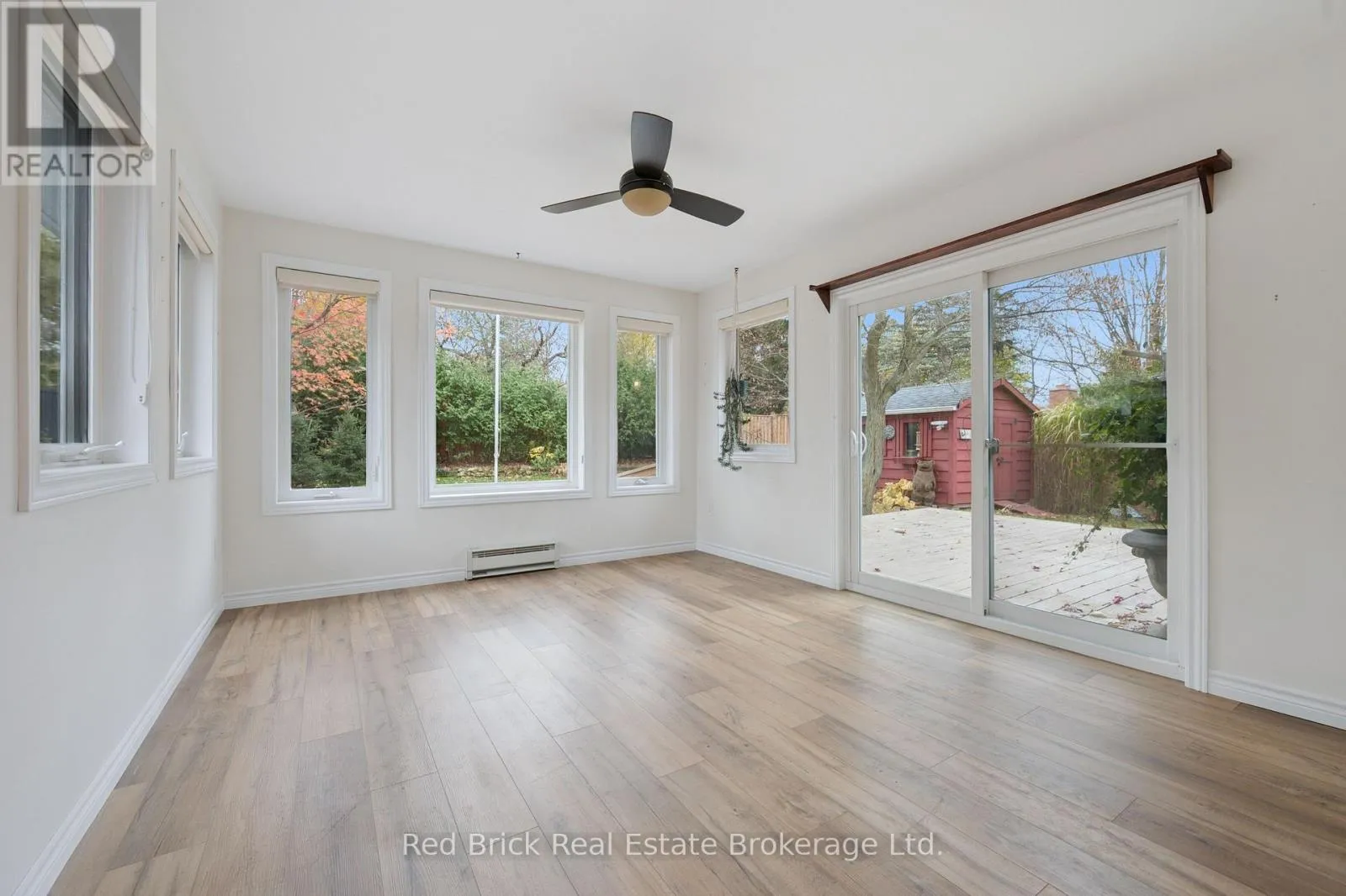 Cross Streets: SPEEDVALE. ** Directions: EAST ON SPEEDVALE TURN RIGHT ON SHERWOOD DR. Charming detached raised bungalow in an amazing quiet neighbourhood situated on a large (invisible) fenced yard. The bright and sunny main floor features an open concept layout with Living room, dining room on to a large 4 season sunroom with many windows and patio doors unto a composite deck. Kitchen with granite counters, stainless steel appliances, large island with breakfast bar. Hardwood floors in the main living area.3 spacious bedrooms, 3 pc main bath with walk-in shower, heated floors newly renovated. Newer furnace and air conditioning. Very large 2 car garage with garage door opener. Front Porch was recently renovated. The basement has a 2 pc. bath and entrance from the garage. Recreation room plus an area for a 4th bedroom or home office. Plenty of storage area under stairs.P.S. owner had additional insulation blown into R20 value. Also the aluminum wiring has been upgraded with Pig Tails and approved by ESA. Book your showing today. (id:27476)