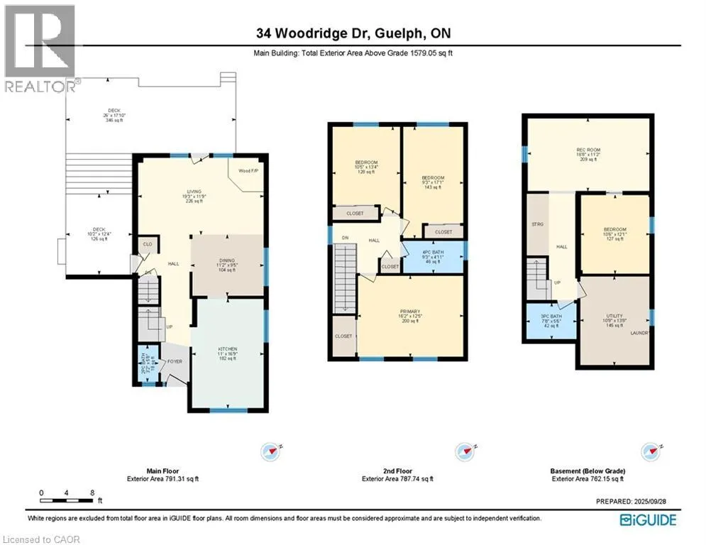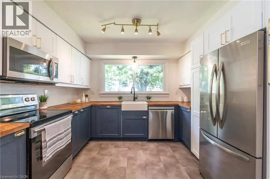 Whitelaw Welcome to 34 Woodridge Crescent! Tucked away in one of Guelphâs well-established neighbourhoods, this charming 2-storey home offers 4 bedrooms, 3 bathrooms and over 2,225 sq. ft. of living space. Just steps from shopping (Costco, Zehrs), banks, the West End Rec Centre, schools and parks. Quick access to HWY's 6, 7 & 124 makes commuting much easier. As you step inside you'll be welcomed by a spacious, fully renovated chefâs kitchen, featuring ample custom cabinetry, expansive wood countertops, and a bright breakfast nook, all thoughtfully designed. Oversized windows throughout the home flood the space with natural light. The dining area flows seamlessly into a spacious living room highlighted by a cozy wood-burning fireplace, ideal for family time. A convenient side entrance provides direct access to the walk-up basement and the deckâideal for multi-generational living, teenagers or those in need of added privacy. As you go up the stairs, youâll find 3 very spacious bedrooms and a full 4-piece bathroom. The primary bedroom is exceptionally large, featuring a deep closet for ample storage. The fully finished basement features a generous Rec room, an additional bedroom/den, a 3-piece bathroom, and a large utility room that includes the laundry area. Youâll enjoy relaxing and entertaining loved ones in the fully fenced backyard, which features a large main deck and a convenient side deck. As a bonus, the hot tub and two storage sheds are also included. List of upgrades: professionally renovated kitchen 2023 with luxury vinyl plank flooring (new insulation, studs, drywall and wiring), new windows by Nordik Windows 2023, shingles Nov 2019 by Platinum Roofing (50 yr transferable warranty), upstairs bath/shower & basement shower by Bath Fitter Feb 2025, new electrical panel Jan 2023, wood stove by Fergus Fireplace 2009 (triple wall pipe, fire rated wood stove tile pad) and SS appliances. One car garage and the driveway that can fit 2 cars complete this cute family home. (id:27476)