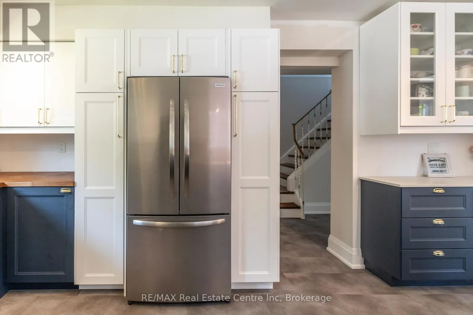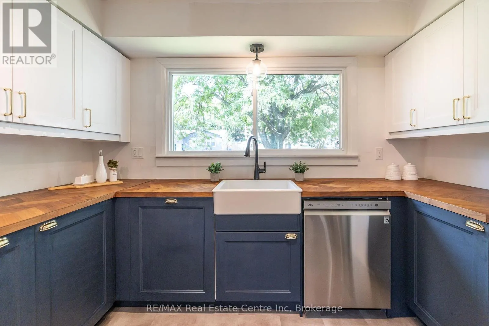 Whitelaw Welcome to 34 Woodridge Crescent! Tucked away in one of Guelph's well-established neighbourhoods, this charming 2-storey home offers 4 bedrooms, 3 bathrooms and over 2,225 sq. ft. of living space. Just steps from shopping (Costco, Zehrs), banks, the West End Rec Centre, schools and parks. Quick access to HWY's 6, 7 & 124 makes commuting much easier. As you step inside you'll be welcomed by a spacious, fully renovated chef's kitchen, featuring ample custom cabinetry, expansive wood countertops, and a bright breakfast nook, all thoughtfully designed. Oversized windows throughout the home flood the space with natural light. The dining area flows seamlessly into a spacious living room highlighted by a cozy wood-burning fireplace, ideal for family time. A convenient side entrance provides direct access to the walk-up basement and the deck-ideal for multi-generational living, teenagers or those in need of added privacy. As you go up the stairs, you'll find 3 very spacious bedrooms and a full 4-piece bathroom. The primary bedroom is exceptionally large, featuring a deep closet for ample storage. The fully finished basement features a generous Rec room, an additional bedroom/den, a 3-piece bathroom, and a large utility room that includes the laundry area. You'll enjoy relaxing and entertaining loved ones in the fully fenced backyard, which features a large main deck and a convenient side deck. As a bonus, the hot tub and two storage sheds are also included. List of upgrades: professionally renovated kitchen 2023 with luxury vinyl plank flooring (new insulation, studs, drywall and wiring), new windows by Nordik Windows 2023, shingles Nov 2019 by Platinum Roofing (50 yr transferable warranty), upstairs bath/shower & basement shower by Bath Fitter Feb 2025, new electrical panel Jan 2023, wood stove by Fergus Fireplace 2009 (triple wall pipe, fire rated wood stove tile pad) and SS appliances. One car garage and the driveway that can fit 2 cars complete this cute family home. (id:27476)