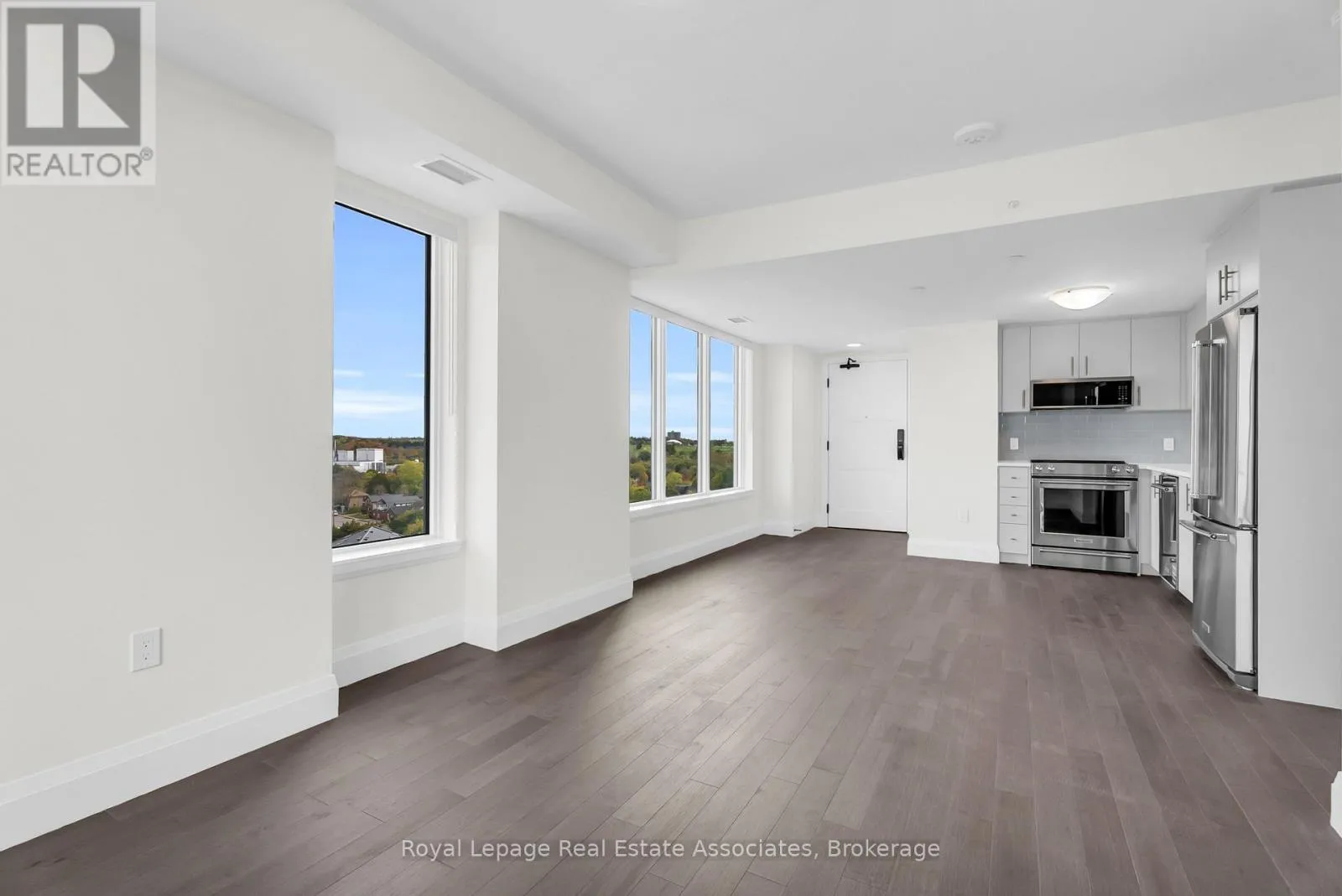 Wellington St E/Neeve St Welcome to Anthem on the River Walk - Guelph's signature address for refined urban living. This bright and contemporary 1-bedroom, 1-bath corner suite features a private balcony and a thoughtfully designed layout filled with natural light. Ideally situated just steps from Downtown Guelph, Spring Mill Distillery, and the River Run Centre, the location blends convenience with vibrant city charm. Inside, this corner unit you'll find elegant finishes throughout - from luxury hardwood flooring throughout the entire condo, a sleek modern upgraded kitchen with quartz countertops, oversized kitchen sink and upgraded backsplash. There is also a full size washer and dryer. Every detail is designed for comfort and style. Anthem residents enjoy an impressive collection of modern amenities, including the SmartOne digital concierge system offering building access, security monitoring, visitor management, and climate control right from your wall touchpad. The building also features a pet spa, an outdoor Sunrise Deck with BBQ area, a co-work studio, the Anthem Social Club party lounge, a fully equipped gym with Peloton bikes and subscription, and an inviting Piano Lounge for quiet relaxation. With parks, trails, shops, and transit options such as VIA Rail and GO Station just minutes away, this residence offers a seamless blend of luxury, lifestyle, and location. Unit 1212 at Anthem on the River Walk is more than a home - it's a statement of modern sophistication in the heart of Guelph. (id:27476)