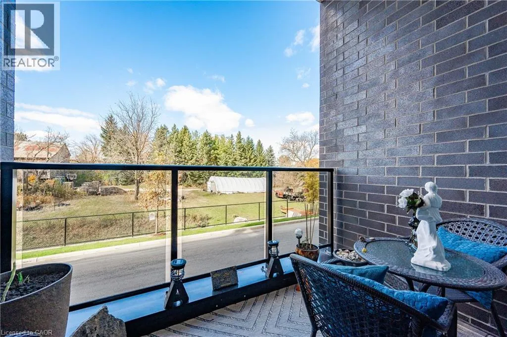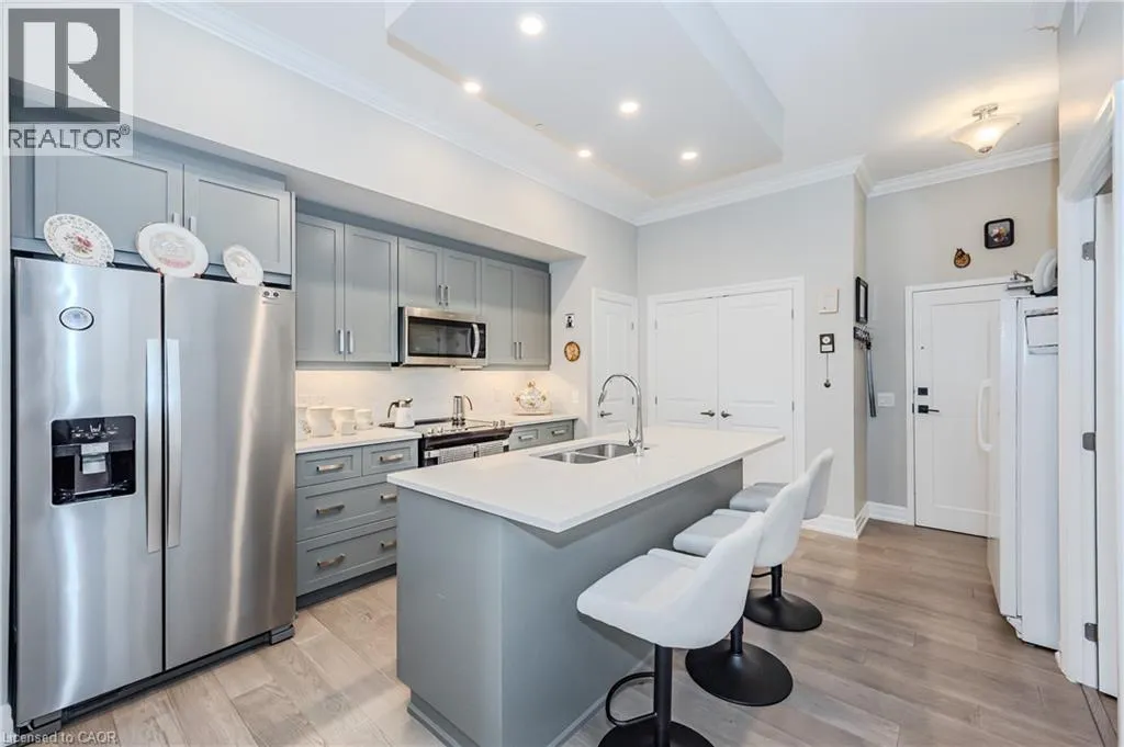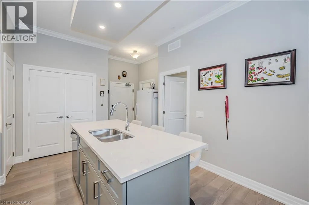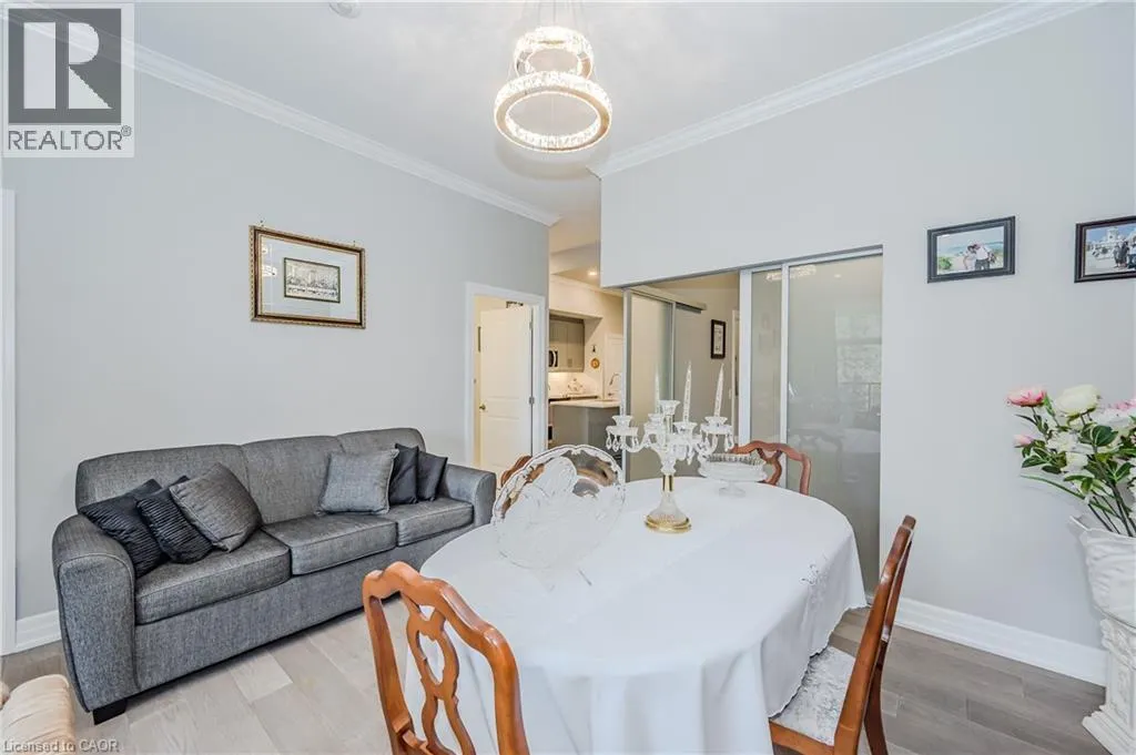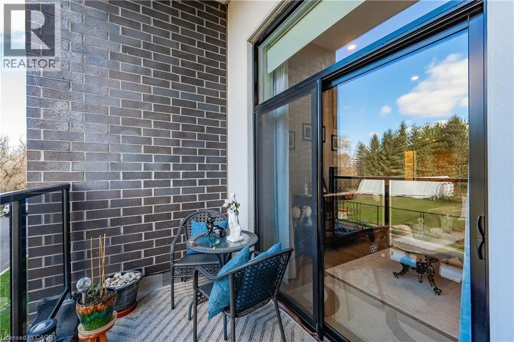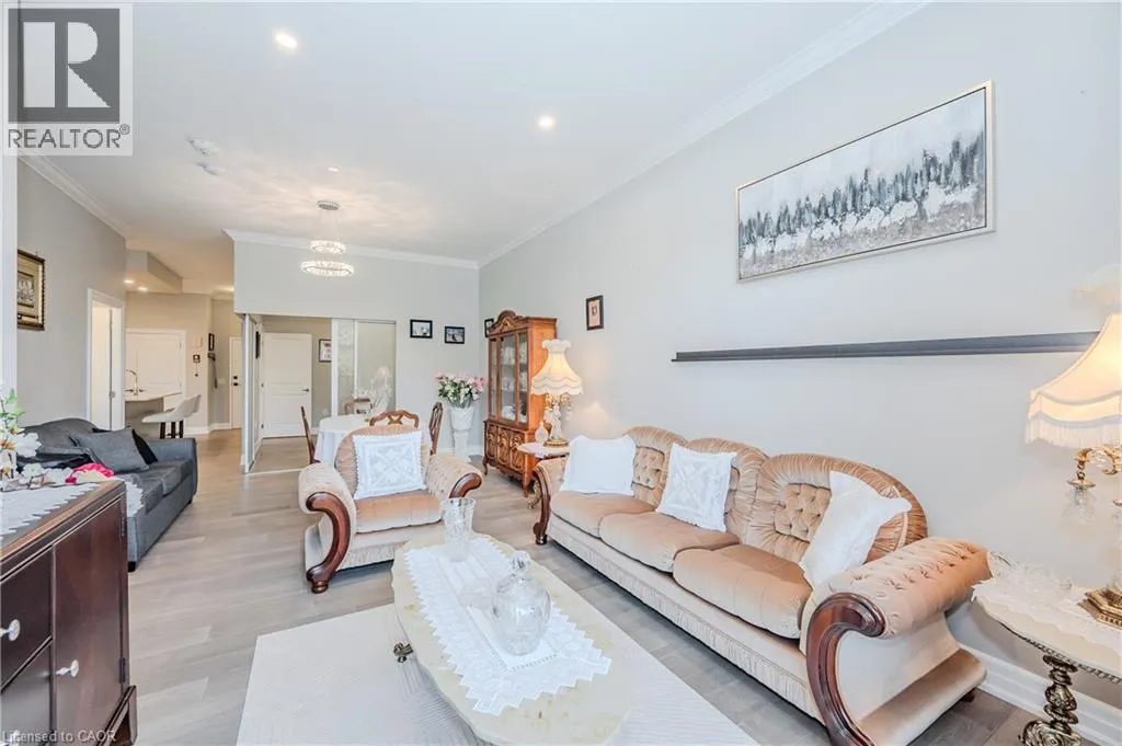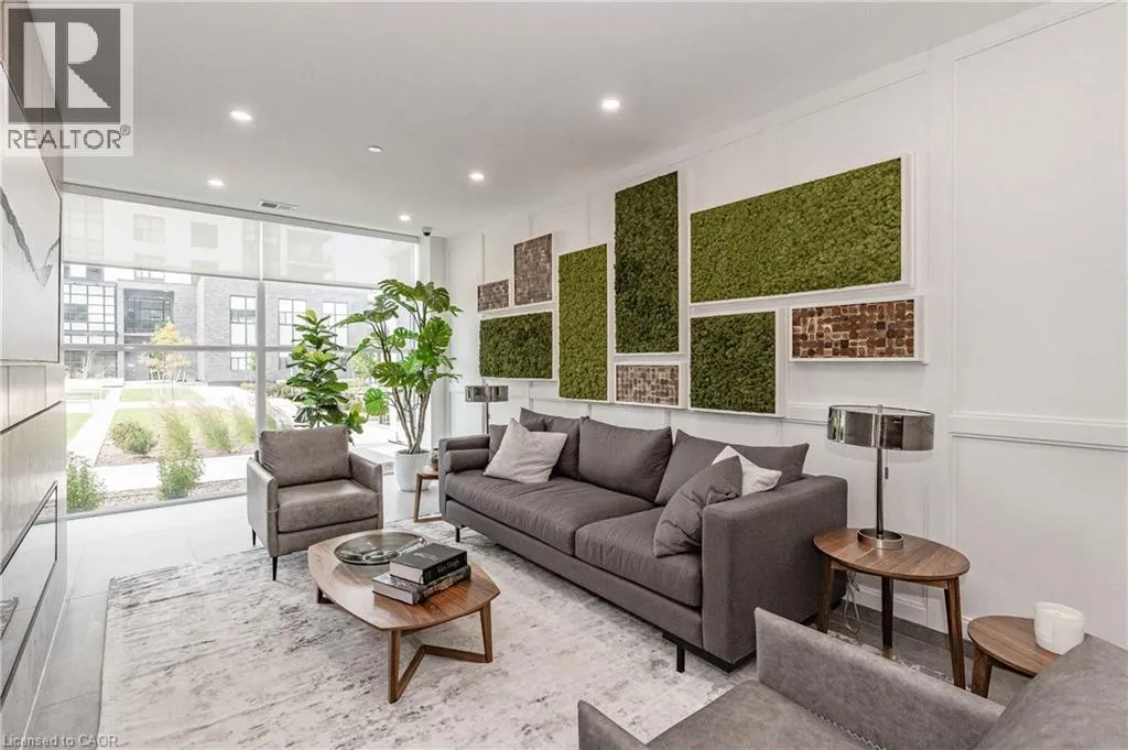 Gordon Street and Clair Road Make this gorgeous ground-floor condo located in the prestigious south end of Guelph yours. Professionally designed 2-bedroom, 2-bathroom suite with luxurious upgrades and TWO underground parking spaces. The 10' ceilings bring in more natural light and make the open-concept floor plan feel very spacious. With stunning finishes and a great layout, spending time at home will feel relaxing and joyful. The modern kitchen has plenty of cabinets, numerous drawers and a walk-in pantry for additional storage. Undermount lighting, built-in stainless steel appliances, a stylish backsplash, and a large island complete the kitchen. The broad dining area overlooks the living room. The charming living room with large sliding doors leads to a private balcony. Enjoy a morning coffee or afternoon tea in your secluded outdoor space. The large primary bedroom has a walk-in closet and a luxurious ensuite bathroom with a floor-to-ceiling glass shower and heated flooring. With glass sliding doors that open up to the living/dining room, you will be pleased with the functionality of a second bedroom. With a Murphy bed already installed, it can be used as an office and/or a bedroom. The main 4-piece bath with heated floors and in-suite laundry completes this suite. Quartz counters and hardwood flooring throughout, crown molding, and pot lights are a bonus. This building has so many amazing amenities to offer. With an HD golf simulator, a very well-equipped gym, a guest suite, bicycle storage, and a gorgeous 14th-floor resident lounge with a separate bar area, games room, and a balcony with panoramic views and a great scenery. If you are expecting more guests, you can also book the building's guest suite. Located in Guelph's desirable south end, this beautiful condo is just steps away from prime shopping, restaurants, banks, and cinema. Easy access to HWY 401 and on a bus route to UoG. (id:27476)
