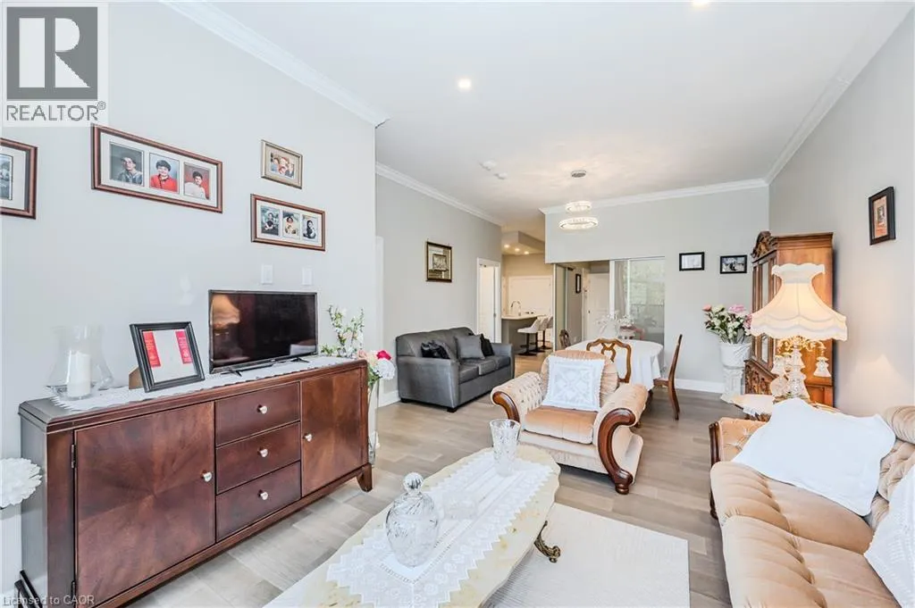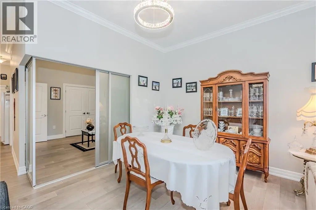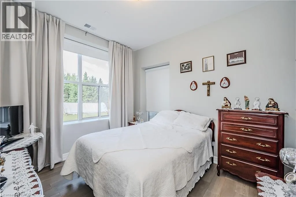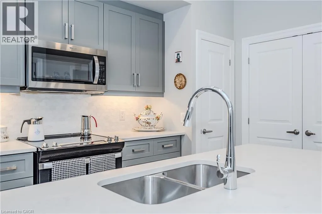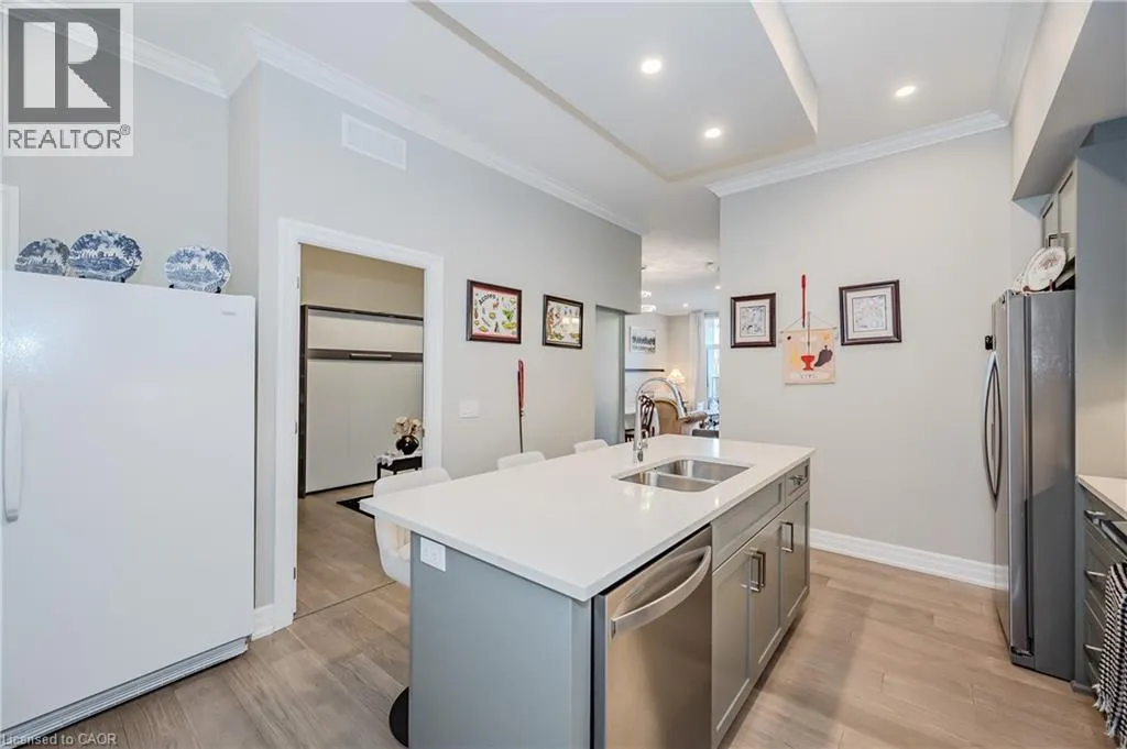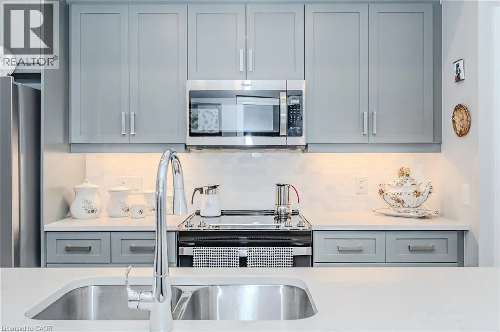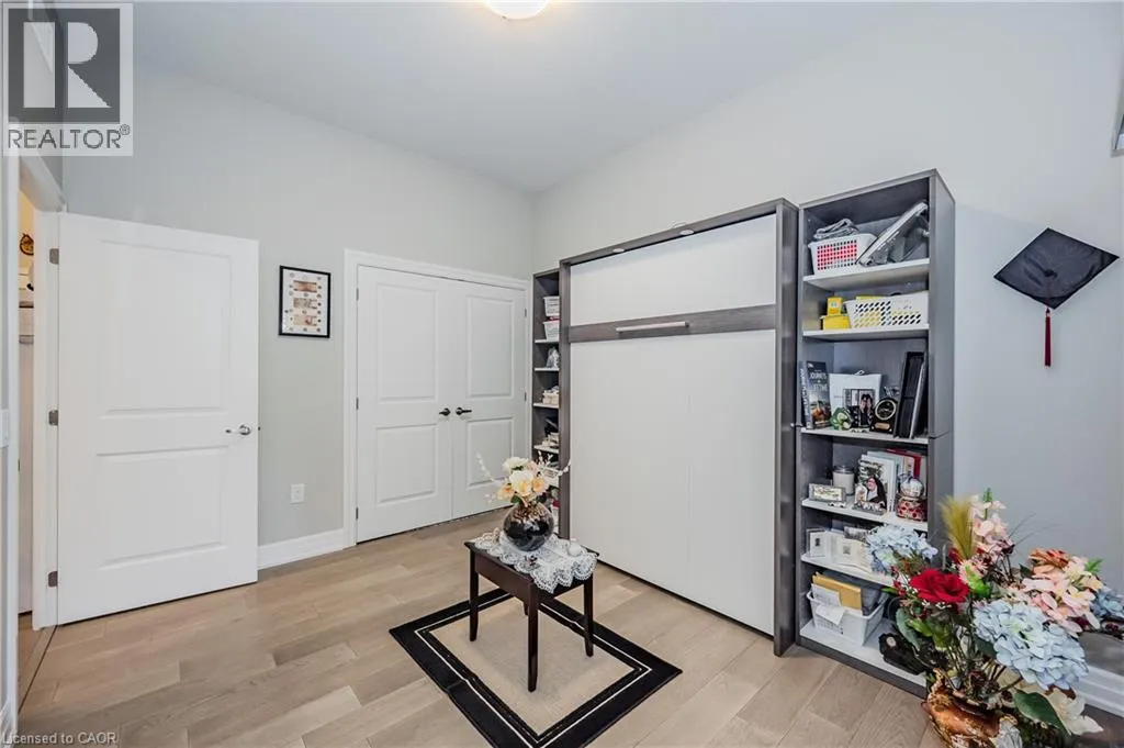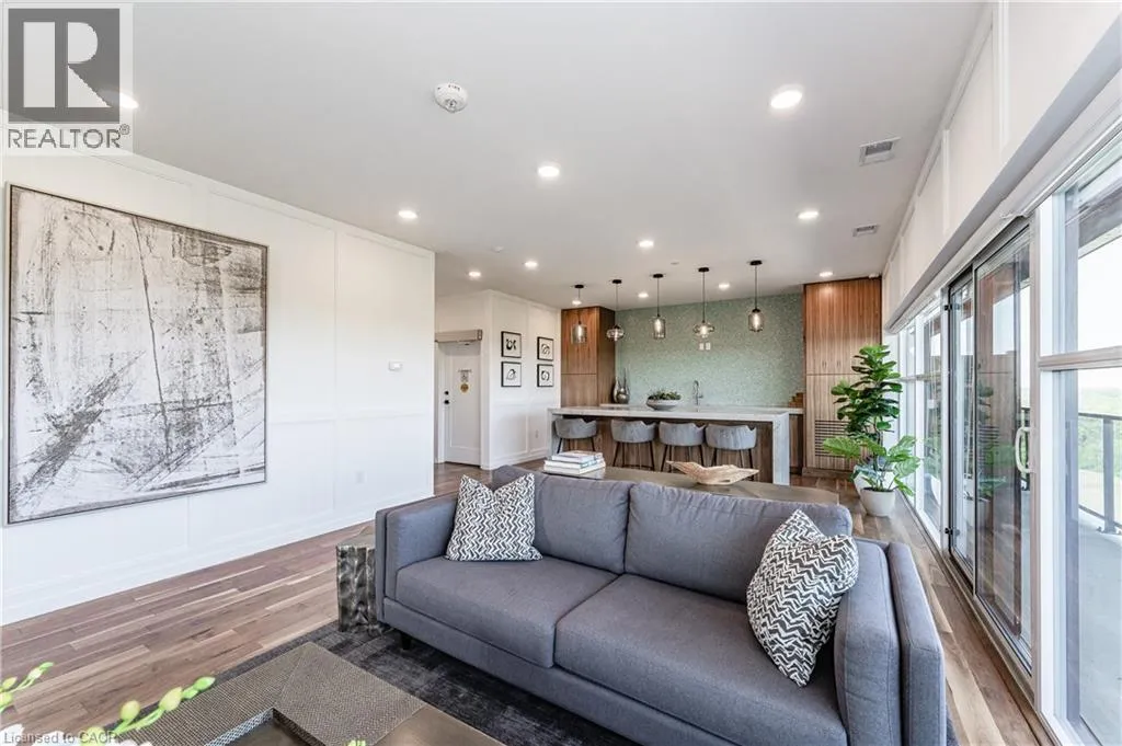 Gordon Street and Clair Road Make this gorgeous ground-floor condo located in the prestigious south end of Guelph yours. Professionally designed 2-bedroom, 2-bathroom suite with luxurious upgrades and TWO underground parking spaces. The 10' ceilings bring in more natural light and make the open-concept floor plan feel very spacious. With stunning finishes and a great layout, spending time at home will feel relaxing and joyful. The modern kitchen has plenty of cabinets, numerous drawers and a walk-in pantry for additional storage. Undermount lighting, built-in stainless steel appliances, a stylish backsplash, and a large island complete the kitchen. The broad dining area overlooks the living room. The charming living room with large sliding doors leads to a private balcony. Enjoy a morning coffee or afternoon tea in your secluded outdoor space. The large primary bedroom has a walk-in closet and a luxurious ensuite bathroom with a floor-to-ceiling glass shower and heated flooring. With glass sliding doors that open up to the living/dining room, you will be pleased with the functionality of a second bedroom. With a Murphy bed already installed, it can be used as an office and/or a bedroom. The main 4-piece bath with heated floors and in-suite laundry completes this suite. Quartz counters and hardwood flooring throughout, crown molding, and pot lights are a bonus. This building has so many amazing amenities to offer. With an HD golf simulator, a very well-equipped gym, a guest suite, bicycle storage, and a gorgeous 14th-floor resident lounge with a separate bar area, games room, and a balcony with panoramic views and a great scenery. If you are expecting more guests, you can also book the building's guest suite. Located in Guelph's desirable south end, this beautiful condo is just steps away from prime shopping, restaurants, banks, and cinema. Easy access to HWY 401 and on a bus route to UoG. (id:27476)