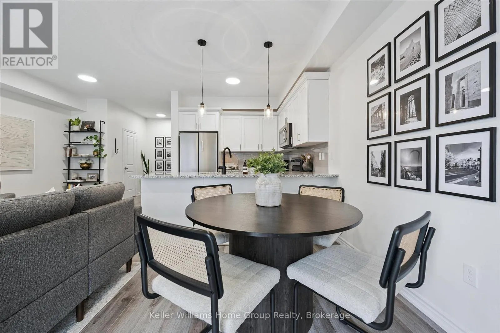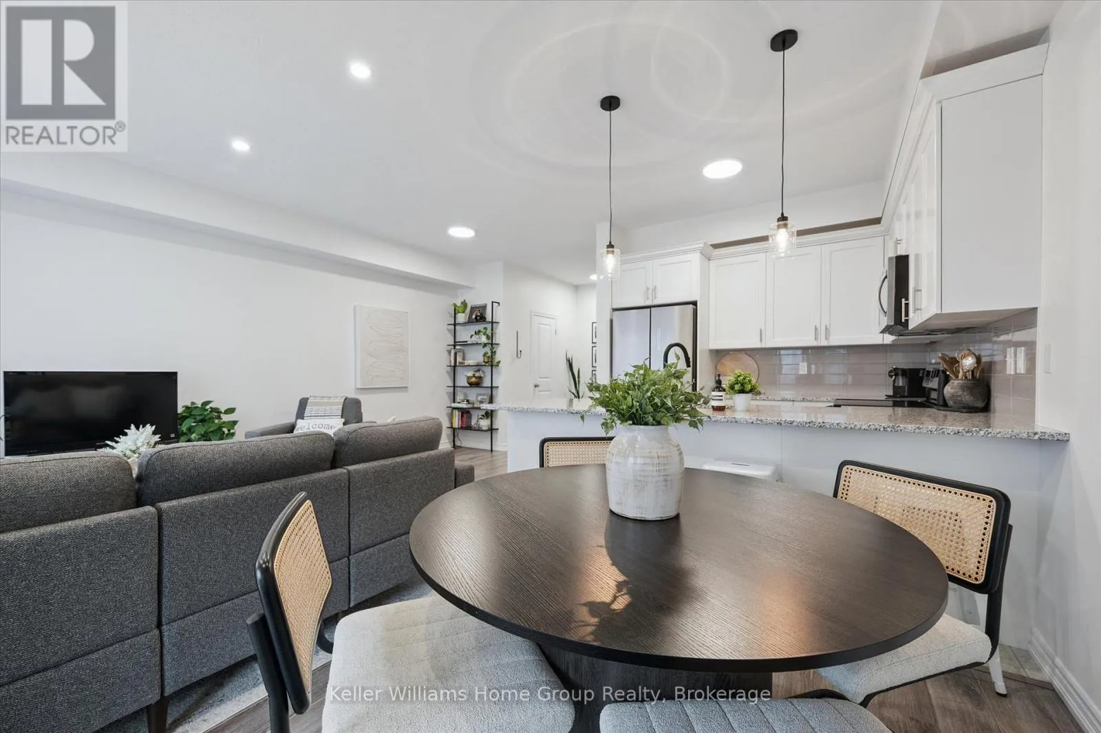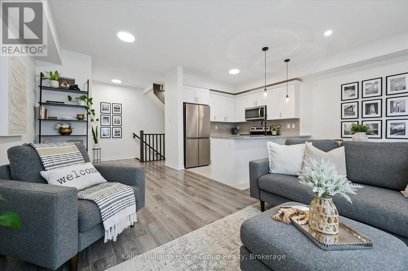 Cross Streets: Victoria/ DeCorso. ** Directions: Victoria to DeCorso. AFFORDABLE 2 BEDROOM FREEHOLD TOWNHOME IN SOUTH GUELPH: This modern freehold townhome is tucked into a quiet South End enclave and offers an easy, low-maintenance lifestyle in a fantastic location. Built in 2019 this home is bright, functional, and move-in ready.The open-concept main level is filled with natural light and features a stylish kitchen with quartz countertops, stainless steel appliances, and a breakfast bar that flows into the living and dining areas. Sliding doors lead to a covered balcony - a great spot for summer BBQs or relaxing at the end of the day.Upstairs, you'll find two well-sized bedrooms, including a primary bedroom with a walk-in closet and private ensuite, plus a second full bathroom and convenient upper-level laundry. SMART home features allow you to control lighting, the garage door, and HVAC with ease. Located close to trails, parks, schools, shopping and accessible to the University of Guelph via transit, this South End location makes everyday living simple. A great opportunity to step into a newer home with modern finishes! Updates include new front door (2025) and washer/dryer (2024) (id:27476)