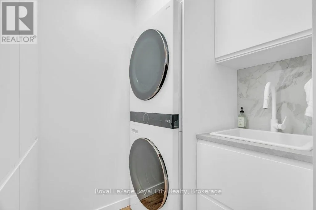 Cross Streets: Woolwich St. ** Directions: Woolwich. Modern living at 511-19 Woodlawn Rd E! This beautifully renovated 3-bedroom condo is perfectly situated overlooking Riverside Park, blending natural tranquility with the convenience of nearby amenities and transit routes. The building offers a fantastic community feel with on-site amenities like a tennis/pickle ball court and a sparkling pool, perfect for relaxation and recreation. Step into Unit 511, where modern design meets exceptional quality. Renovated from top to bottom, this condo has been carefully crafted! You'll find sleek, consistent flooring throughout and custom modern radiator covers. The kitchen is a standout, featuring a waterfall island with ample seating and storage, a built-in Bosch oven, and a sleek rising vent. The feature wall adds an eye-catching, contemporary touch. The primary bedroom offers stunning park views, a 2-piece ensuite, and a large closet. Two additional bedrooms make the unit ideal for families or those working from home. The laundry room includes a stackable washer/dryer, sink, and built-in storage. The main bathroom is designed with floor-to-ceiling tiles, a glass-enclosed shower/tub, heated towel rack, and storage. Enjoy a comfortable climate year-round with limited exposure to direct sun during the day, yet plenty of natural light in the mornings and evenings. The upgraded balcony with privacy screens and mesh keeps bugs out, offering a peaceful outdoor retreat. With heat, hydro, and water included in condo fees, budgeting is easy. This one-of-a-kind unit stands out, and the photos speak for themselves! (id:27476)