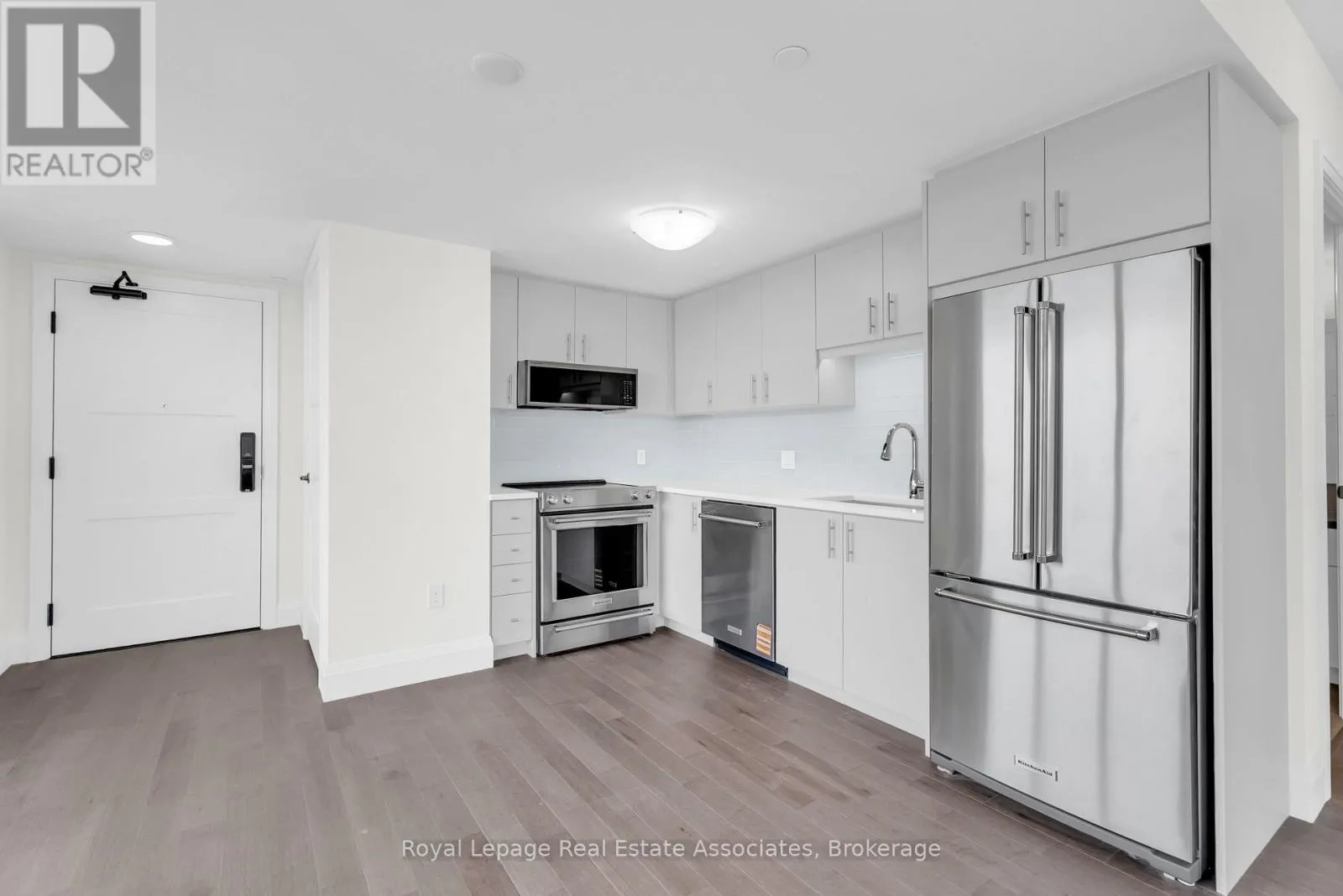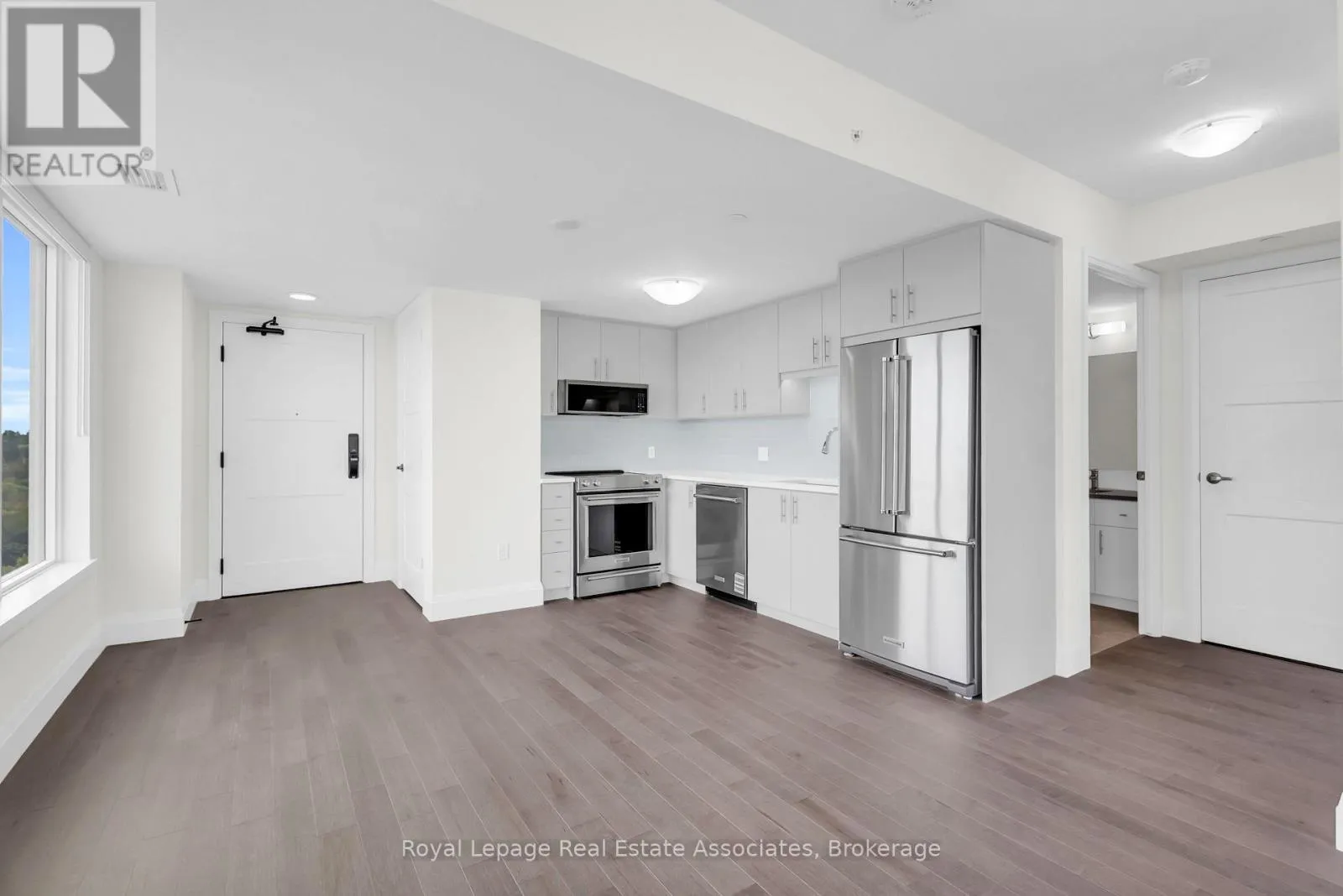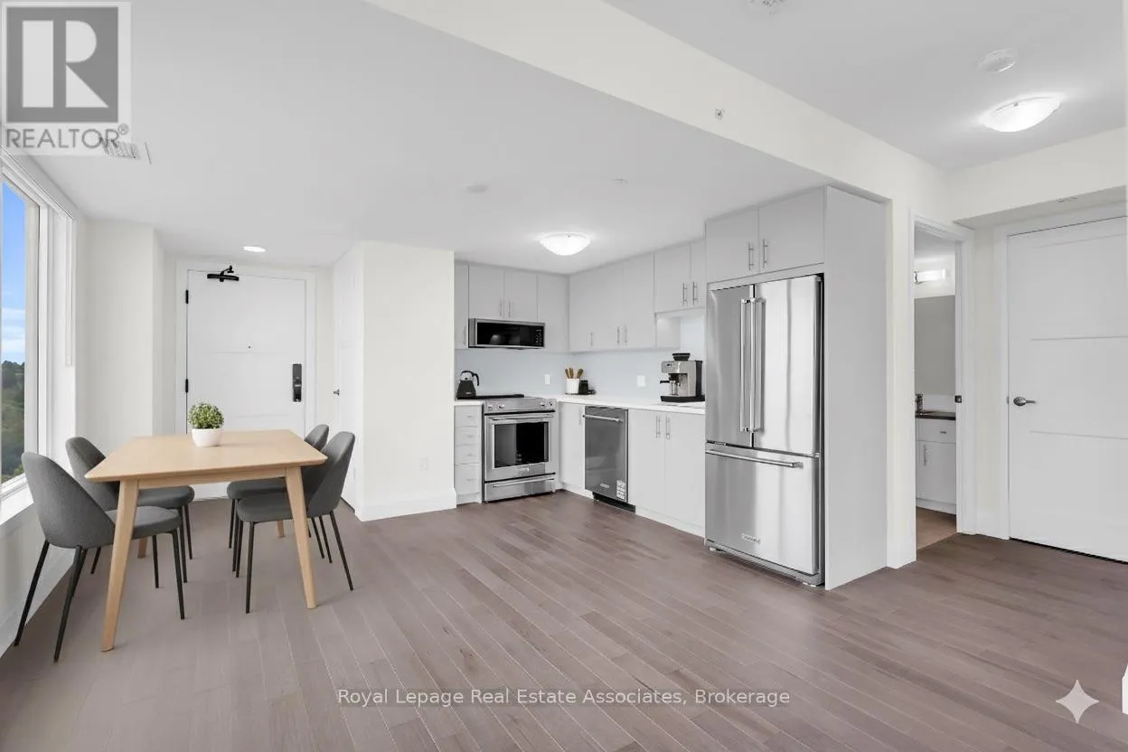 Wellington St E/Neeve St ****Exclusive 2nd level parking spot by elevators**** Welcome to Anthem on the River Walk, Guelph's signature address for refined urban living. This bright and contemporary 1-bedroom, 1-bath corner suite features a private balcony and a thoughtfully designed layout filled with natural light, as there are windows throughout the unit. Ideally situated just steps from Downtown Guelph, Spring Mill Distillery, and the River Run Centre, the location blends convenience with vibrant city charm. Inside, this corner unit you'll find elegant finishes throughout, from luxury hardwood flooring throughout the entire condo, a sleek modern upgraded kitchen with quartz countertops, oversized kitchen sink and upgraded backsplash. There is also a full size washer and dryer. Every detail is designed for comfort and style. Anthem residents enjoy an impressive collection of modern amenities, including the SmartOne digital concierge system offering building access, security monitoring, visitor management, and climate control right from your wall touchpad. The building also features a pet spa, an outdoor Sunrise Deck with BBQ area, a co-work studio, the Anthem Social Club party lounge, a fully equipped gym with Peloton bikes and subscription, and an inviting Piano Lounge for quiet relaxation. With parks, trails, shops, and transit options such as VIA Rail and GO Station just minutes away, this residence offers a seamless blend of luxury, lifestyle, and location. Unit 1212 at Anthem on the River Walk is more than a home, it's a statement of modern sophistication in the heart of Guelph. (id:27476)