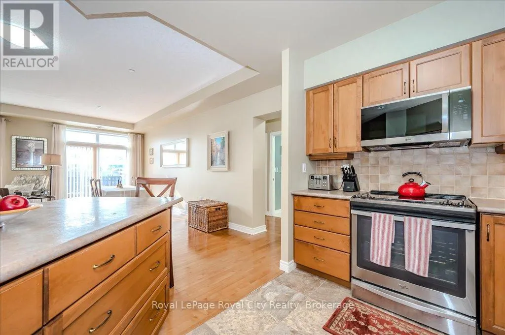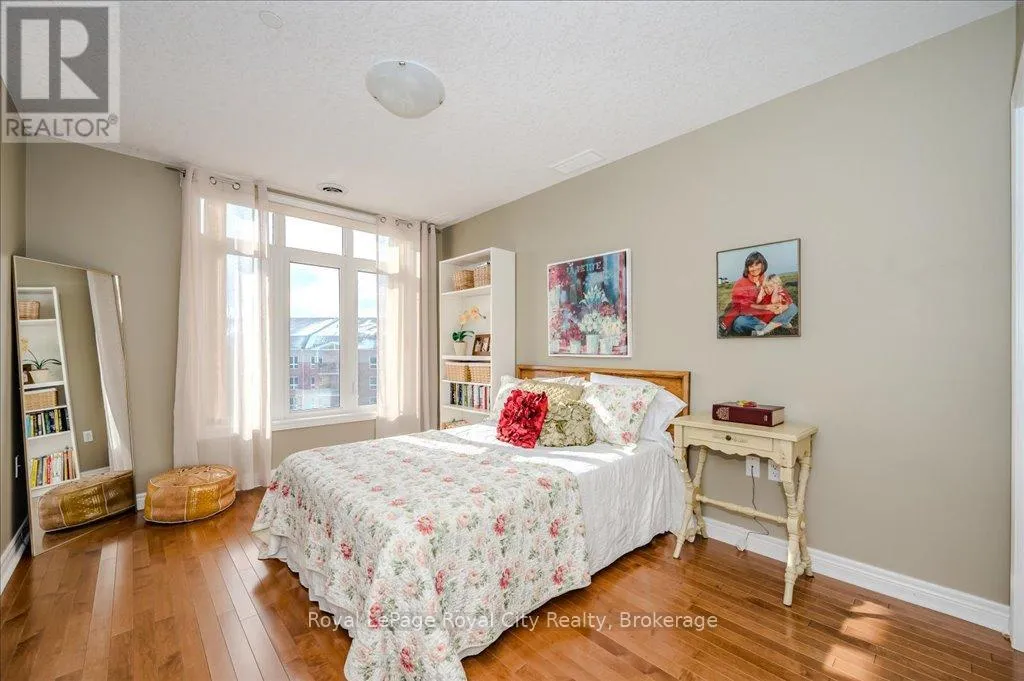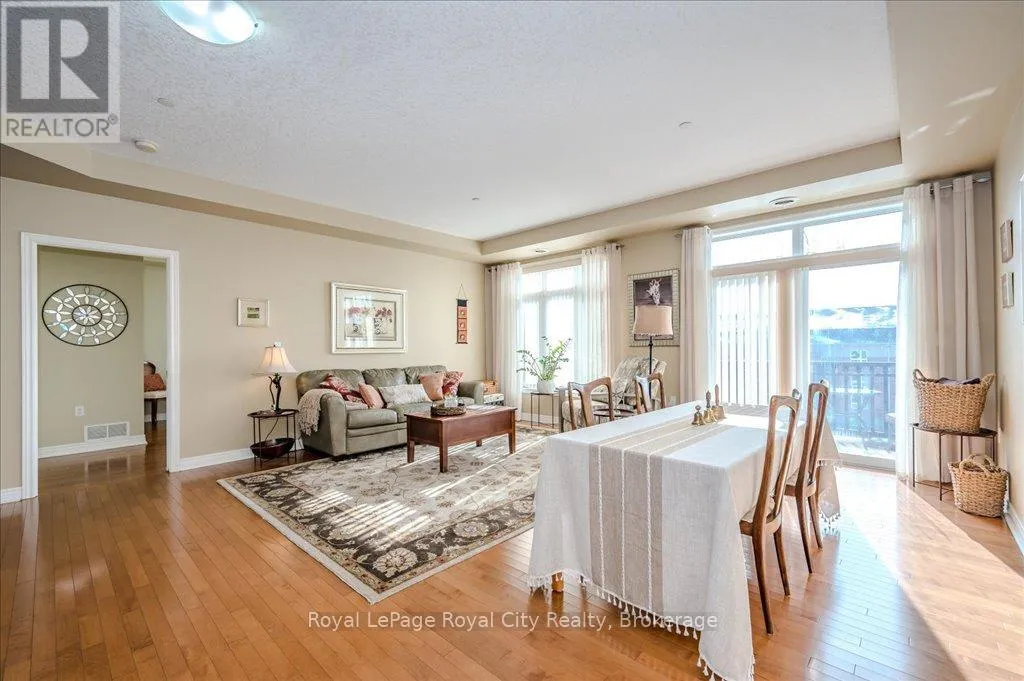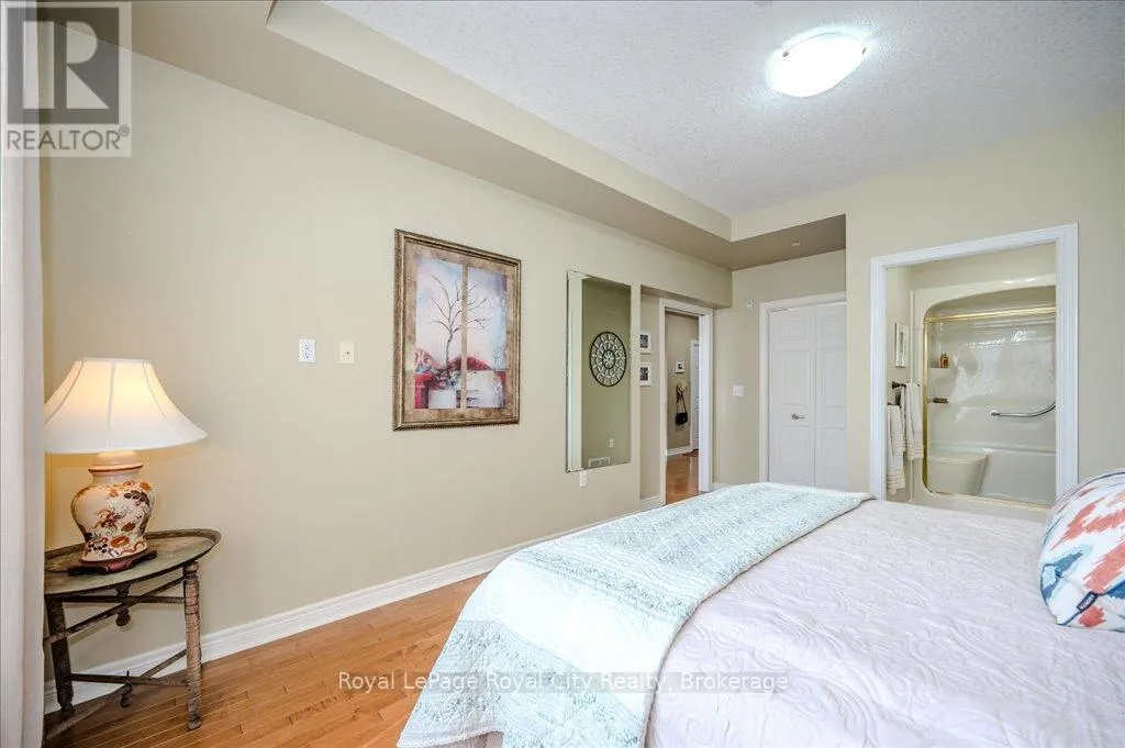 Cross Streets: Stone and Village Green. ** Directions: Village Green Drive to Bayberry Drive. Welcome to the Wellington Suites at the Village by the Arboretum, a premier 55+ community in the heart of Guelph, thoughtfully designed with retirement living in mind. This spacious 1,354 square foot suite offers an exceptional lifestyle in one of the city's most unique and vibrant communities. Featuring two generously sized bedrooms, including a primary suite complete with a walk-in closet and a private three-piece ensuite with a convenient step-in shower. A second full four-piece bathroom provides comfort and flexibility for guests or visiting family. The open-concept kitchen is equipped with a breakfast bar and flows seamlessly into the bright and inviting living room, which is bathed in natural light from large windows and features sliding doors that lead to a private south-facing balcony overlooking the serene courtyard. Additional highlights include beautiful hardwood flooring throughout the main living area, an in-suite laundry room, and a bonus room that can serve as a home office, pantry, or extra storage space. A large storage locker adds to the practicality, while the exclusively owned underground parking space located right next to the elevator provides ease of access directly to the fourth floor. Life at the Village is about so much more than just your home - it's about living well every day. This exceptional adult community offers an impressive community canter, with amenities designed for connection, wellness, and fun. Residents enjoy access to an indoor pool, hot tub, sauna, tennis courts, putting greens, and a billiards room. The Village Centre also hosts over 100 hobby and interest groups, along with fitness classes, social clubs, and community events. Plus, everyday convenience is right at your doorstep with on-site services including a pharmacy, doctors office, and LifeLabs. The Village isn't just a place to live - its a lifestyle in one of Guelphs most sought-after adult communities. (id:27476)