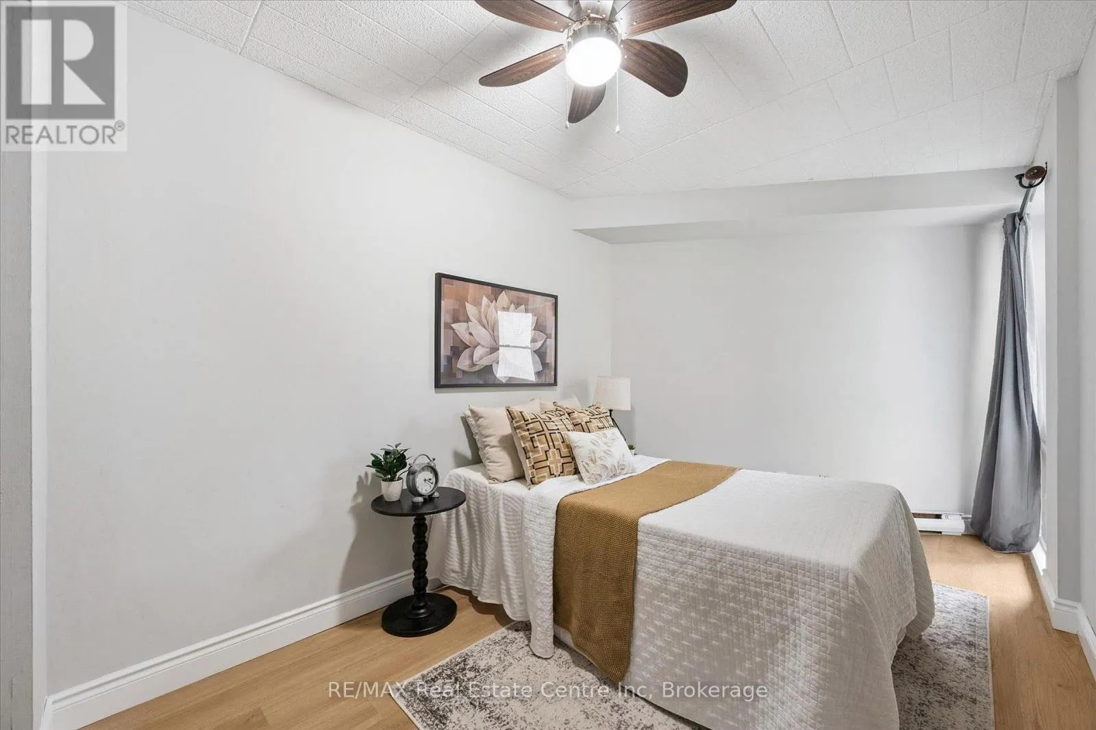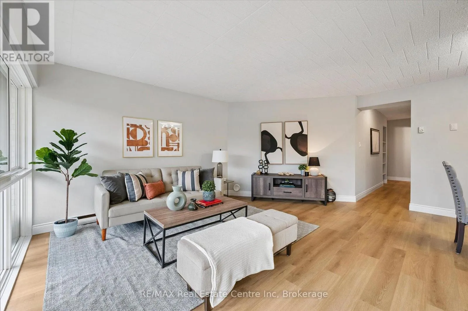 College Ave W Welcome to 102-105 Conroy Crescent, a bright, NEWLY RENOVATED, 2-bedroom condo backing onto peaceful green space and scenic trails that lead to the river! With a completely refreshed interior and a location surrounded by everyday conveniences, this home offers unbeatable value for first-time buyers, investors and downsizers alike. Step inside and you'll immediately notice the brand-new flooring and the tastefully renovated kitchen, featuring crisp white shaker cabinetry, butcher-block countertops, subway tile backsplash, modern black hardware and a sleek black sink. The thoughtful addition of open shelving and in-suite laundry makes this kitchen as functional as it is stylish. The spacious living and dining area is flooded with natural light from a full wall of windows. Freshly updated with neutral wide-plank flooring, this open-concept space is perfect for both relaxing and entertaining. Sliding doors lead to your large private balcony overlooking greenery-an ideal spot for your morning coffee or unwinding at the end of the day. The generously sized primary bedroom offers plenty of room for a king-size bed, while the second bedroom is perfect for guests, a home office or a roommate. A modern 4-piece bathroom completes the unit with updated vanity, fixtures and finishes. This condo includes an oversized parking spot located right next to the back building entrance, plus a convenient storage locker. The unit is situated on the main floor in a building with no elevator, making grocery trips and daily access a breeze. Just steps away is a bus stop with a direct route to the University of Guelph. You're also minutes from Stone Road Mall, LCBO, Shoppers, restaurants, banks, Dovercliffe Park and quick access to the Hanlon Parkway-perfect for commuters. Freshly renovated, move-in ready and set in a peaceful yet central location-this is an opportunity you won't want to miss! (id:27476)