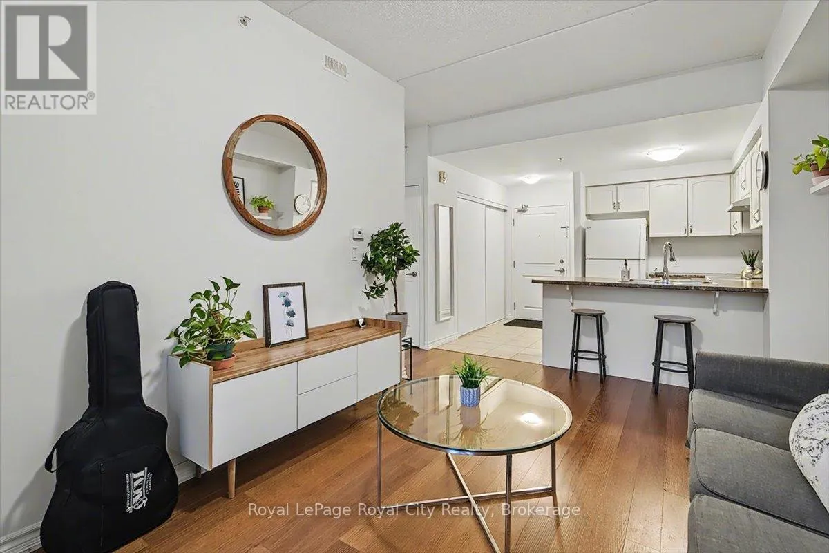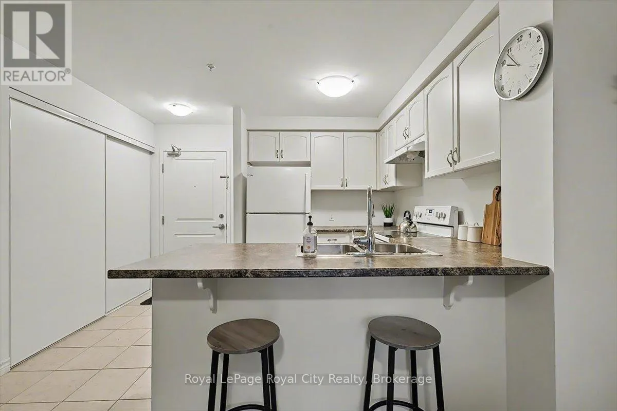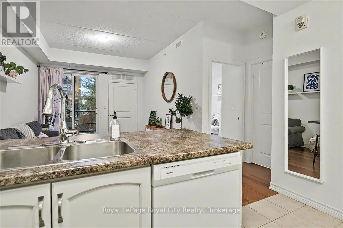 Gordon & Arkell An incredible opportunity for first-time buyers, investors, or those looking to downsize in one of Guelph's fastest-growing neighbourhoods. Welcome to Liberty Square, a trendy and ultra-modern condo development by Coletara Developments, ideally located in Guelph's desirable south end-just steps to restaurants, shopping, transit, and only minutes to the University of Guelph and Highway 401.This stylish one-bedroom unit shows well and is move in ready! Inside, you'll find 9-foot ceilings, a smart and functional layout, a spacious kitchen with ample counter space, upgraded cabinetry, and all kitchen appliances included. The private balcony overlooks a peaceful natural buffer, offering added privacy and a serene setting. Residents enjoy luxury common areas, wide hallways, and modern finishes throughout the building. The unit includes one parking space and a storage locker, making it a complete package in a highly sought-after location. Whether you're entering the market or expanding your portfolio, this is a fantastic opportunity you won't want to miss. (id:27476)