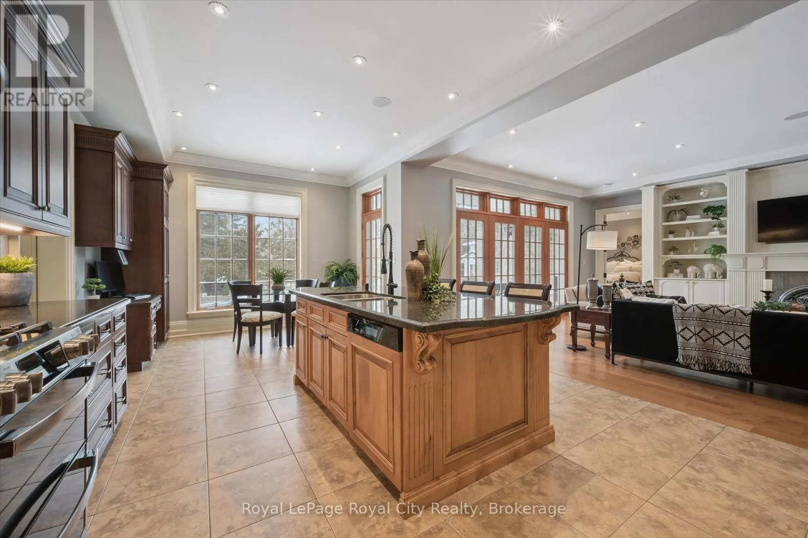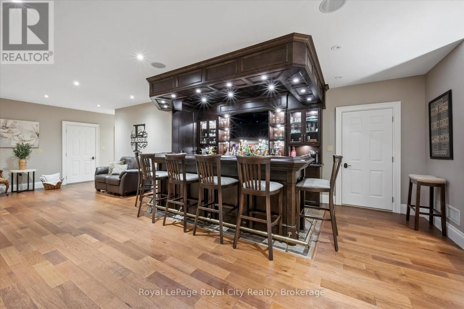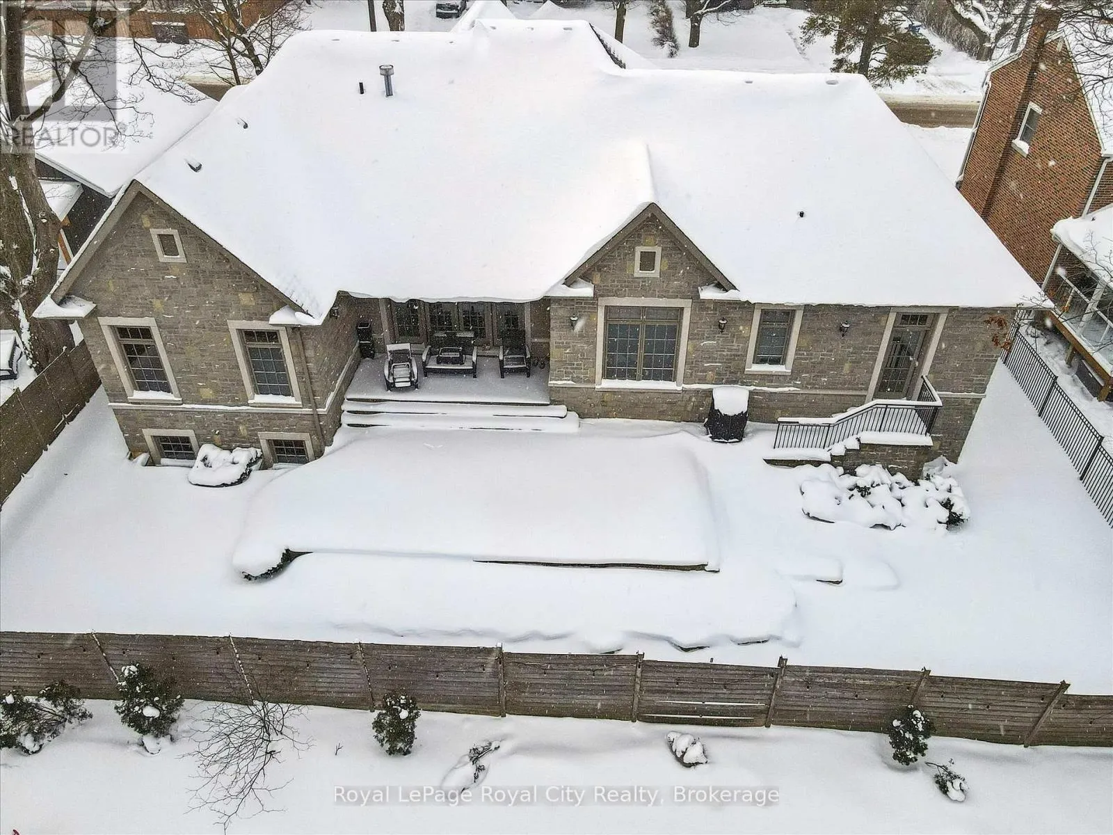 Between Winston Cres. and Palmer St. Rarely does a home offer both striking curb appeal and an exceptional location, and this one delivers on every front. Situated in one of Guelph's most desirable family neighbourhoods, steps to St. George's Park, this custom-built residence stands apart for its craftsmanship, thoughtful design, and timeless finishes. From the moment you arrive, the quality is unmistakable. The exterior is finished in Arriscraft Citadel stone, with limestone sills, arches, lintels, and door surrounds. Inside, 10' ceilings throughout the main floor, oversized crown moulding and baseboards, solid 8' interior doors, and a dramatic barrel-vaulted front entry set the tone. The open-concept kitchen is the heart of the home, featuring a large centre island, integrated office nook, and custom Barzotti cabinetry carried through to the bathrooms. The adjoining family room features built-in custom cabinetry, a gas fireplace, and floor-to-ceiling windows overlooking the rear patio, creating a seamless indoor-outdoor connection. The primary bedroom offers a luxurious retreat with a walk-in closet and a stunning 5-piece ensuite featuring a glass shower and a soaker tub. Two additional bedrooms, a 4-piece bathroom, main-floor laundry, and a convenient powder room complete this level. In-floor heating provides exceptional comfort throughout both the main floor and basement, as well as the concrete flooring in the garage. The lower level, alternatively accessed by a separate staircase from the garage, is extraordinarily spacious due to 9' foundation walls, no bulkheads, and clear spans with no support columns. This level includes an additional bedroom, an office, a full bathroom, an incredible bar area, and a home theatre with surround sound, ideal for entertaining or enjoying your favourite sporting events. Don't miss this rare opportunity to own a meticulously constructed home in one of Guelph's most coveted locations, where exceptional craftsmanship and refined living come together seamlessly. (id:27476)